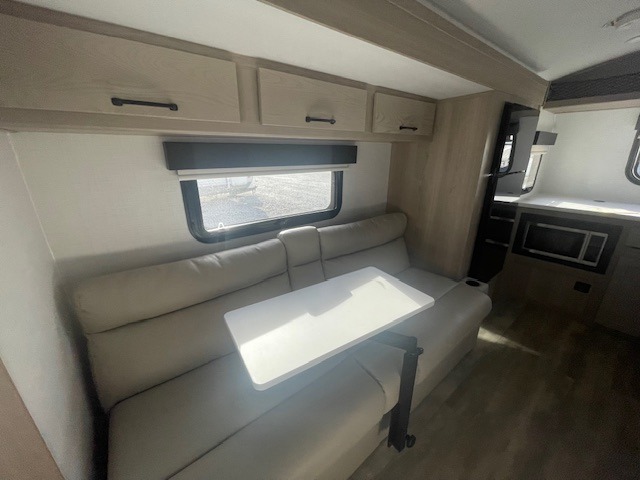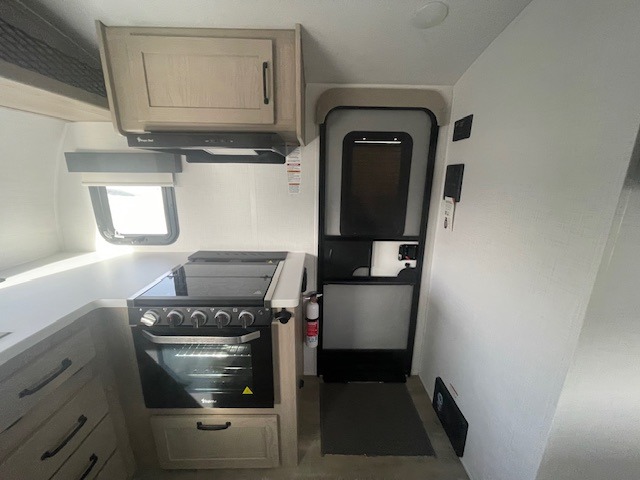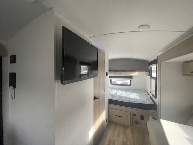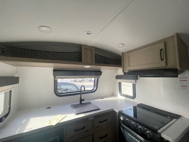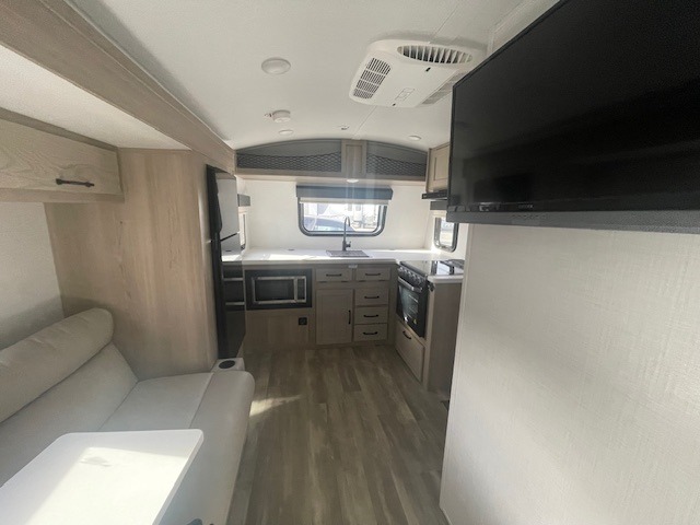 Are you looking for a lightweight trailer with at-home comforts? Take a look at this single slide out unit that can sleep three to four each night. There is a queen-size bed in the back with a 26" x 80" flip-up bunk for cozy sleeping space, a 72" sofa with cupholders to relax on, plus a 32" 12V TV for movie nights! The front kitchen includes a 12V refrigerator to store food, plus a microwave oven and a gas oven to cook meals each day.