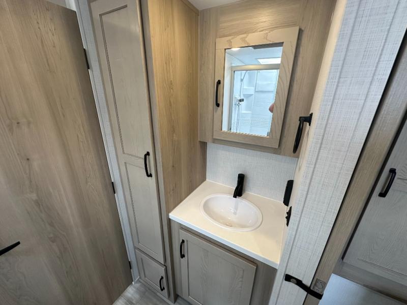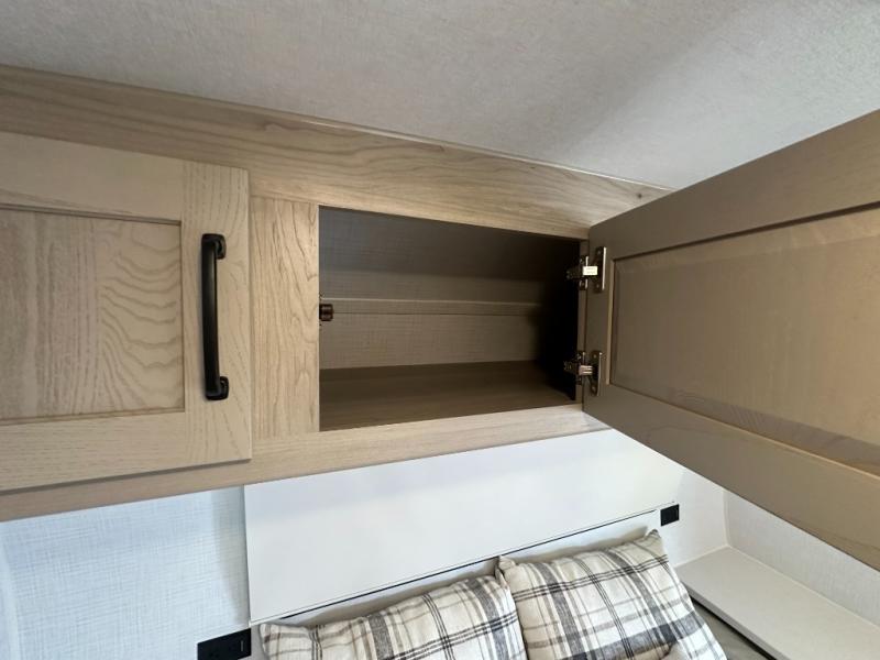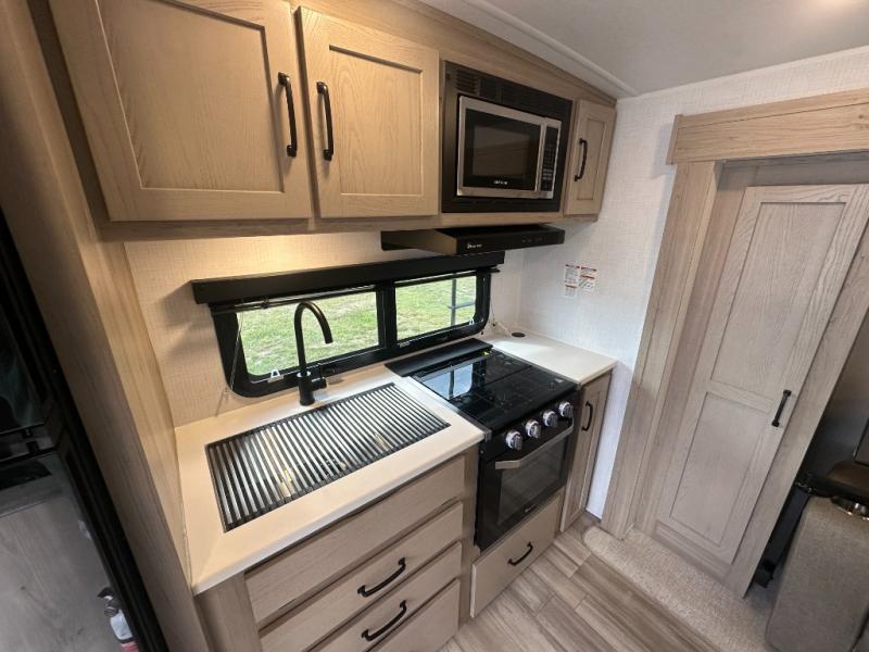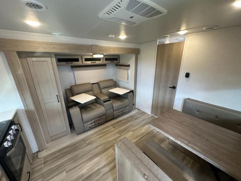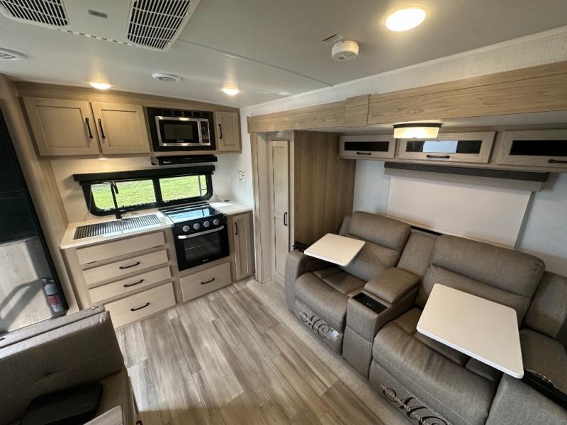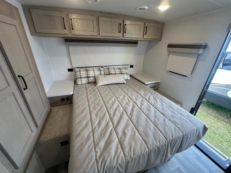 You and your spouse will have a great time camping in this travel trailer! You will have your own RV queen bed to sleep on in the front private bedroom, and an optional TV can be added if you enjoy the morning news in bed. Breakfast can be made on the three burner cooktop in the rear kitchen, or head outdoors to cook on the outside griddle. The 67" theater seating with cupholders will provide a place to relax and dine together, and the spacious walk-through bath will allow you to clean up before you head out for the day. This model includes plenty of storage space, including a pantry for your snacks, a wardrobe slide out in the bedroom, plus a drop-frame pass-through storage for larger camp gear!