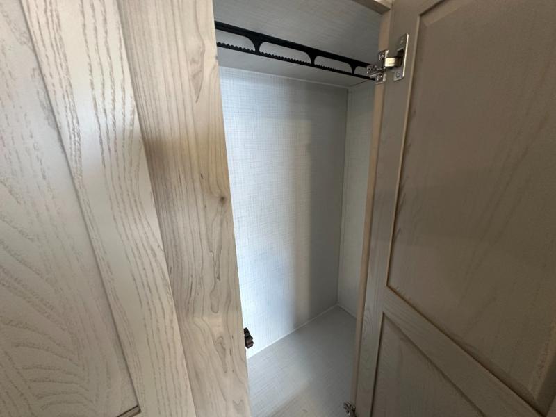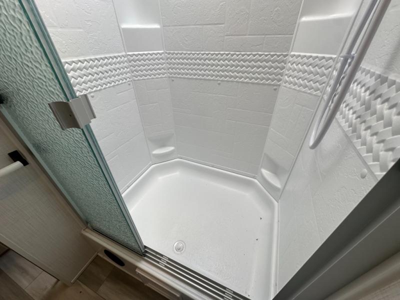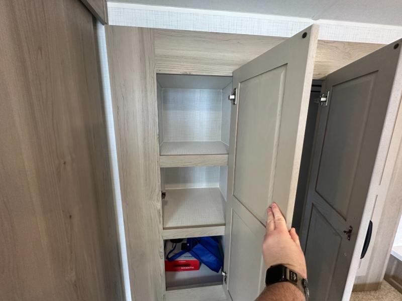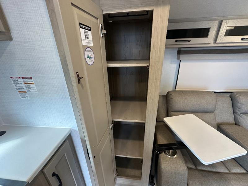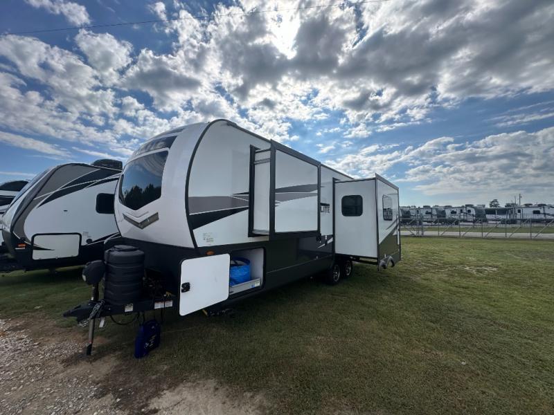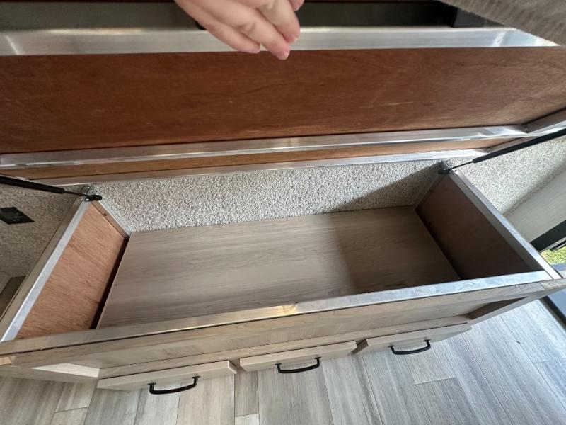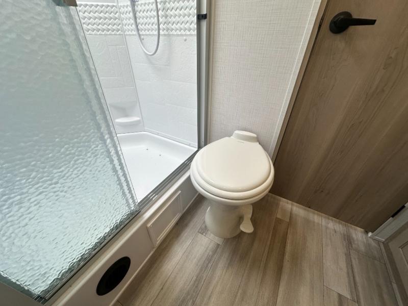 You and your spouse will have a great time camping in this travel trailer! You will have your own RV queen bed to sleep on in the front private bedroom, and an optional TV can be added if you enjoy the morning news in bed. Breakfast can be made on the three burner cooktop in the rear kitchen, or head outdoors to cook on the outside griddle. The 67" theater seating with cupholders will provide a place to relax and dine together, and the spacious walk-through bath will allow you to clean up before you head out for the day. This model includes plenty of storage space, including a pantry for your snacks, a wardrobe slide out in the bedroom, plus a drop-frame pass-through storage for larger camp gear!