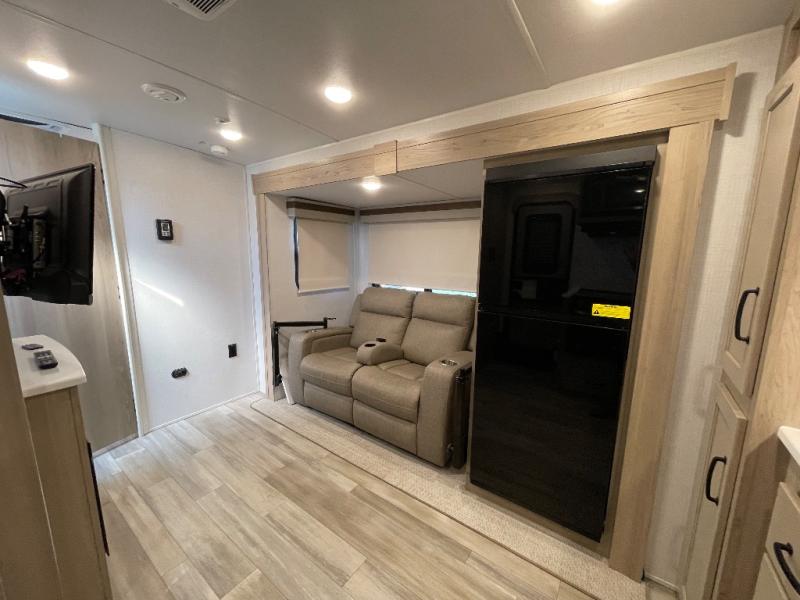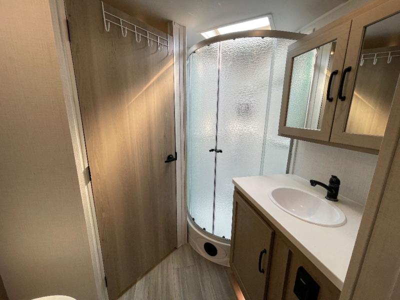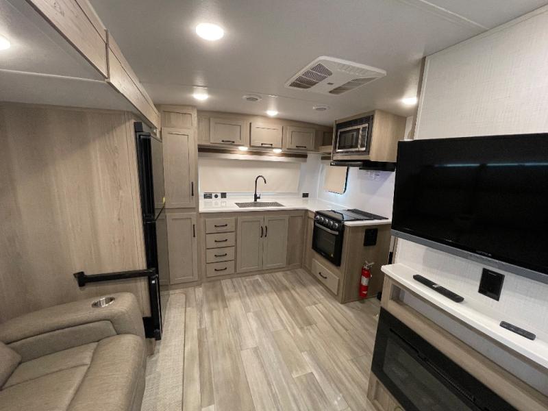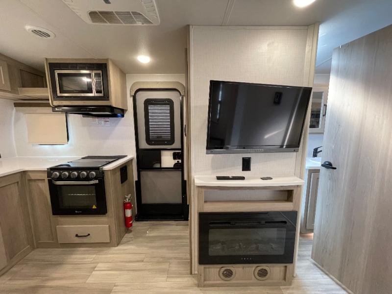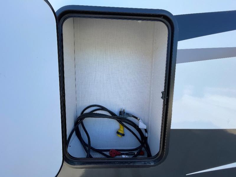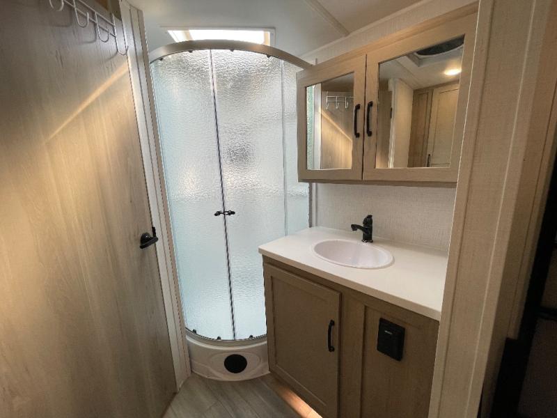 Escape the city life for weekend trips in this cozy couple's trailer. The dual entry doors will allow you to enter in through the rear private bedroom, or the front kitchen/main living area for convenience. You will enjoy relaxing on the theater seating across from the LED TV and fireplace in the evenings, or you can visit outdoors under the 19' power awning. You'll also find an exterior griddle here for quick meals and exterior storage for the fishing poles or hiking gear. This model also includes a walk-through bath with a shower skylight, a linen closet, plus a Showermiser Water Saving System. And don't worry about storage space inside since this model includes an entryway pantry/closet, a second pantry in the front kitchen, plus a large bedroom wardrobe to keep your clothes wrinkle-free!