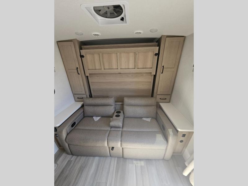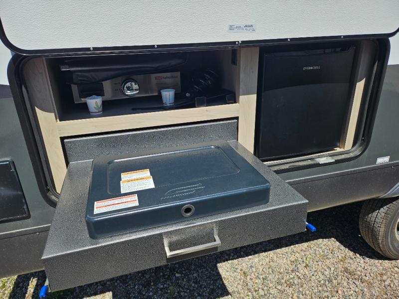 This is the perfect travel trailer for two or four people looking for comfortable and versatile camping trips! You will have your own Murphy bed to sleep on in the front at night, and during the daytime you can fold it up and have a 74" sofa in its place. No need to even make the bed! Breakfast can be made on the three burner cooktop inside, or head outdoors to cook on the outside griddle and pull-out stove under the 18' awning. The u-dinette offers ample room for everyone to gather for a meal or games, and can be transformed into sleeping space as well. This space could also feature an optional theater seat with a table or a hide-a-bed with table if you would prefer to replace the u-dinette. The kitchen features a refrigerator within the large slide as well as a microwave above the stove, plenty of counter space and overhead cabinets, plus the outside griddle and pull-out stove provide you plenty of options when it comes to preparing meals. On the exterior, you will find two storage compartments and a rear ladder for your convenience, plus more.