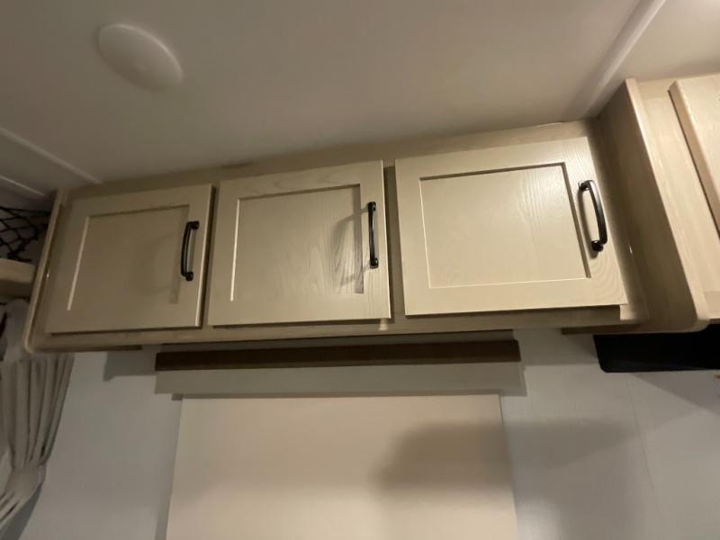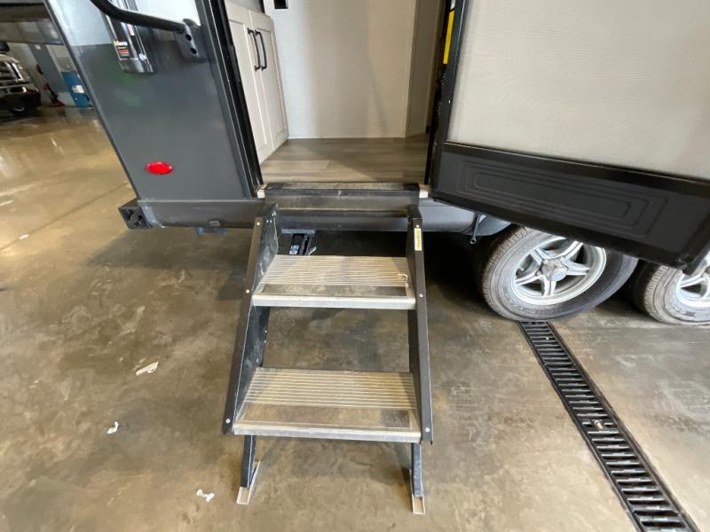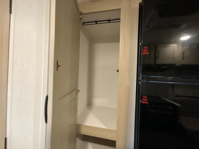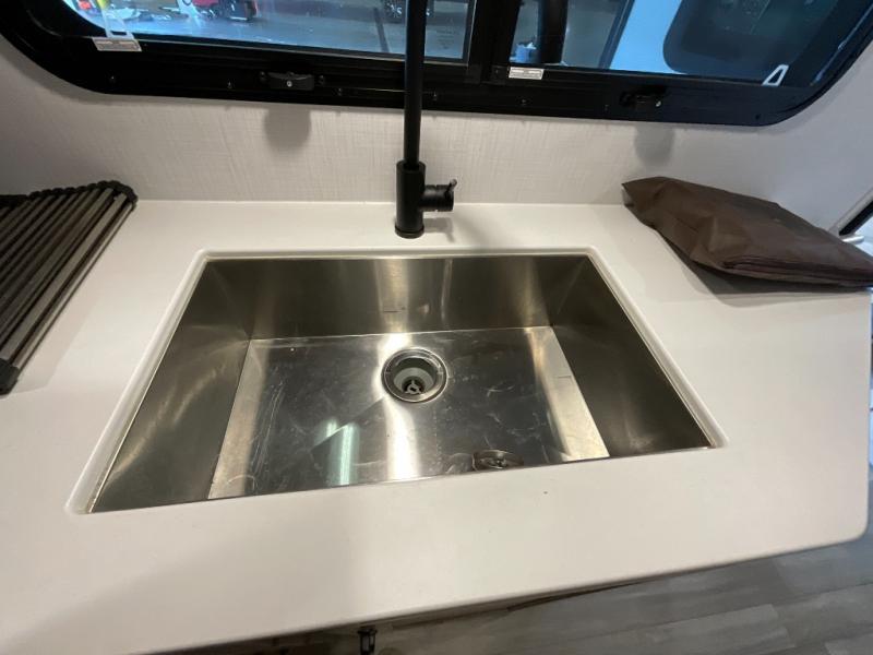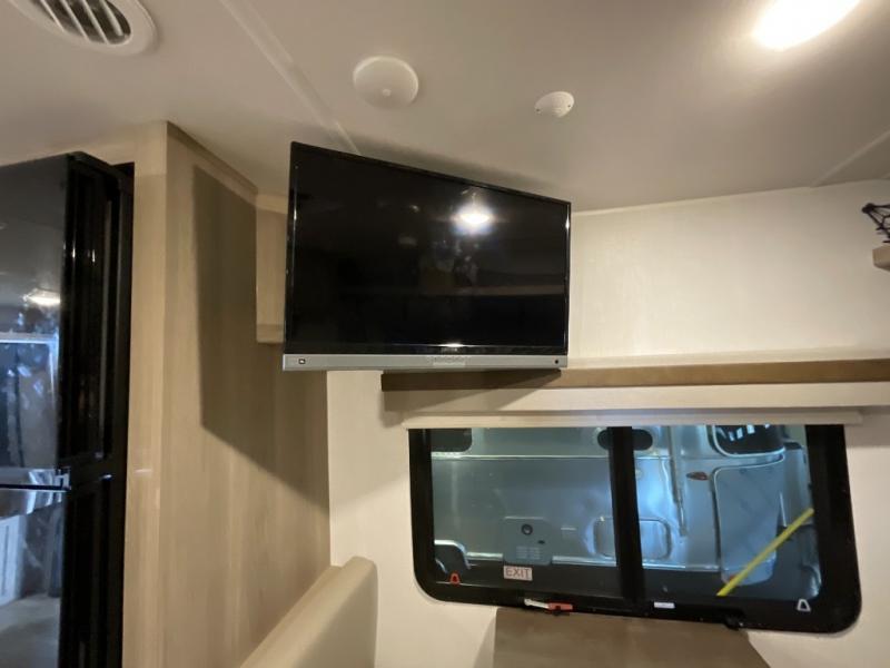 One of the biggest advantages of the Rockwood Roo M-19 is its lightweight design, making it towable by many midsize SUVs and half-ton trucks while still delivering the interior space that traditional hard-sided trailers can’t match. The exterior features a power awning, outdoor speakers, solid-step entry, and pass-through storage, giving you convenience and comfort at the campsite.