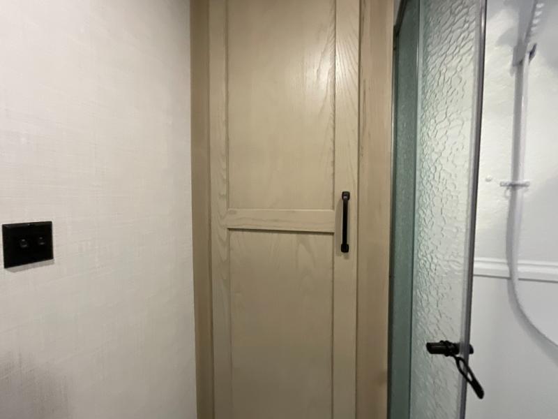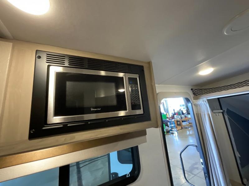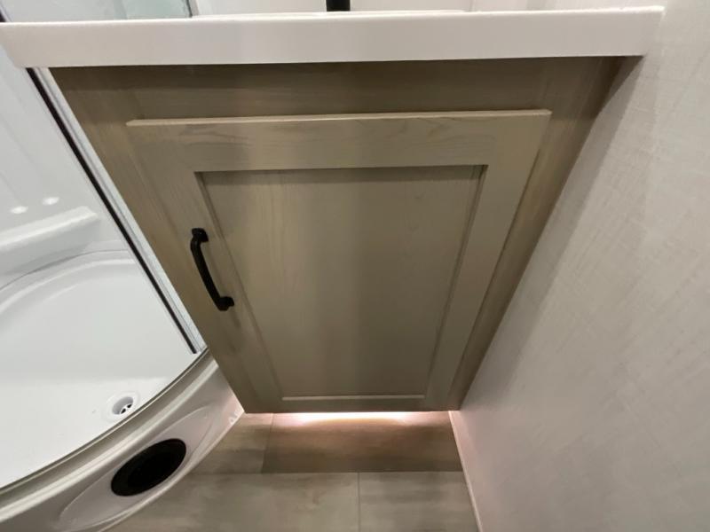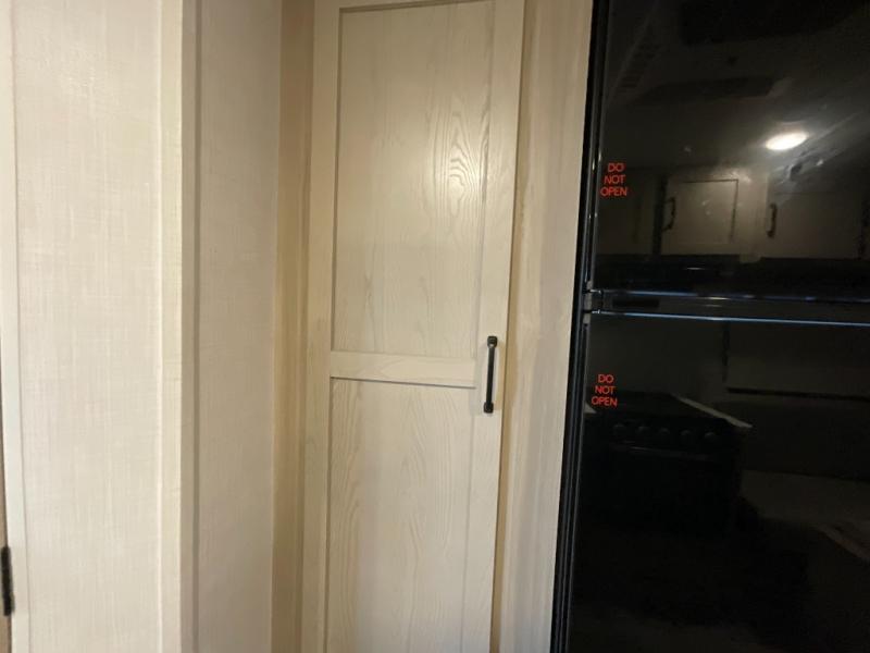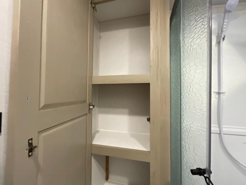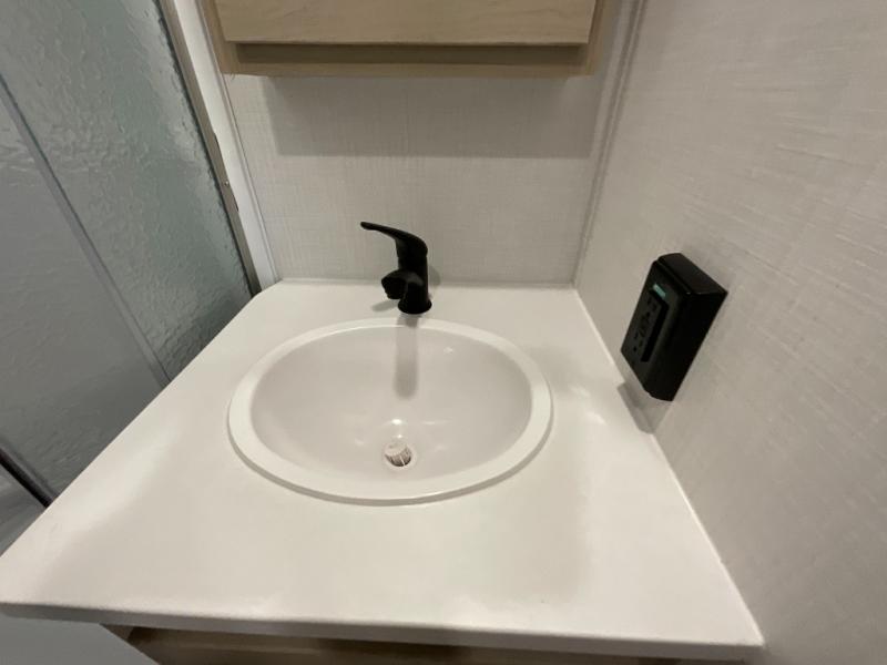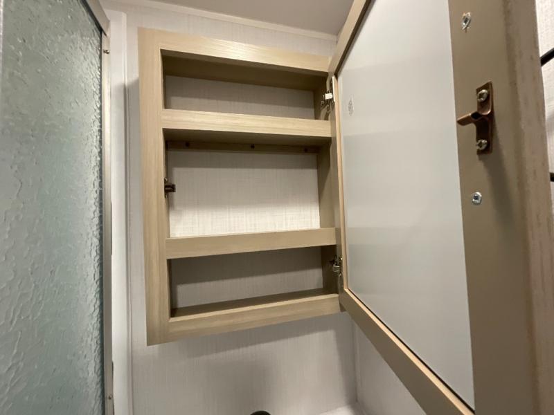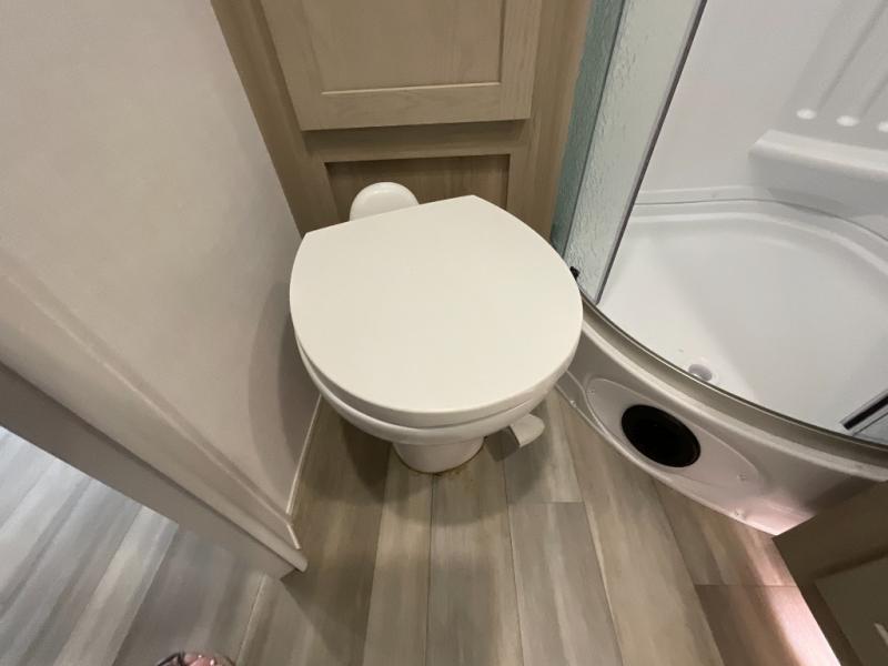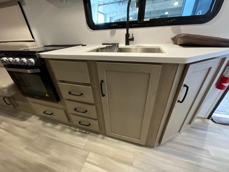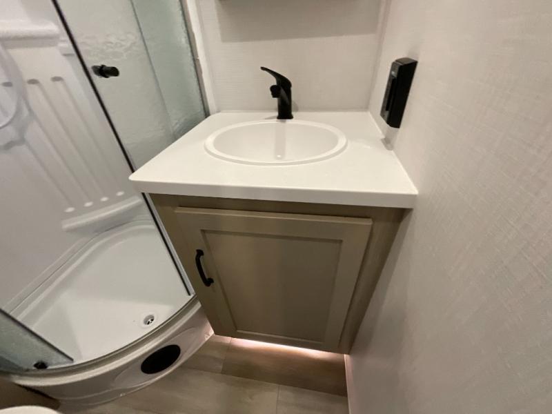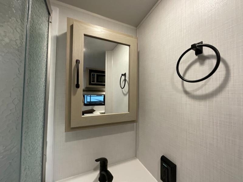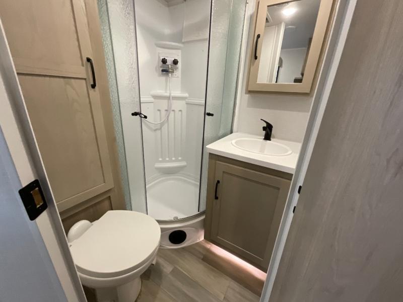 The kitchen is fully equipped for real meals on the road, offering a full-size refrigerator, microwave, cooktop, and ample storage space for ingredients and cookware. The booth dinette and sofa offer the perfect spots to gather, unwind, or enjoy a family game night. When it’s time to get clean after a day outdoors, the full bathroom provides a roomy shower, foot-flush toilet, and additional storage options to keep your essentials organized.