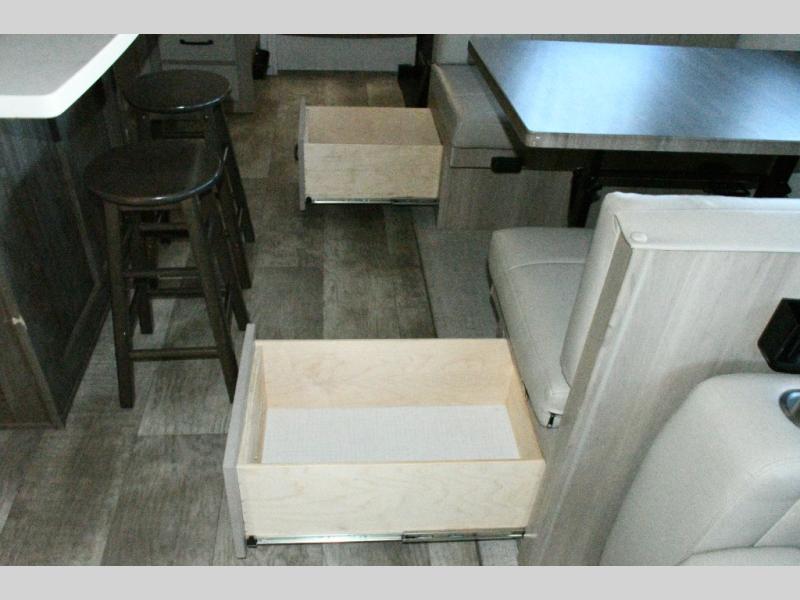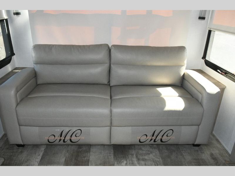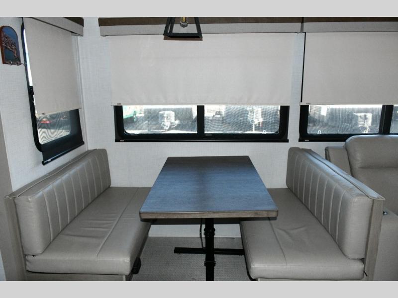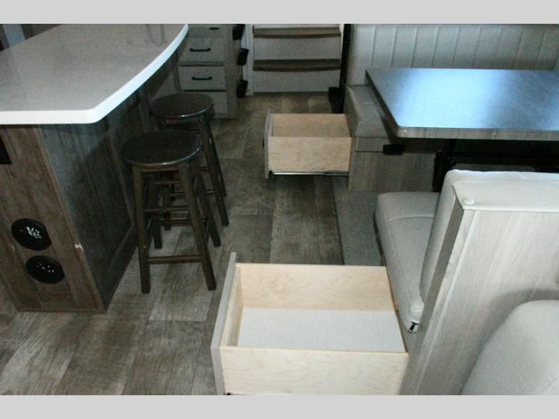 Guests can gather on the hide-a-bed sofa, theater seating, or booth dinette, while the kitchen island with stools keeps everyone connected.