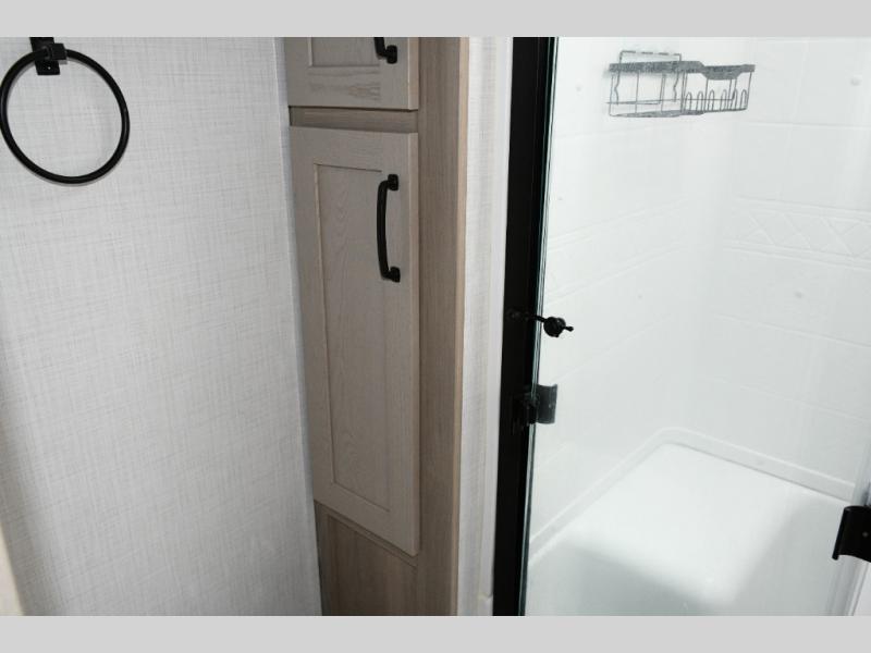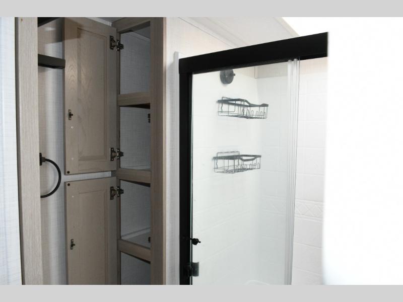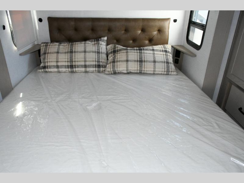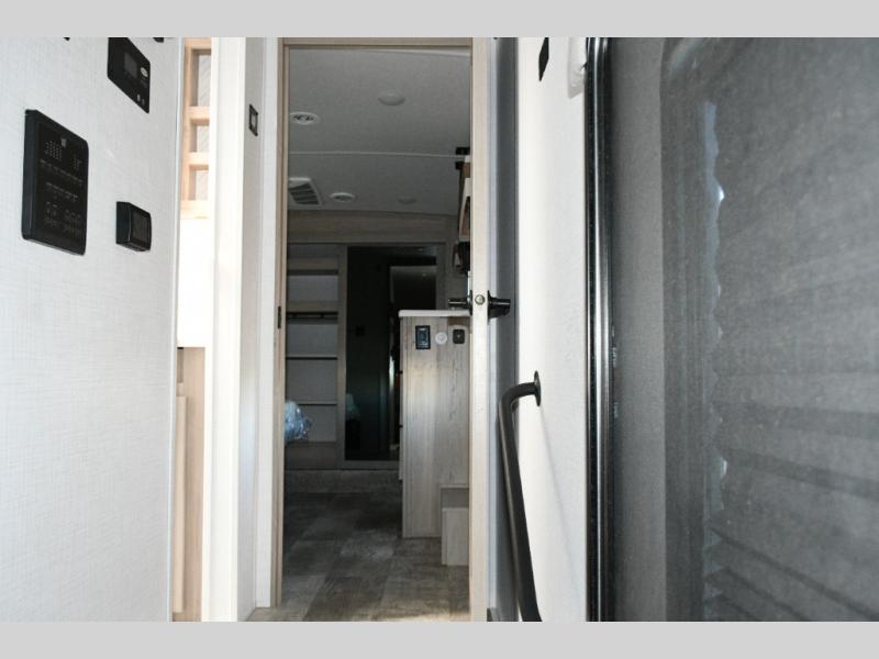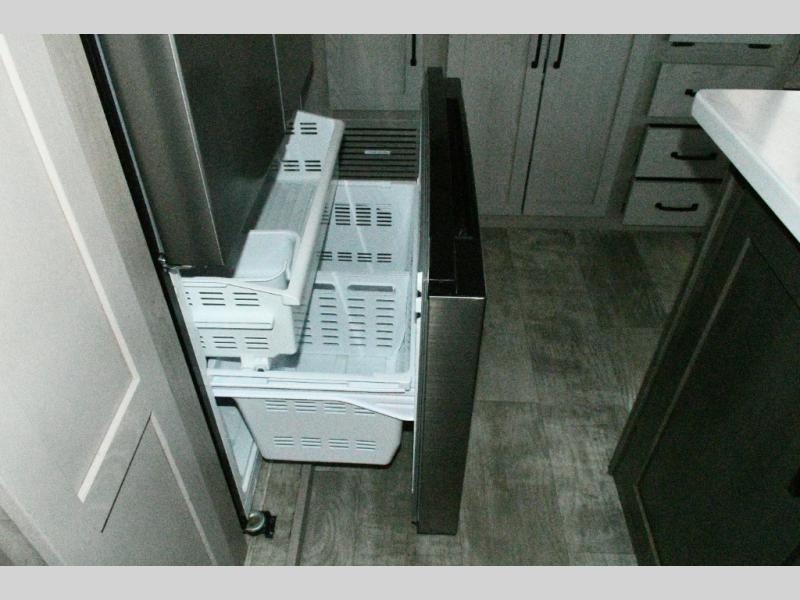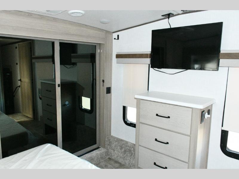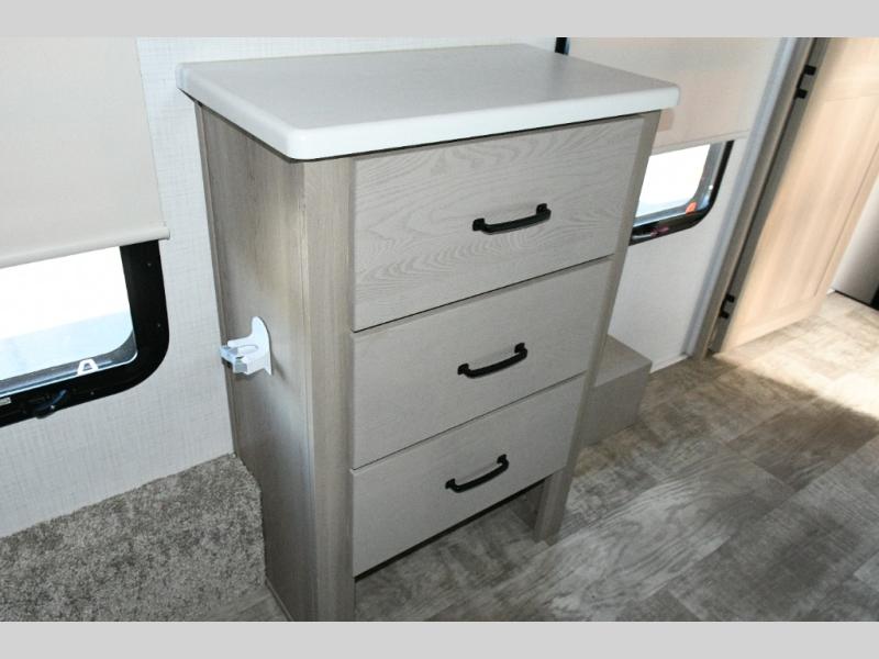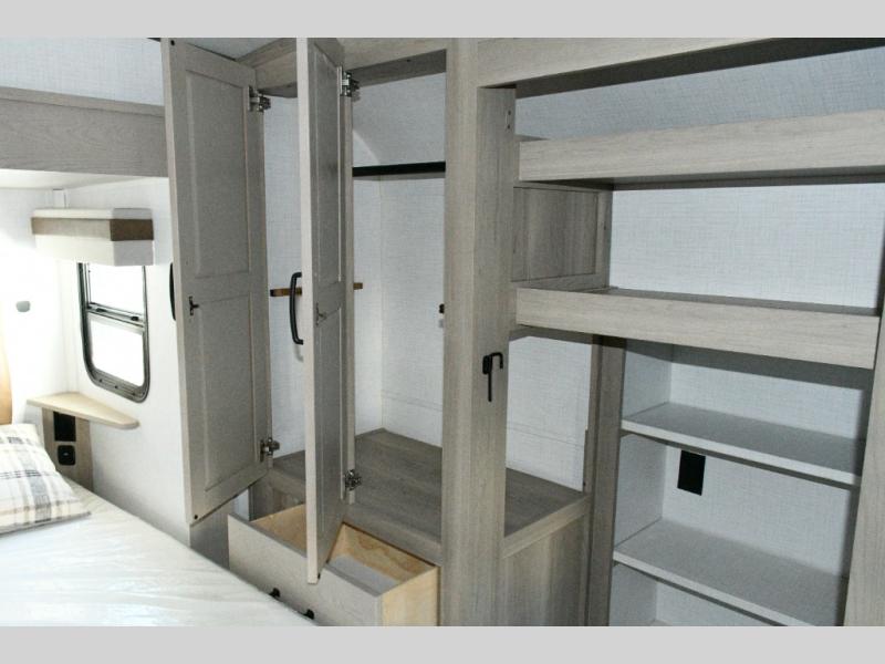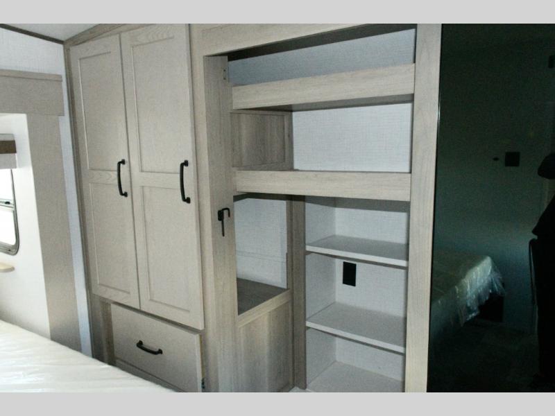 Up front, the private bedroom offers a peaceful escape with a queen bed slide, front wardrobe, shirt closet, and washer/dryer prep for added long-term convenience. This layout balances luxury, storage, and livability, making it ideal for travelers who want comfort without compromise.