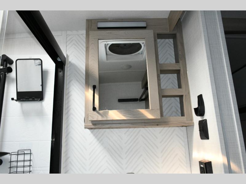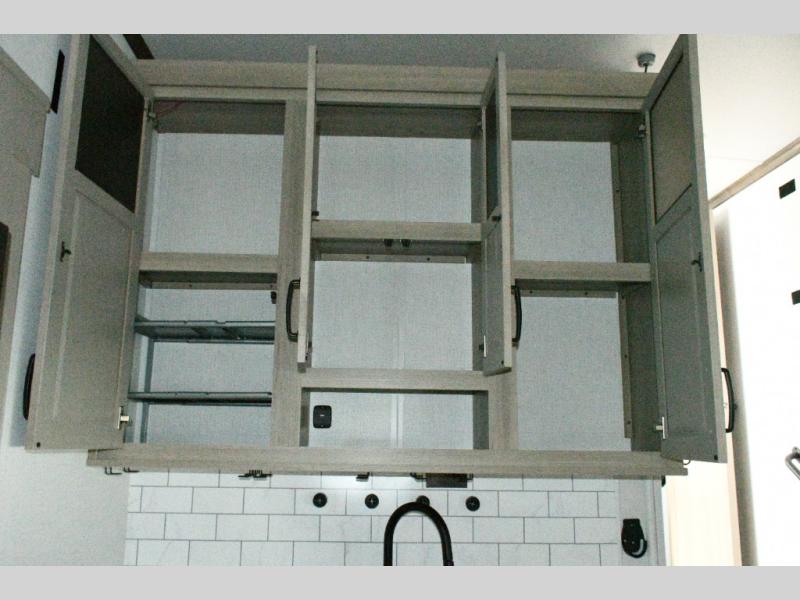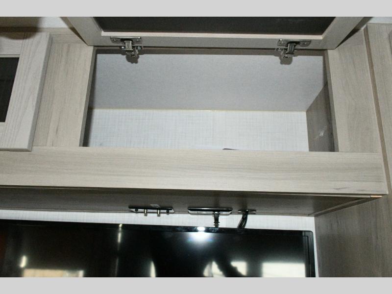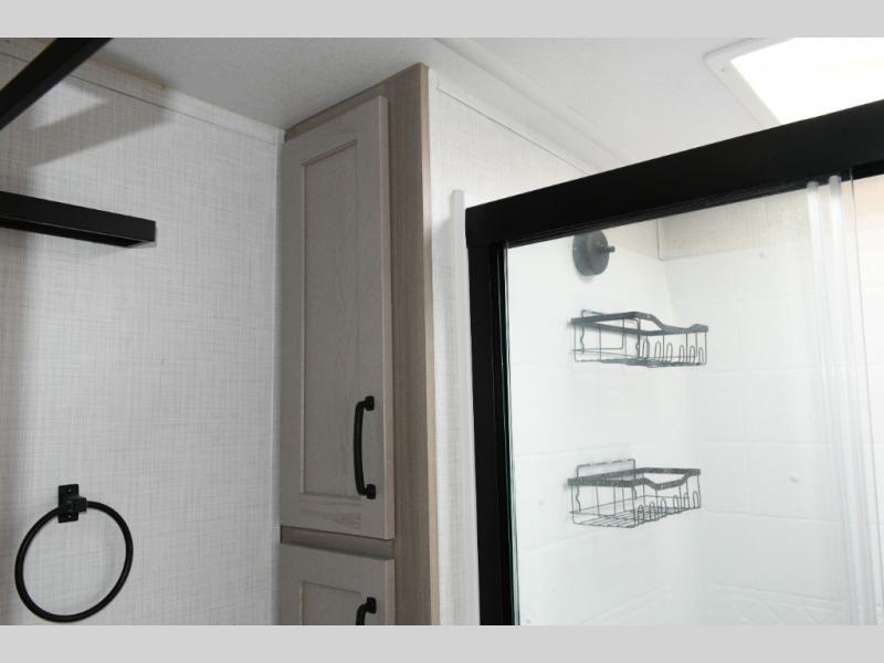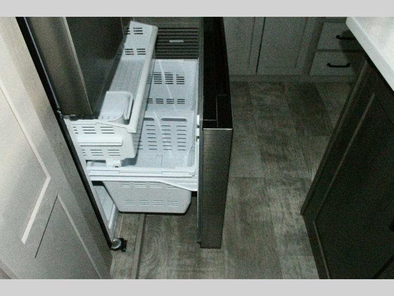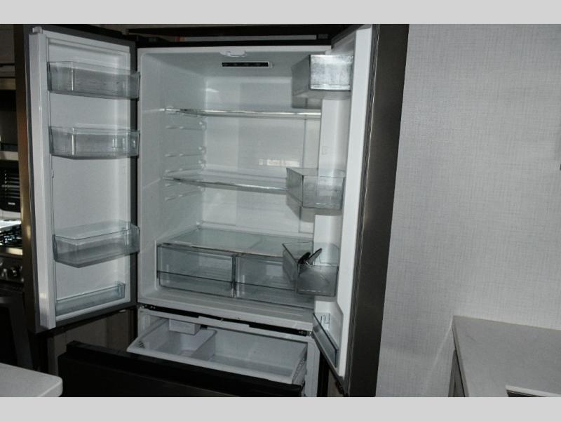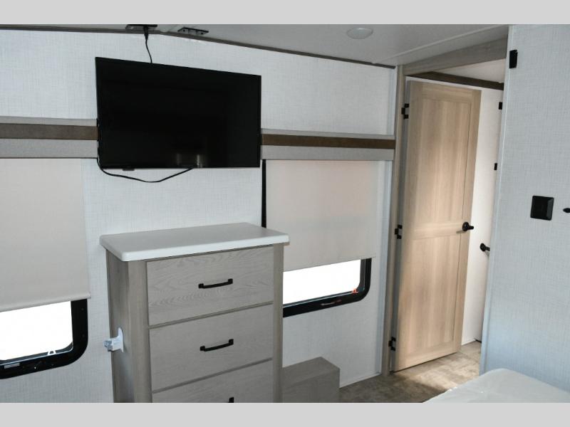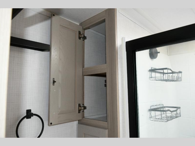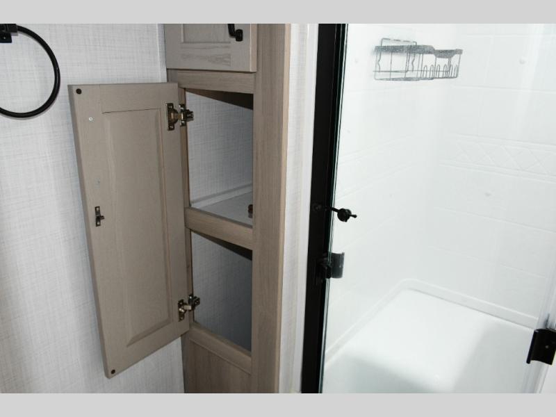 Up front, the private bedroom offers a peaceful escape with a queen bed slide, front wardrobe, shirt closet, and washer/dryer prep for added long-term convenience. This layout balances luxury, storage, and livability, making it ideal for travelers who want comfort without compromise.