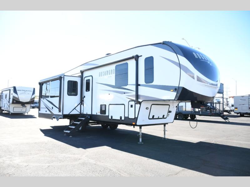 Settle in and stretch out with this 2024 Rockwood Signature 361RL, a fifth wheel designed for extended stays, seasonal camping, or comfortable full-time living. Once you’re parked at the campground, the rear living layout surrounds you with oversized windows, allowing natural light and scenic views to fill the space. Three slide-outs expand the interior, creating a wide-open living and kitchen area that feels more like a residential retreat than an RV.