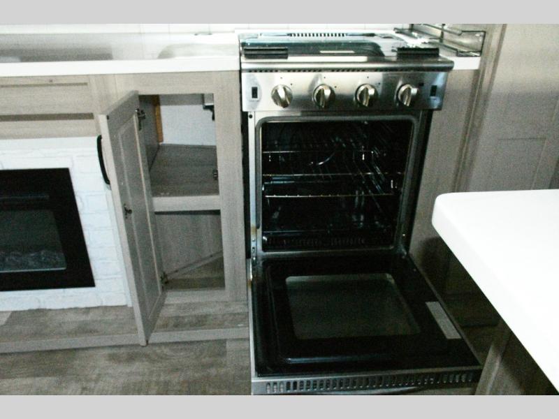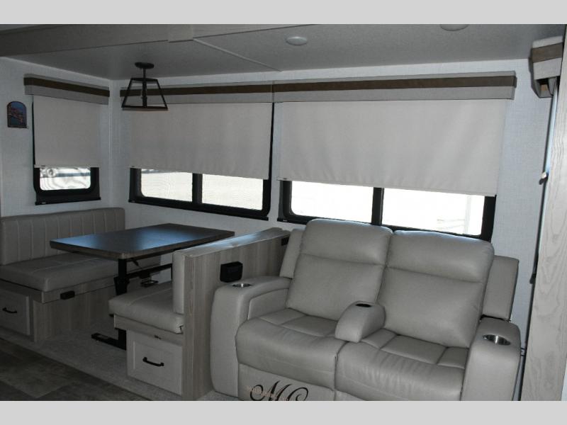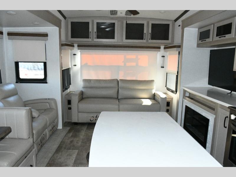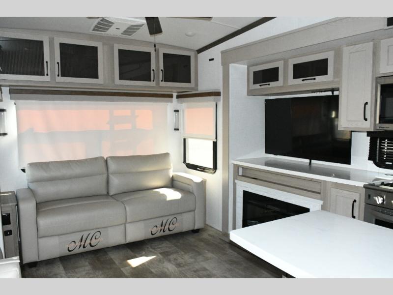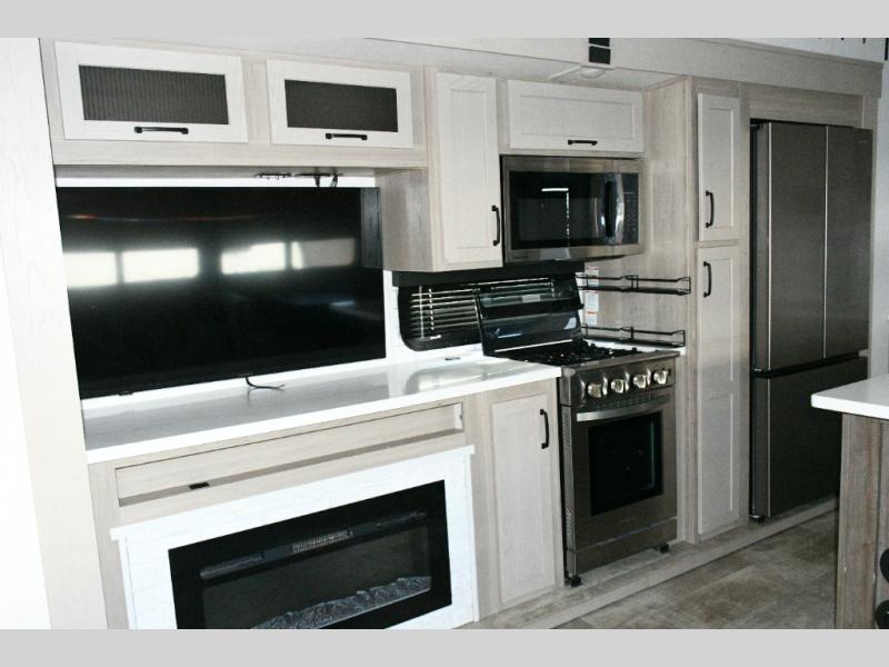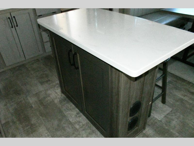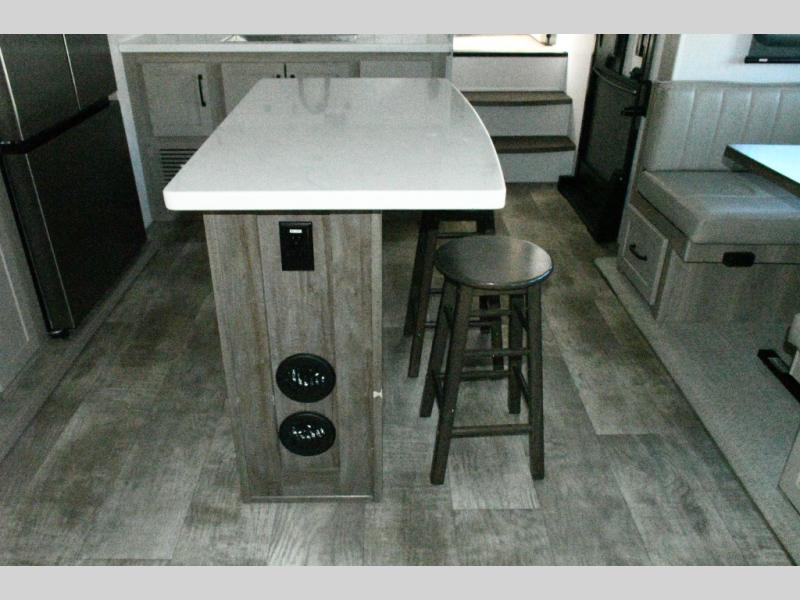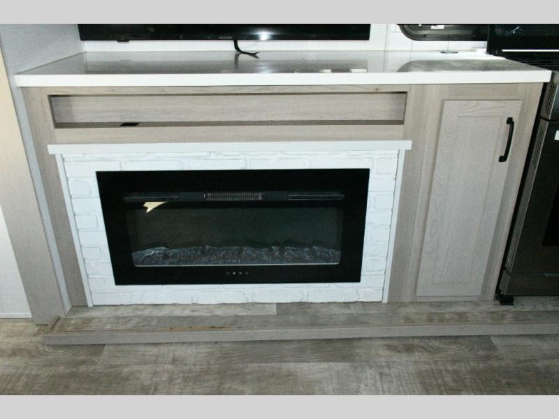 The rear living space is built for entertaining and relaxing. Guests can gather on the hide-a-bed sofa, theater seating, or booth dinette, while the kitchen island with stools keeps everyone connected. The residential refrigerator, generous pantry, and solid surface countertops make meal prep easy, whether you’re cooking for a crowd or enjoying a quiet night in. End the day with your favorite shows on the Smart TV or unwind by the fireplace after a long day of exploring.
