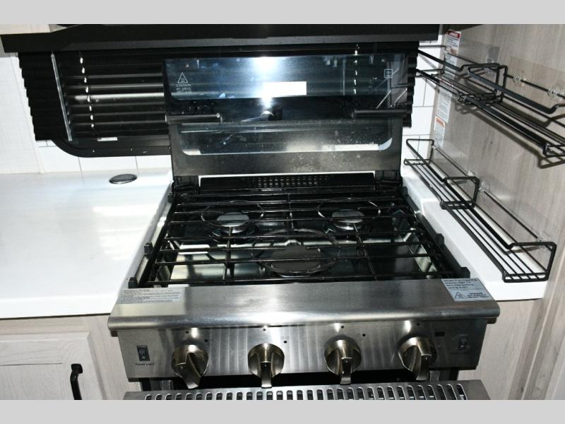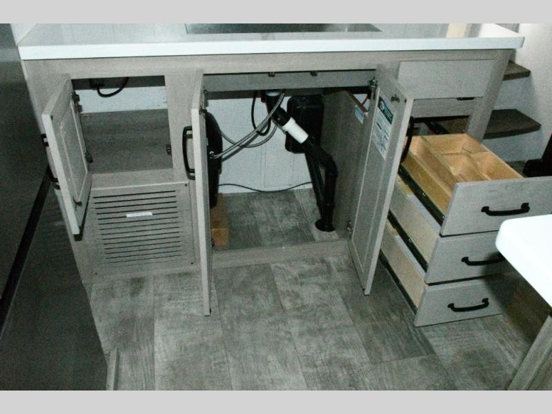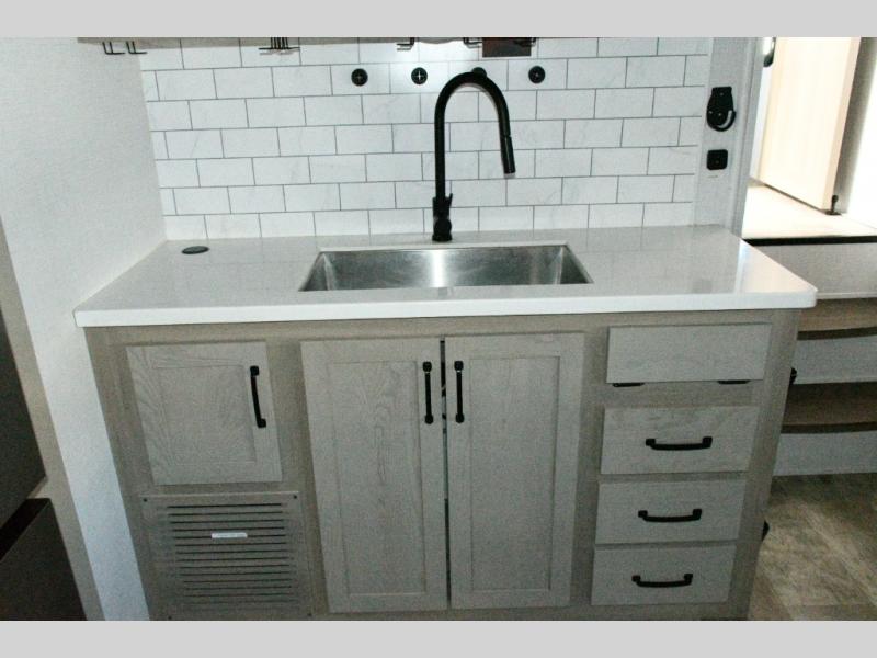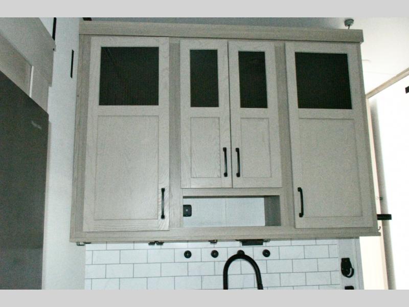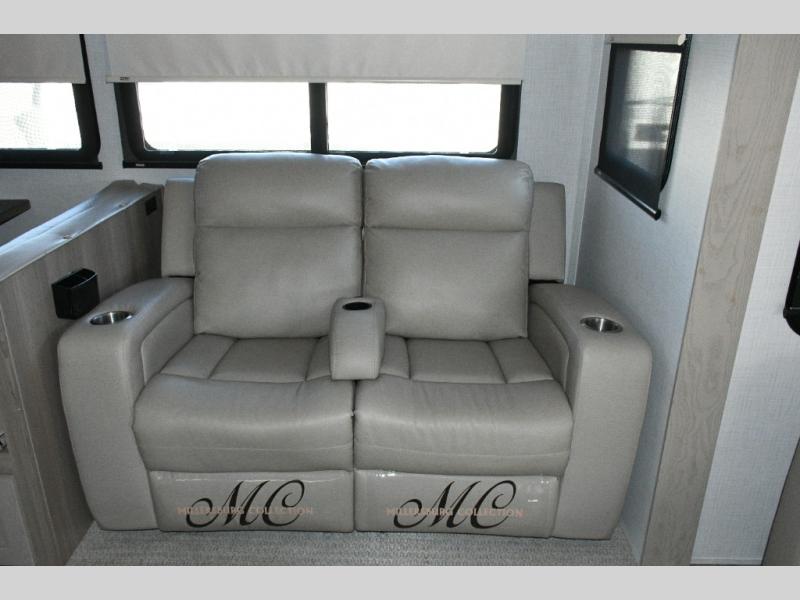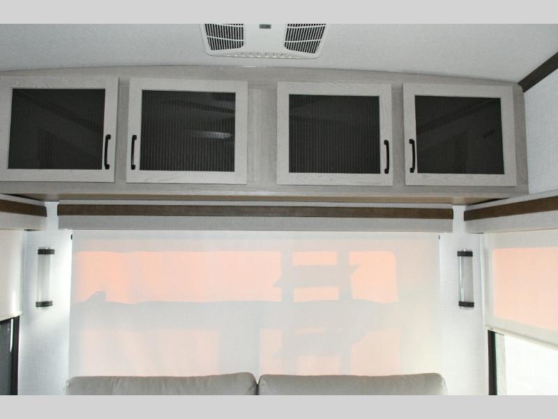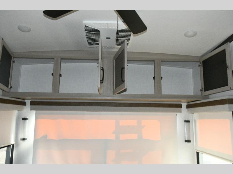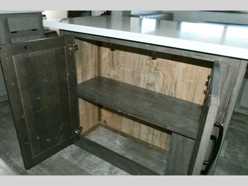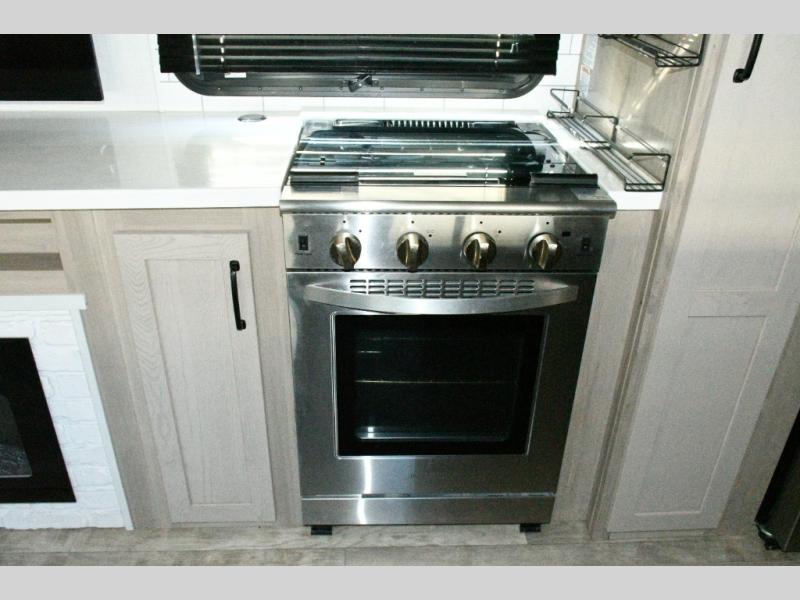 The rear living space is built for entertaining and relaxing. Guests can gather on the hide-a-bed sofa, theater seating, or booth dinette, while the kitchen island with stools keeps everyone connected. The residential refrigerator, generous pantry, and solid surface countertops make meal prep easy, whether you’re cooking for a crowd or enjoying a quiet night in. End the day with your favorite shows on the Smart TV or unwind by the fireplace after a long day of exploring.