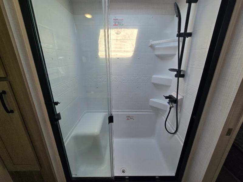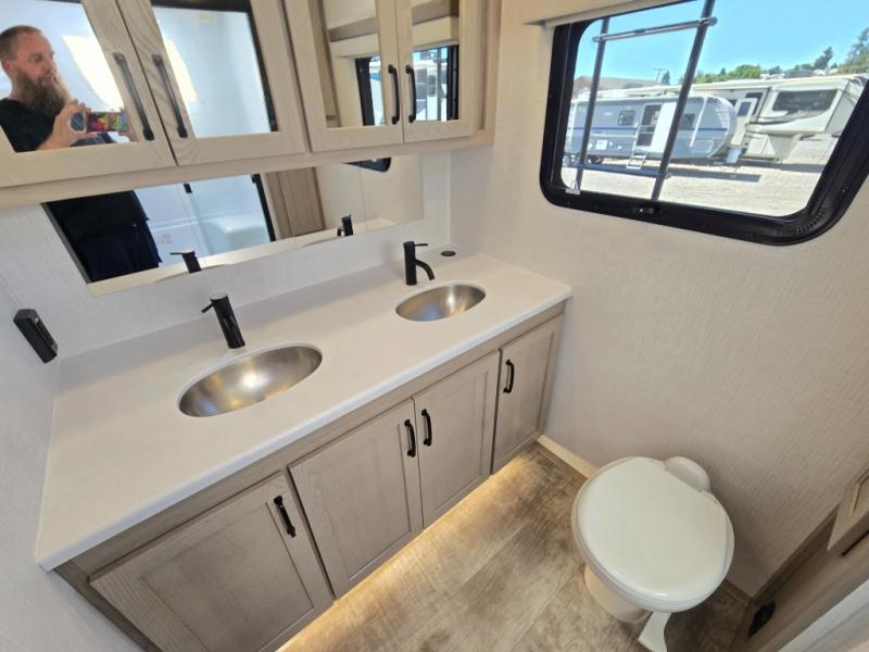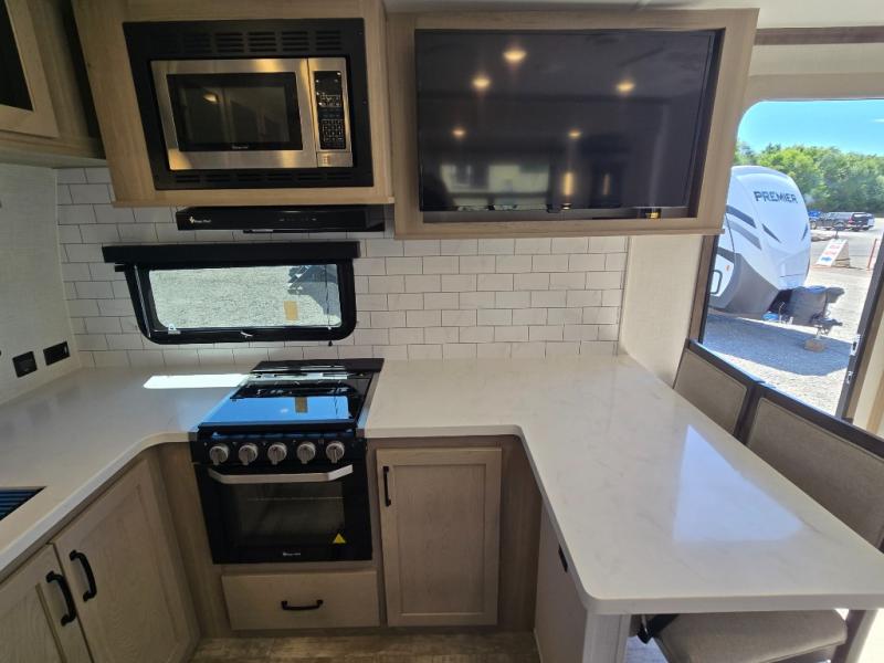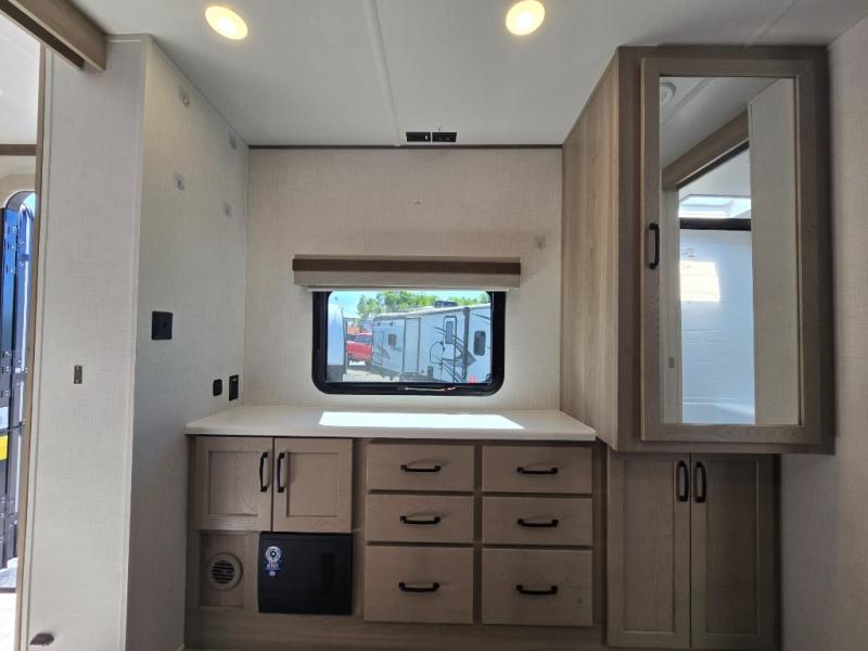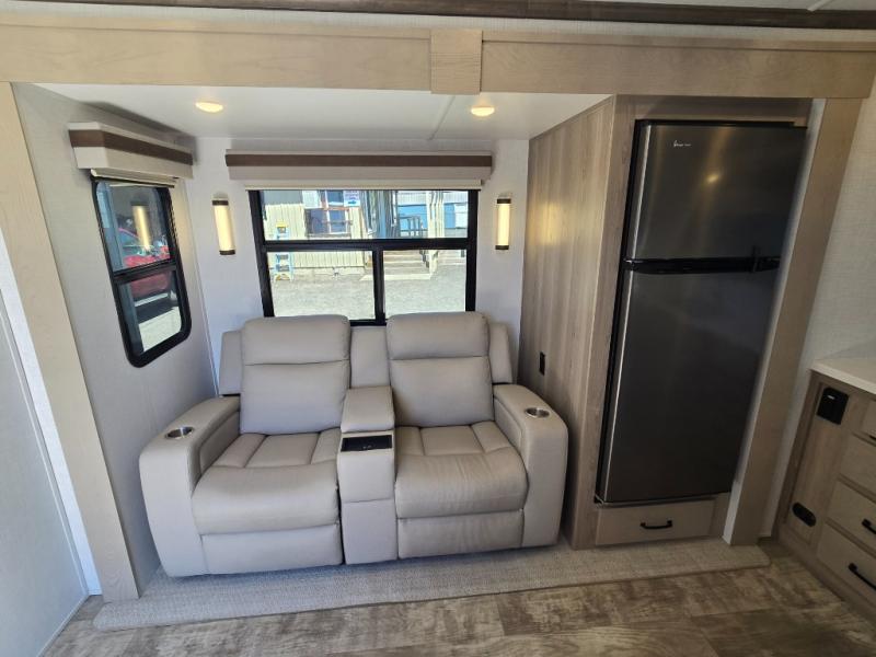 This front kitchen, couple's trailer is ready for adventure when you are! Once you arrive at your destination, prepare a quick lunch on the outside griddle, and enjoy the shade provided by the 19' power awning. You can eat outside, or inside at the counter with stools. The theatre seat will make this travel trailer feel more like home, and the double slides provide more space to stretch out. Within the master bedroom you'll find a king bed, a large wardrobe and a dresser, plus an optional TV. And check out the full rear bath with dual bath sinks and a shower with a seat! Now, that's what I call comfort!