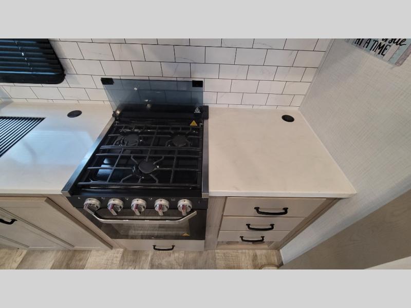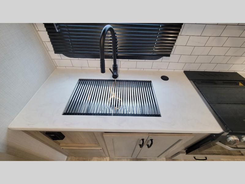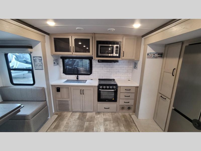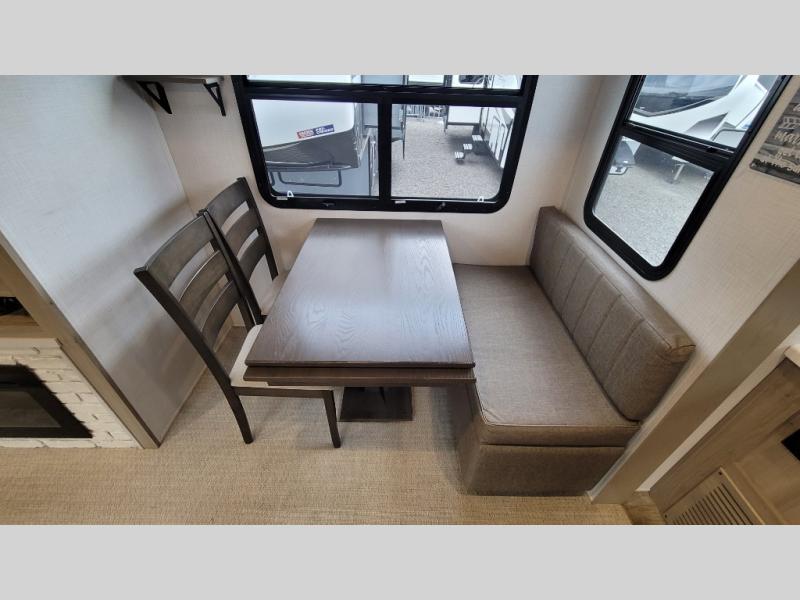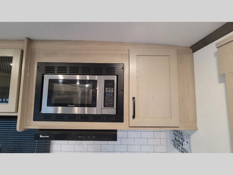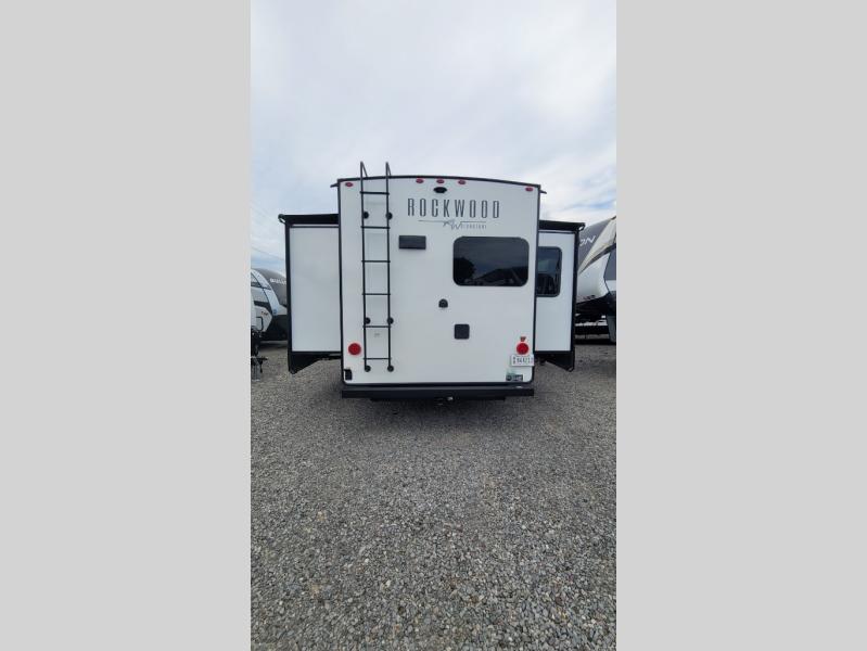 With any Rockwood Signature fifth wheel or travel trailer by Forest River RV, you will enjoy superior construction that includes laminated white fiberglass sidewalls, a radius roof with vaulted interior ceilings, plus radiant foil insulation and an enclosed underbelly for use in all types of weather. Some convenient exterior features include a power tongue jack, a torsion axle, Rubber-Ryde suspension, and a tire pressure monitor system with a monitor for added safety. The interior offers a One Touch OneControl panel with WeRV app control, for lights, awning, slides, water heater and more, and the Air 360+ omnidirectional antenna with WiFi prep lets you work while away from home if needed. You will also appreciate the interior vaulted ceilings, residential soft close doors and drawers, solid surface kitchen countertops, and designer kitchen backsplash!