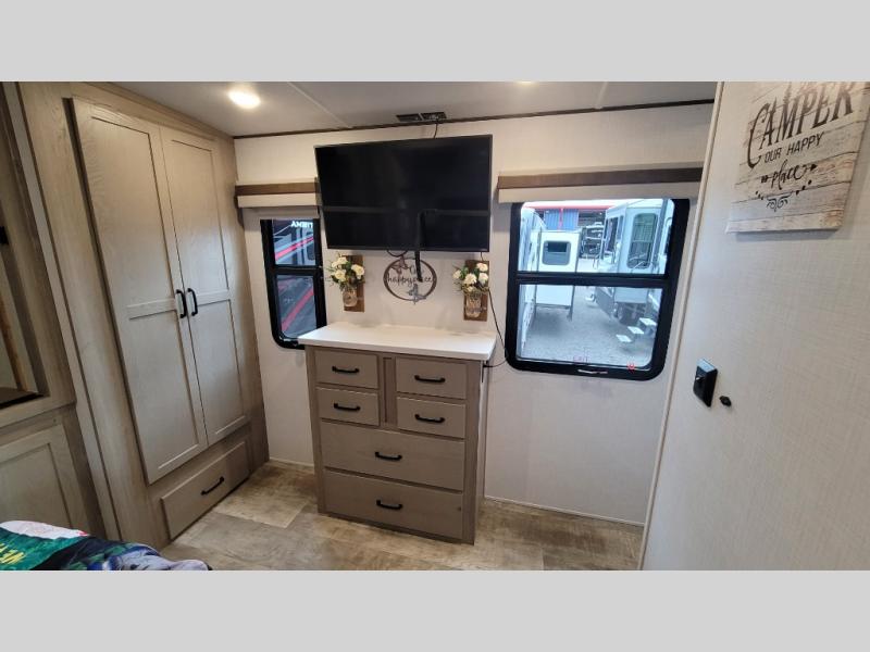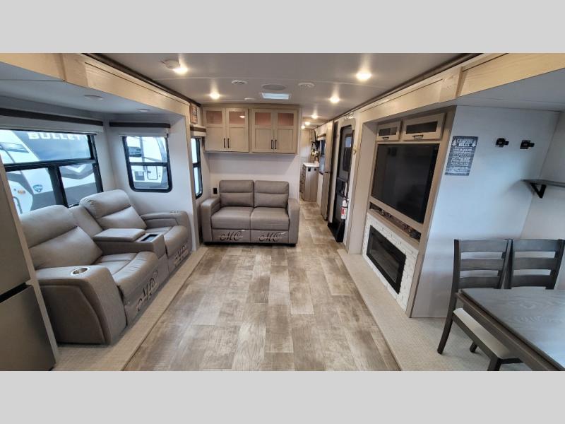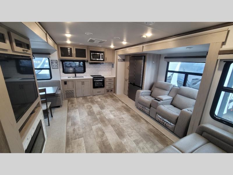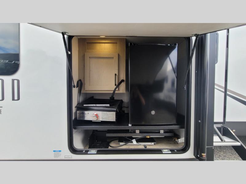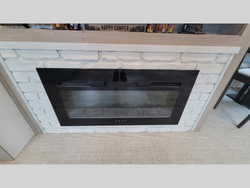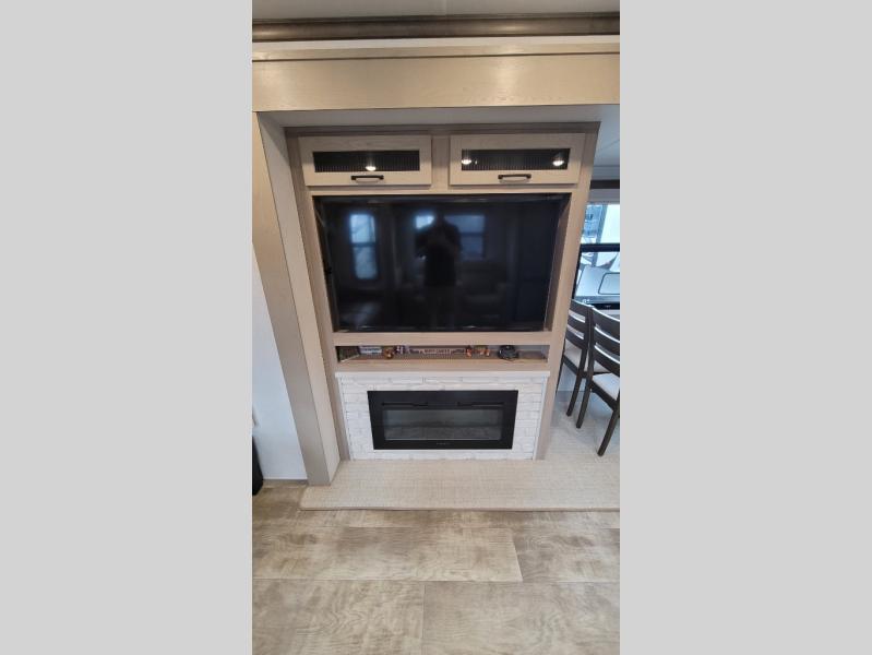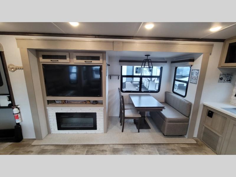 One step inside this rear kitchen travel trailer and you'll be sold! The dual opposing slides create an open floorplan you are sure to love, and you'll find plenty of seating spaces on the theater seat, the hide-a-bed sofa, and at the booth dinette. There is an entertainment center here with a Smart TV, plus a fireplace for those cooler nights. This model includes a convenient dual entry bath and a spacious front master bedroom that will have you feeling right at home. You can easily store your items in the large front wardrobe, plus there is a dresser and additional storage that features a space to add an optional washer and dryer. And check out the exterior with two power awnings, an outside kitchen, plus exterior storage for all your gear!