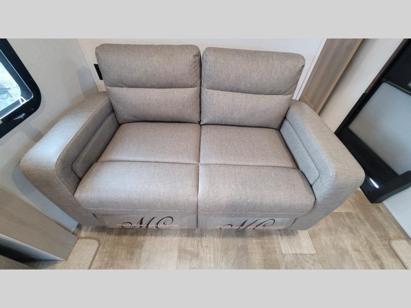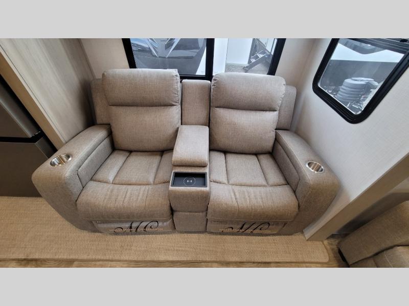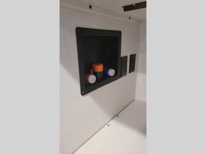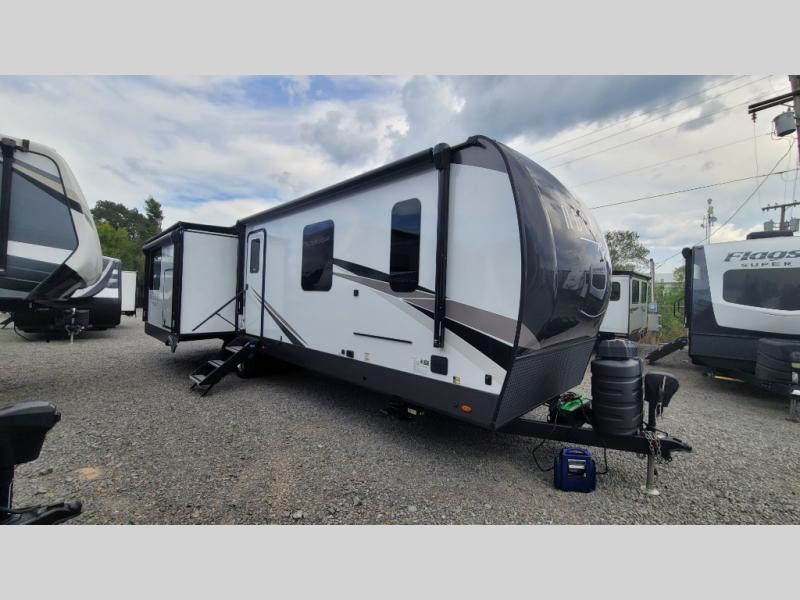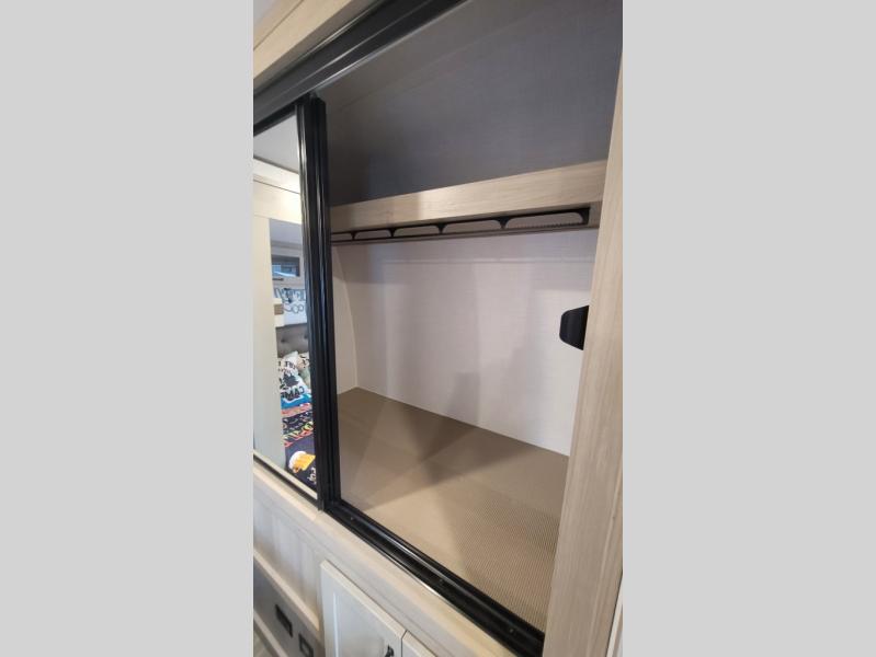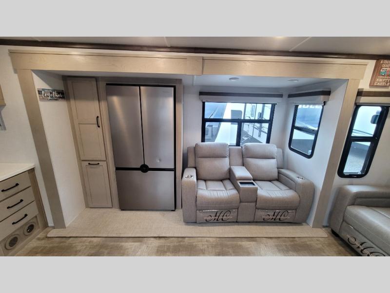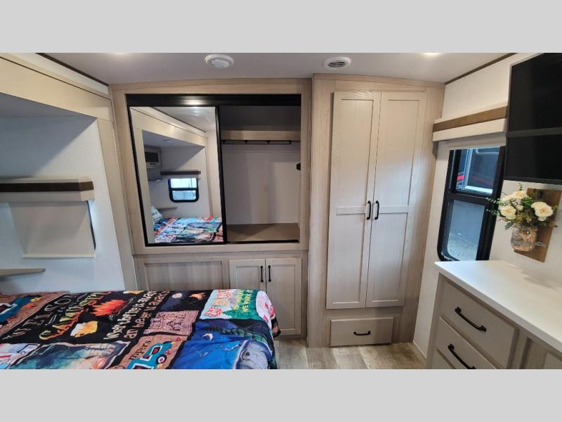 One step inside this rear kitchen travel trailer and you'll be sold! The dual opposing slides create an open floorplan you are sure to love, and you'll find plenty of seating spaces on the theater seat, the hide-a-bed sofa, and at the booth dinette. There is an entertainment center here with a Smart TV, plus a fireplace for those cooler nights. This model includes a convenient dual entry bath and a spacious front master bedroom that will have you feeling right at home. You can easily store your items in the large front wardrobe, plus there is a dresser and additional storage that features a space to add an optional washer and dryer. And check out the exterior with two power awnings, an outside kitchen, plus exterior storage for all your gear!