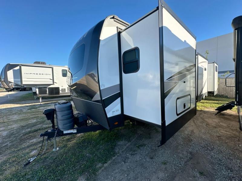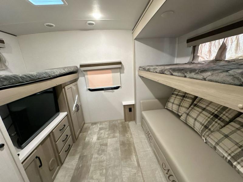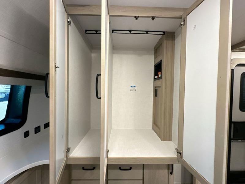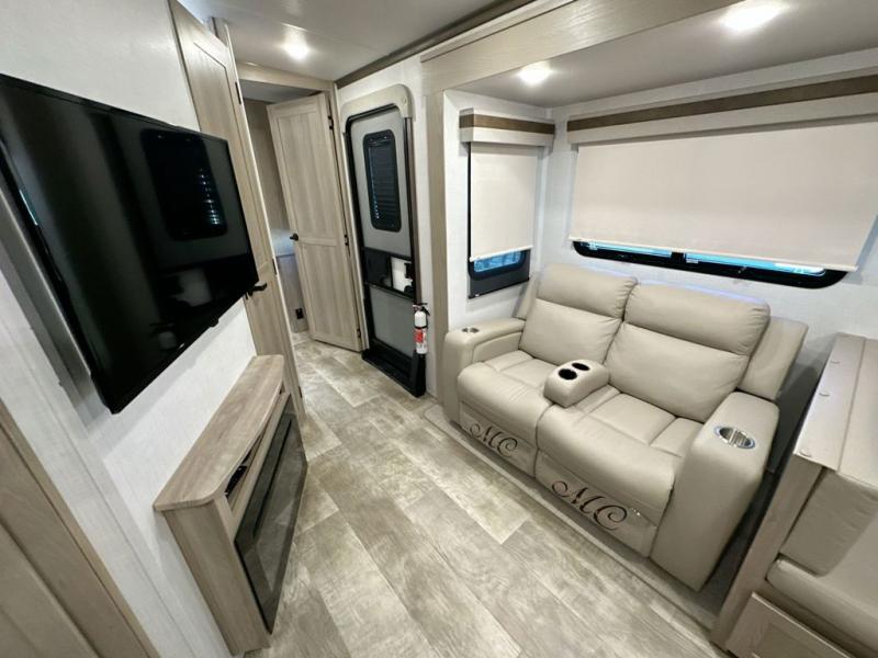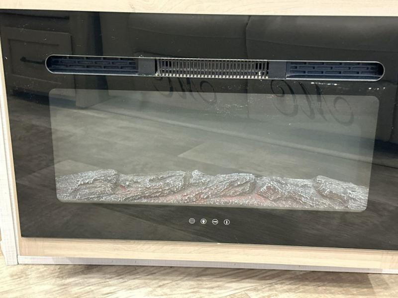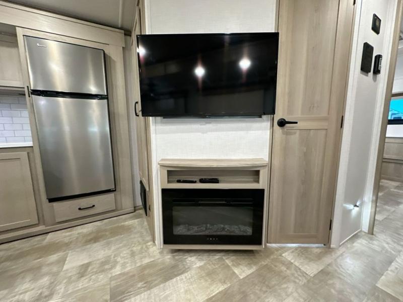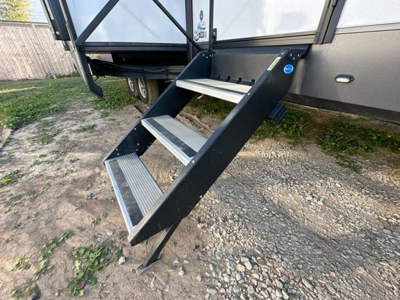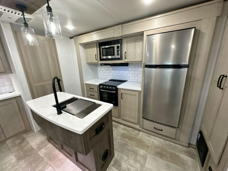 Family vacations and weekend excursions with friends just got sweeter with this travel trailer in tow. The rear private bunkhouse includes a slide out for more space, two bunks, a hide-a-bed sofa. Head to the main living area to relax on the hide-a-bed sofa by the fireplace, or prepare lunch at the kitchen island. If the weather is nice, you may just want to go outdoors to cook on the outside kitchen. There are two power awnings here, and Solid Step entry steps for a sturdy entrance into the trailer. When it's time to call it a night, head to the front master bedroom to enjoy your queen bed slide out, large wardrobe, plus a large front counter with cabinets for more storage.