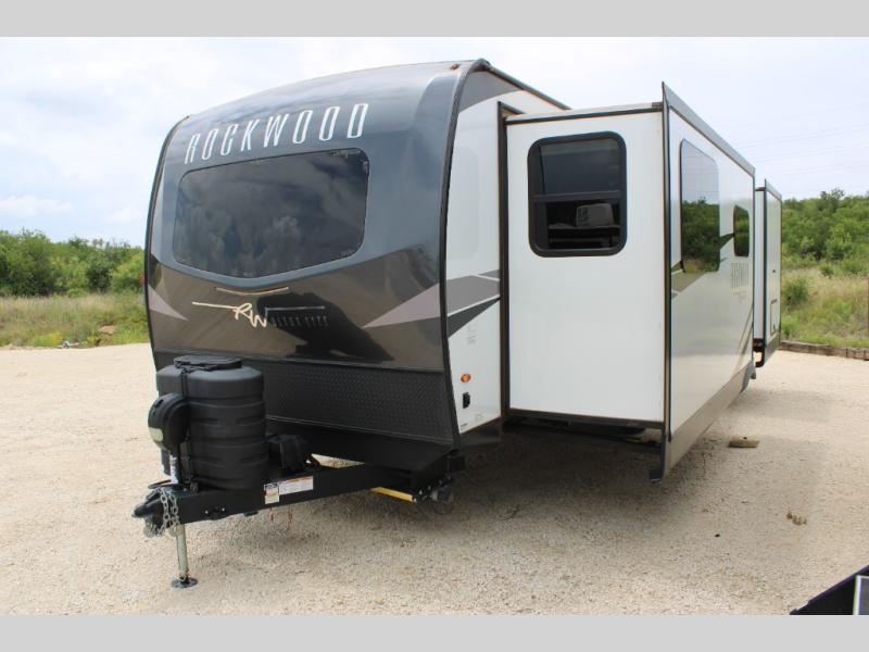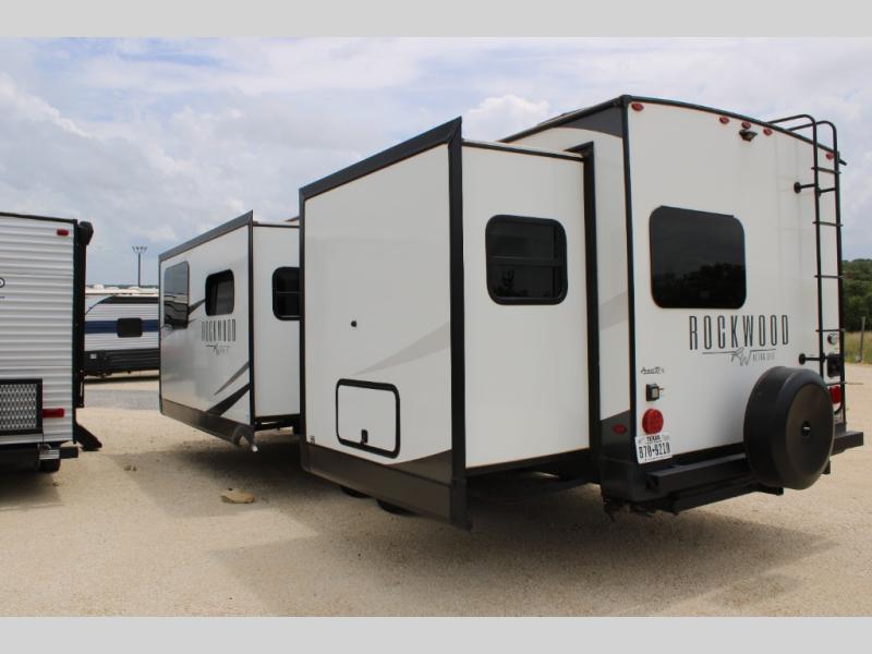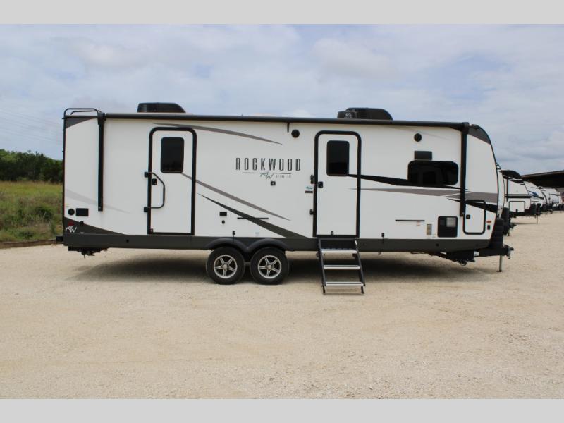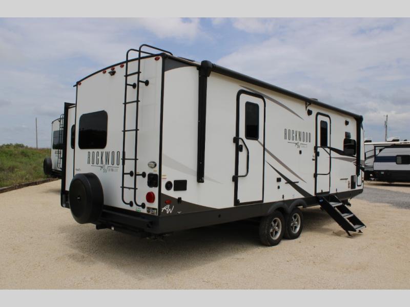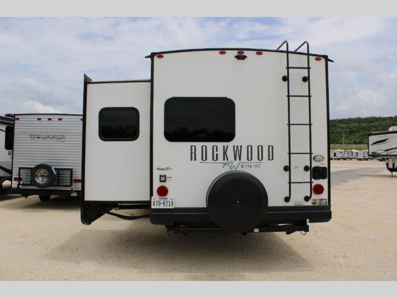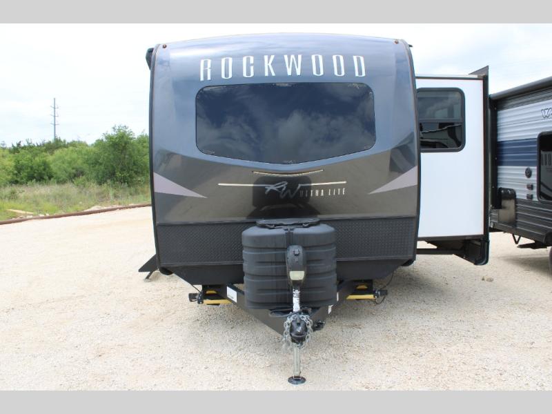 Each Rockwood Ultra Lite travel trailer by Forest River includes superior construction with a high gloss front cap, laminated white fiberglass sidewalls, and tinted frameless windows for a sleek look. You will love how easy it will be to charge a few electronics with the 200W roof solar panel with an 1800W inverter, and the AIR 360+ omnidirectional antenna with WiFi prep will let you stay connected to the outside world as you camp. The torsion axle, Rubber-Ryde suspension will make towing smooth and hassle-free, along with the nitrogen filled, Goodyear Endurance tires and the tire pressure monitor system. Interior comforts include designer kitchen backsplash, solid wood cabinet doors with hidden hinges, and night roller shades to name a few. Choose a Rockwood Ultra Lite travel trailer today!