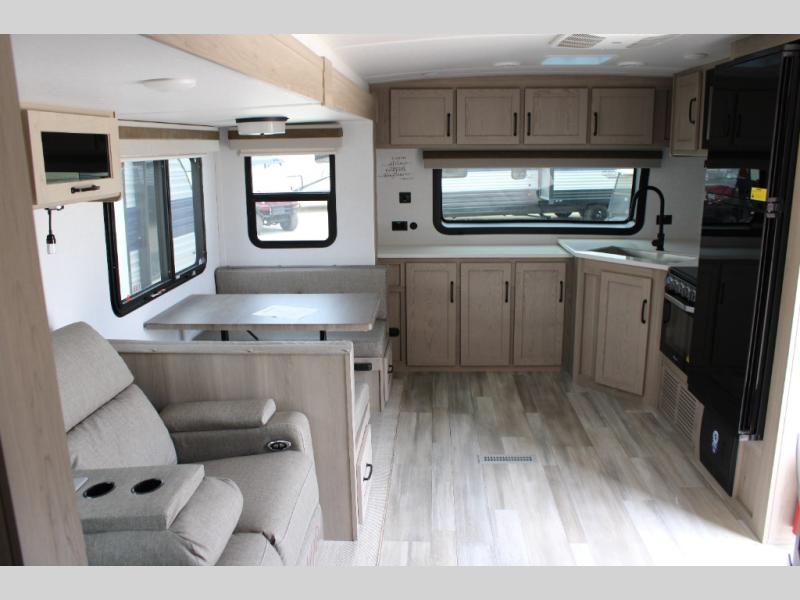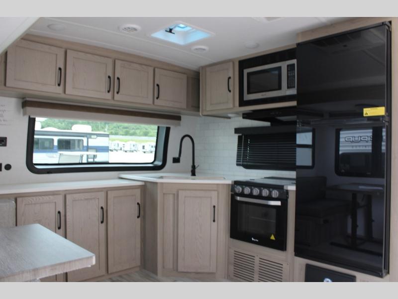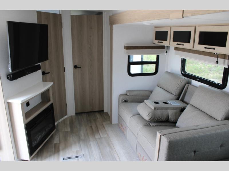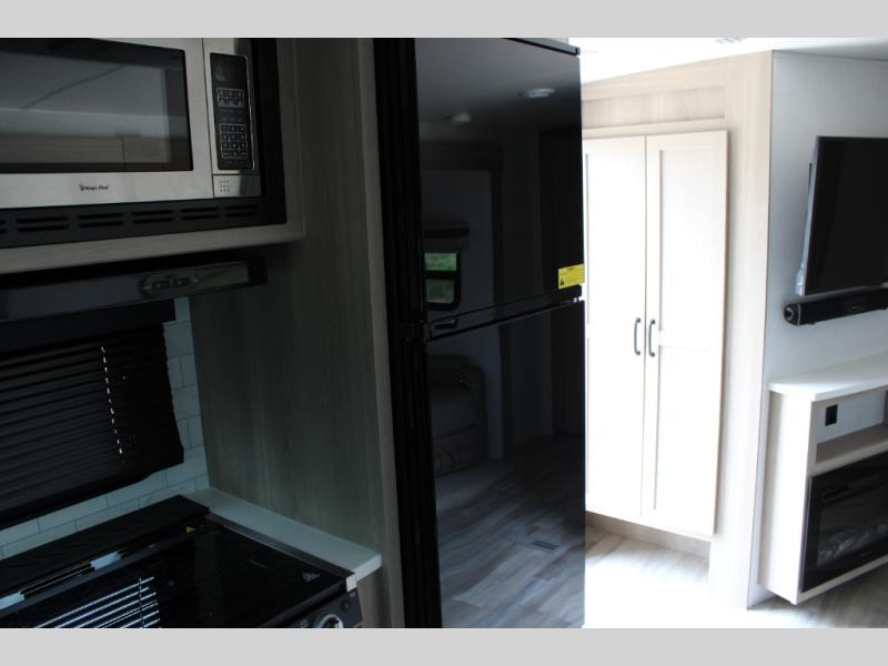 When you are outside this trailer you can enjoy the protection from the 21' power awning, and whip up a meal using the outside griddle. You will find exterior storage for your extra gear, and a ladder at the rear. You get to choose which entrance to step up into, be it the spacious rear bedroom with a queen bed slide and a wardrobe, or the main entry into the kitchen and living area. The furniture slide includes a booth dinette to eat your meals at, and theater seating to watch the Smart TV with a fireplace below. And the cook will love the front kitchen with extra counter space, a three burner range, plus a 12V refrigerator and pantry for food storage!