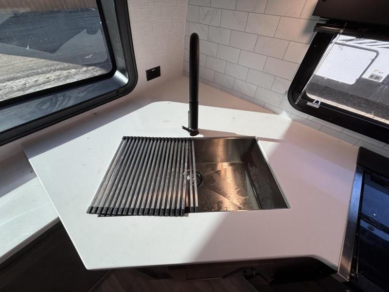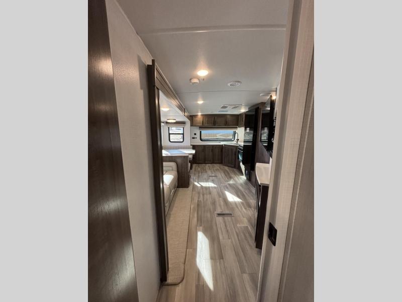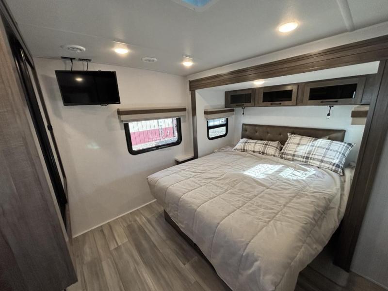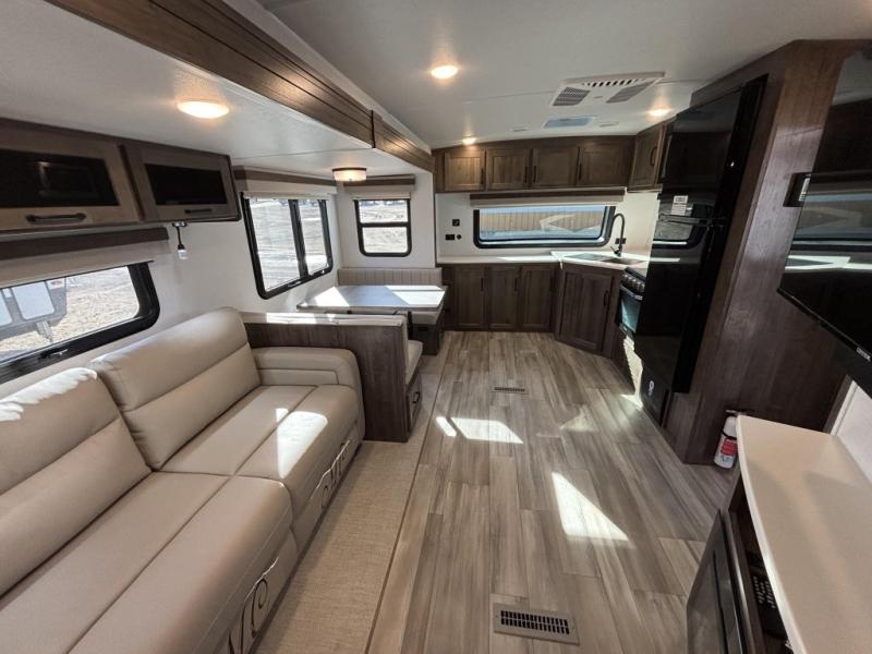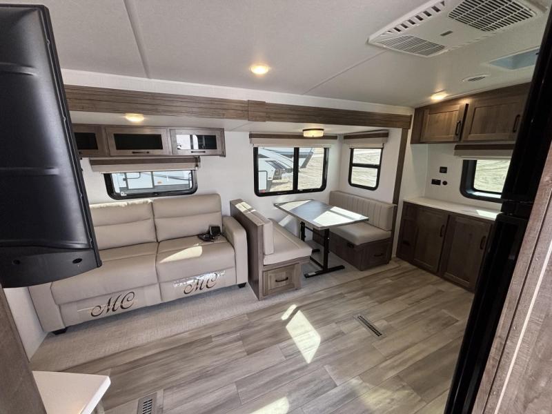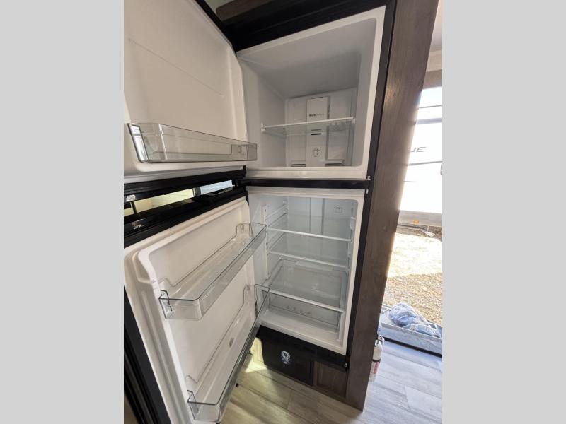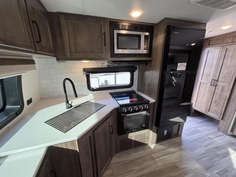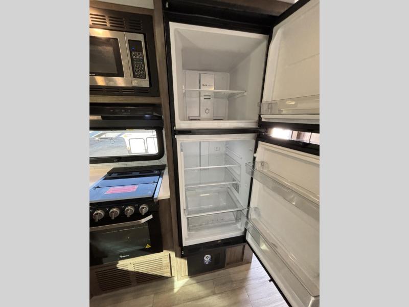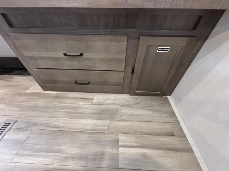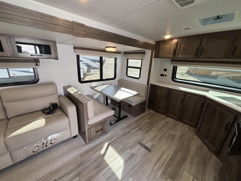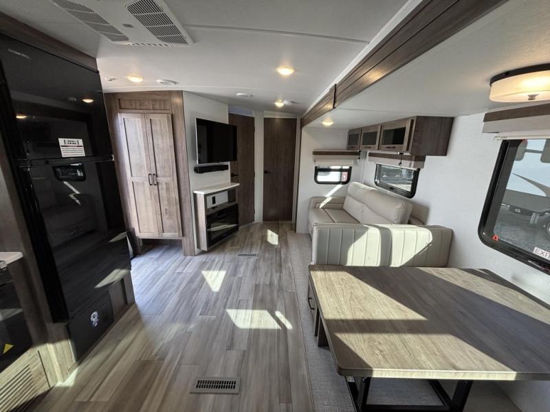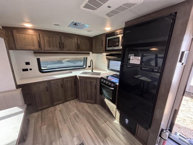 When you are outside this trailer you can enjoy the protection from the 21' power awning, and whip up a meal using the outside griddle. You will find exterior storage for your extra gear, and a ladder at the rear. You get to choose which entrance to step up into, be it the spacious rear bedroom with a queen bed slide and a wardrobe, or the main entry into the kitchen and living area. The furniture slide includes a booth dinette to eat your meals at, and theater seating to watch the Smart TV with a fireplace below. And the cook will love the front kitchen with extra counter space, a three burner range, plus a 12V refrigerator and pantry for food storage!