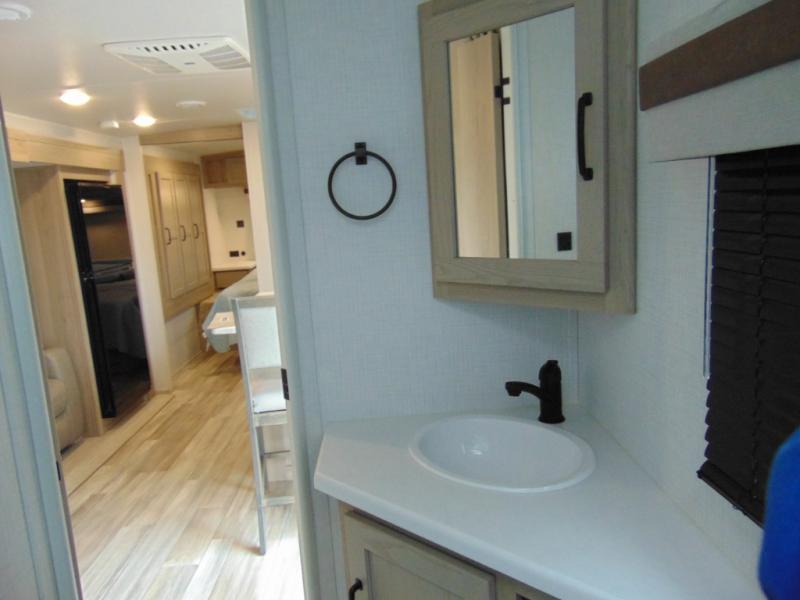 This is the perfect travel trailer to camp with friends and family since it has a private bunkhouse in the back with a flip-up bunk and a 68" sofa. The full bath is close by, as well as the main entry door for convenience. You'll find the second entry door leading into the front private bedroom that includes a queen-size bed, a wardrobe slide out, and an optional TV if you enjoy movies in bed. The U-shaped kitchen includes everything you need to prepare meals each day, and there is even an exterior griddle if you like to cook outside. In the evening, your crew can get comfortable on the theater seat or choose the optional hide-a-bed sofa if you're needing more sleeping space!