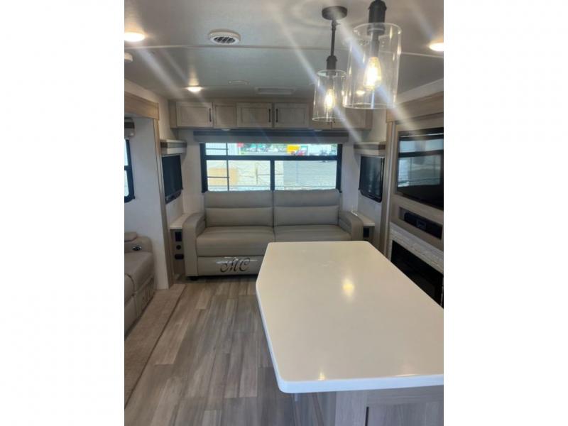 This trailer allows you to seat nine people, and the kitchen island provides a great place for the snacks and beverages. The dual opposing slides give the main living and kitchen area lots of floor space for everyone to move around, and the double entry bath is convenient with access from the hallway and the master suite. The front bedroom offers a queen bed slide, a wardrobe and storage along the front wall, plus you can choose to add an optional TV. And the two 11' power awnings give you an outdoor living area protected from the elements, just add your camping chairs.