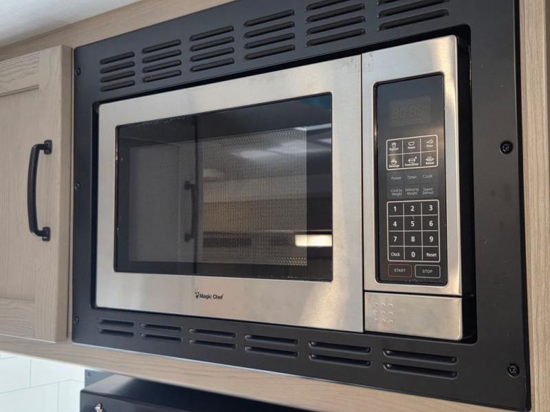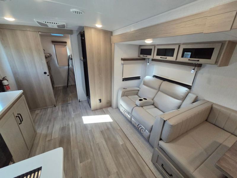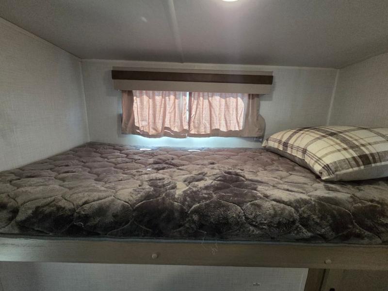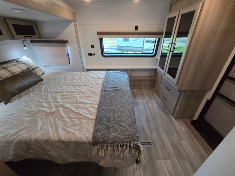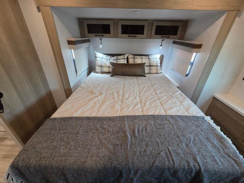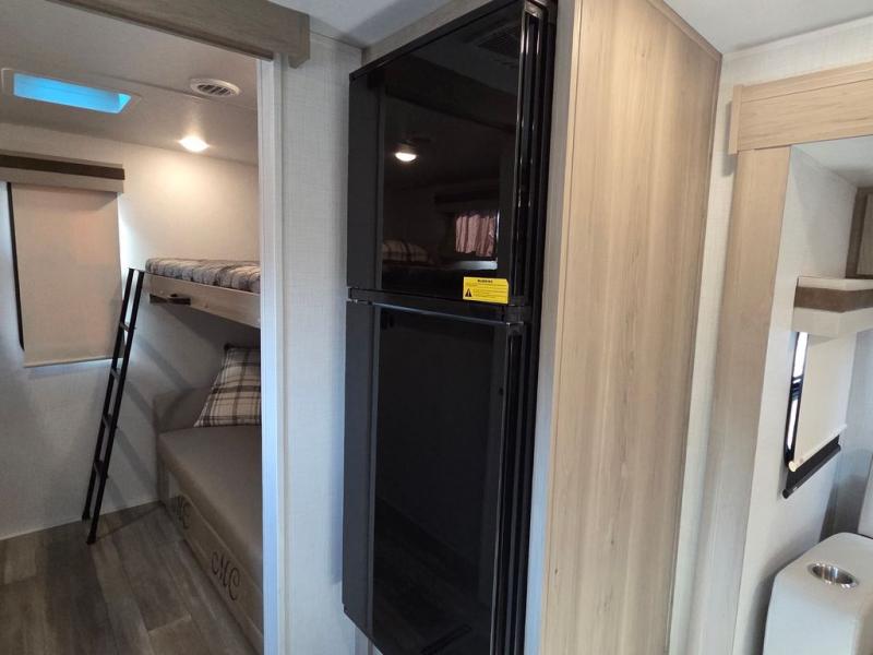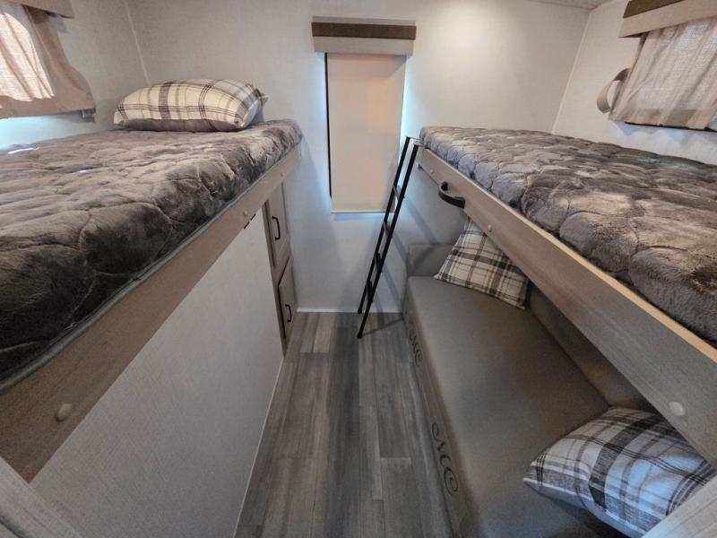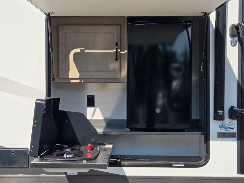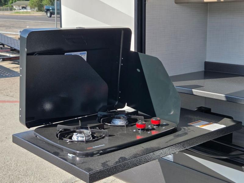 Go camping to explore the outdoors or enjoy the scenery and do it all over again thanks to the comfort of your own trailer at the campsite! The dual entry doors make entering and exiting easy to the private rear bunkhouse with two bunks and a 68" sofa. You will find lots of storage in the front bedroom, plus a queen bed slide and the second entry, and the full bathroom has access from the main living and kitchen area. Everyone can relax on the theater seating or U-shaped dinette while the cook uses the L-shaped kitchen area with full amenities to make meals. And the exterior gives you an outside kitchen, a griddle, plus exterior storage for larger camp gear!