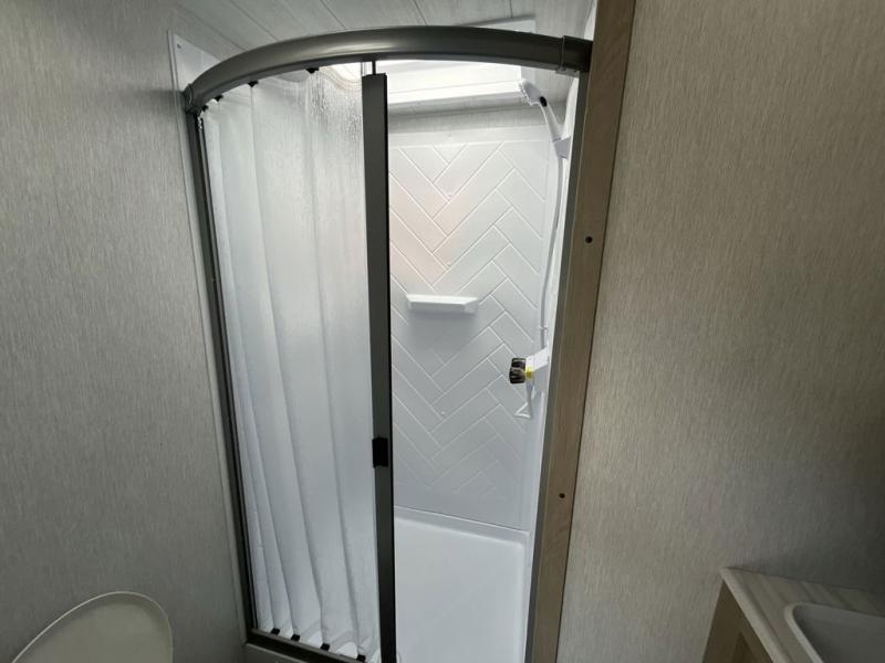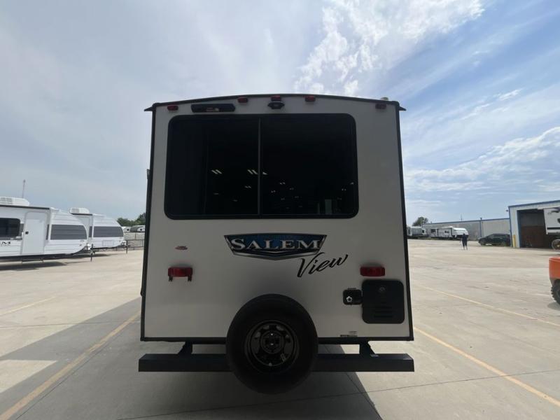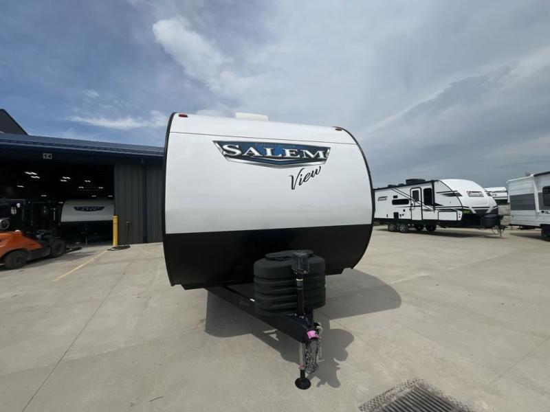 Choose any Salem View travel trailer if you are looking to bring the outdoors inside. With loads of windows you will easily be soaking up your surroundings. All models feature a cambered chassis with a 2" wall construction, 16" (or less) on center, a powder coated I-beam frame with a 3/8" walk-on roof decking and 5/8" tongue and groove plywood floor decking, plus smooth hung fiberglass exterior along with an aerodynamic front radius profile. These units feature seamless holding tanks and color coded water lines as well. The heated and enclosed underbelly allows you to camp through more seasons, and you will enjoy the power tongue jack with LED light, quick drop stabilizer jacks for easy set up, as well as a power awning with adjustable legs, and so much more!