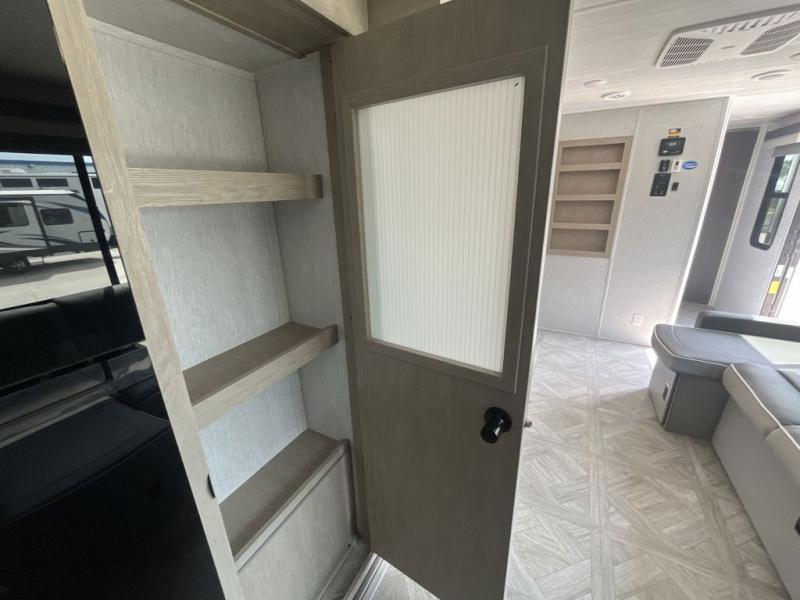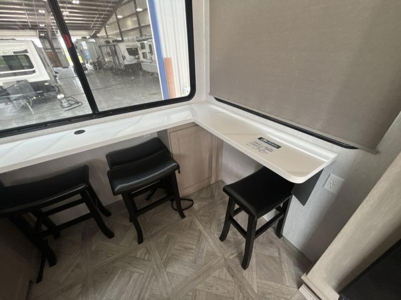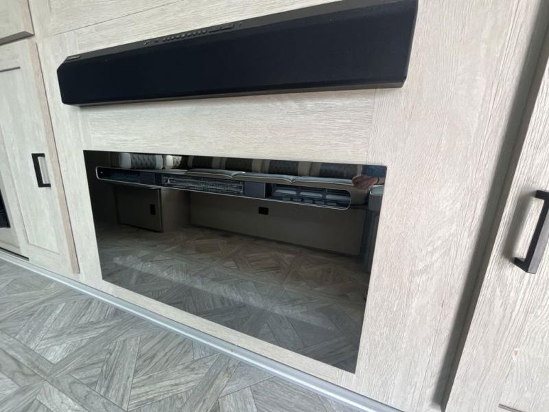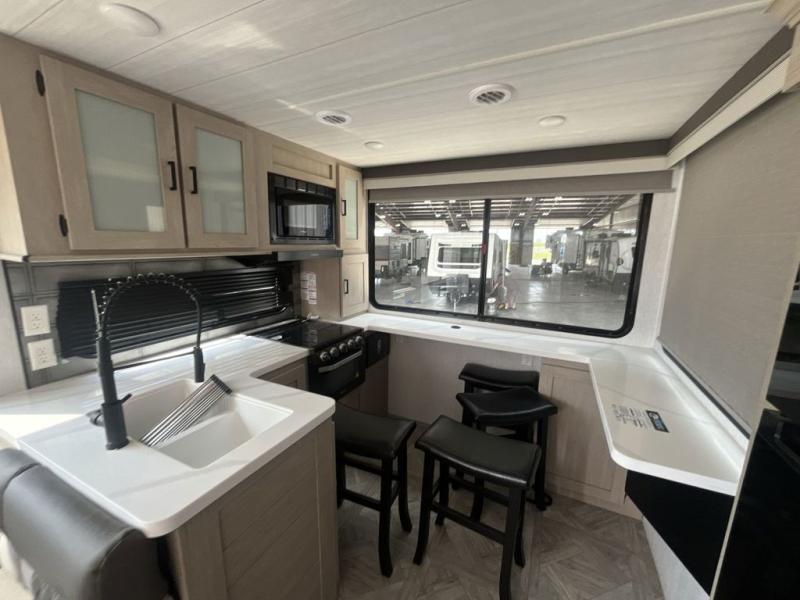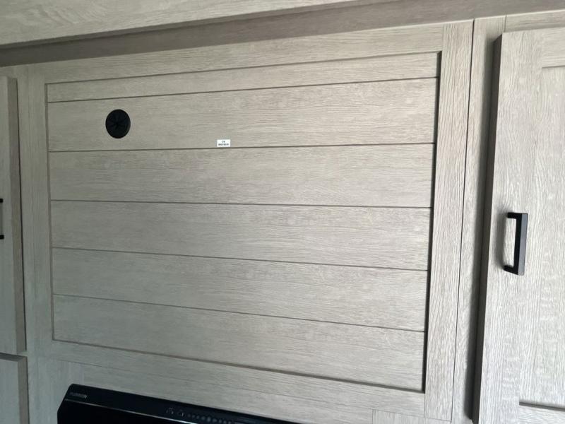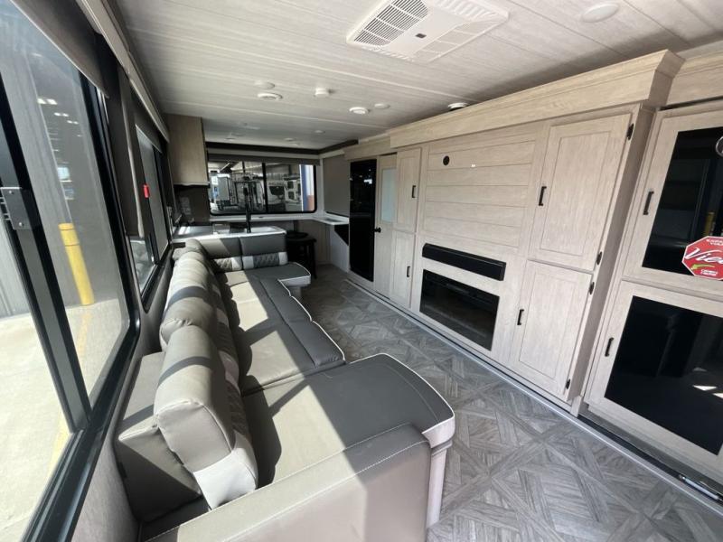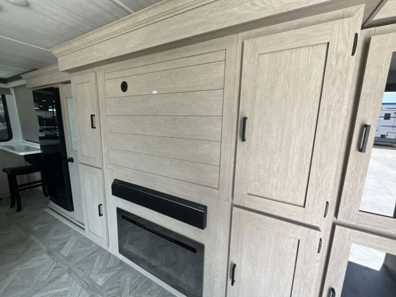 Your family of four will enjoy this Salem View bunk model featuring 105 square feet of window space for unbelievable views of your surroundings. A Versa Slide features a refrigerator, pantry, and entertainment center with a door leading to a bunk space including a set of 30" x 70" bunks with top flip-up bunk, storage cubbies for your things, and a desk with bar stool for any office work that you may need to do while you travel. All is neatly tucked away within the slide behind a shiplap featured entertainment wall with fireplace opposite the sectional sofa which is great for relaxing and entertaining family and friends indoors. The rear kitchen area offers 18 linear feet of countertop space with four bar stools, plus a three burner range and double sink. Your refrigerator and pantry will hold all of your perishables and dry goods, and those are nearby within the Versa slide. Up front, a private bedroom with Versa-Tilt custom king bed which provides 14-1/2" of additional walking around space, plus you will find a wardrobe that has been prepped for a washer and dryer if you choose to add, as well as dual nightstands beneath wardrobes on either side of the bed. A large pass-through storage compartment offers plenty of space for your outdoor gear, and if you enjoy outdoor cooking, you might want to add the outside kitchen option as well.