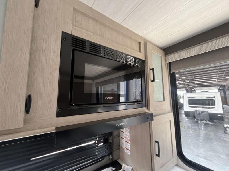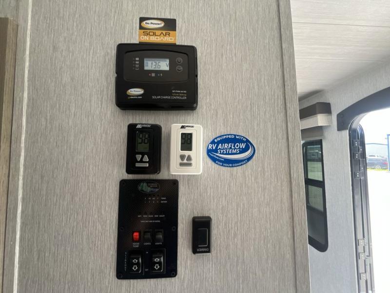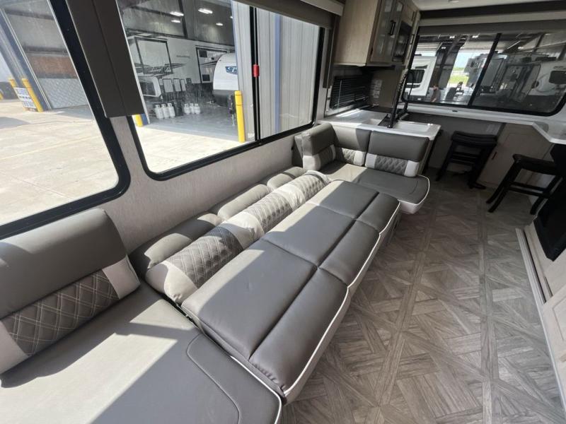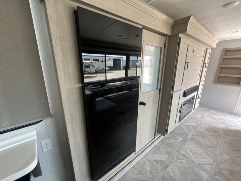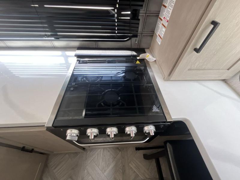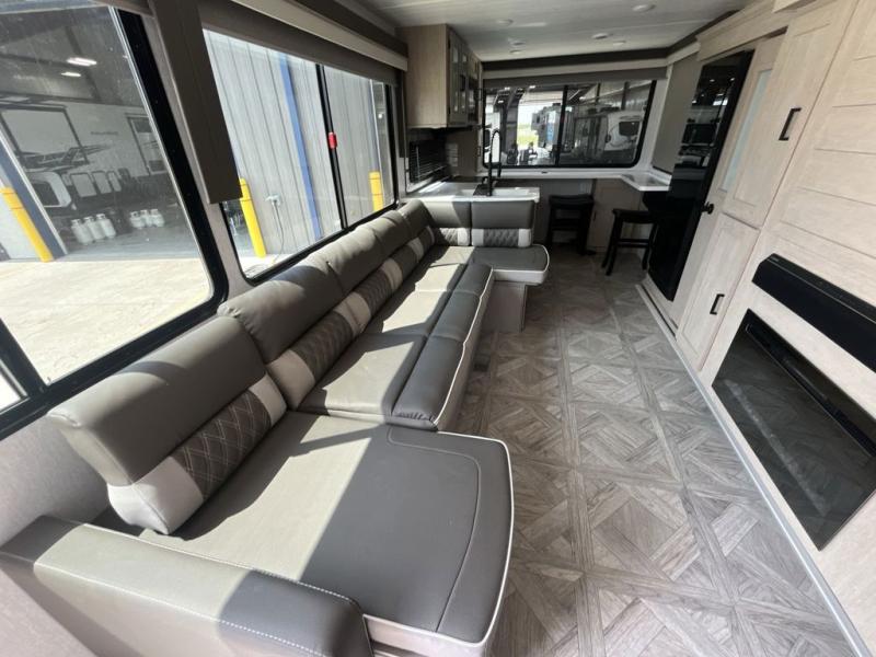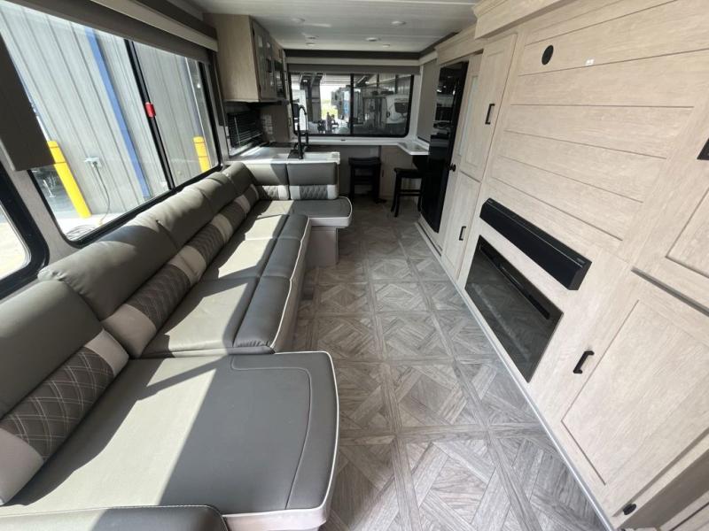 Your family of four will enjoy this Salem View bunk model featuring 105 square feet of window space for unbelievable views of your surroundings. A Versa Slide features a refrigerator, pantry, and entertainment center with a door leading to a bunk space including a set of 30" x 70" bunks with top flip-up bunk, storage cubbies for your things, and a desk with bar stool for any office work that you may need to do while you travel. All is neatly tucked away within the slide behind a shiplap featured entertainment wall with fireplace opposite the sectional sofa which is great for relaxing and entertaining family and friends indoors. The rear kitchen area offers 18 linear feet of countertop space with four bar stools, plus a three burner range and double sink. Your refrigerator and pantry will hold all of your perishables and dry goods, and those are nearby within the Versa slide. Up front, a private bedroom with Versa-Tilt custom king bed which provides 14-1/2" of additional walking around space, plus you will find a wardrobe that has been prepped for a washer and dryer if you choose to add, as well as dual nightstands beneath wardrobes on either side of the bed. A large pass-through storage compartment offers plenty of space for your outdoor gear, and if you enjoy outdoor cooking, you might want to add the outside kitchen option as well.