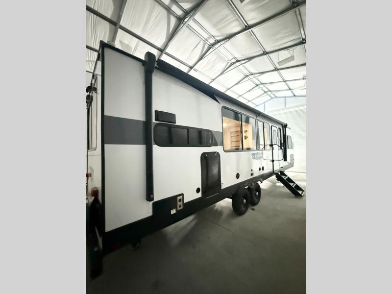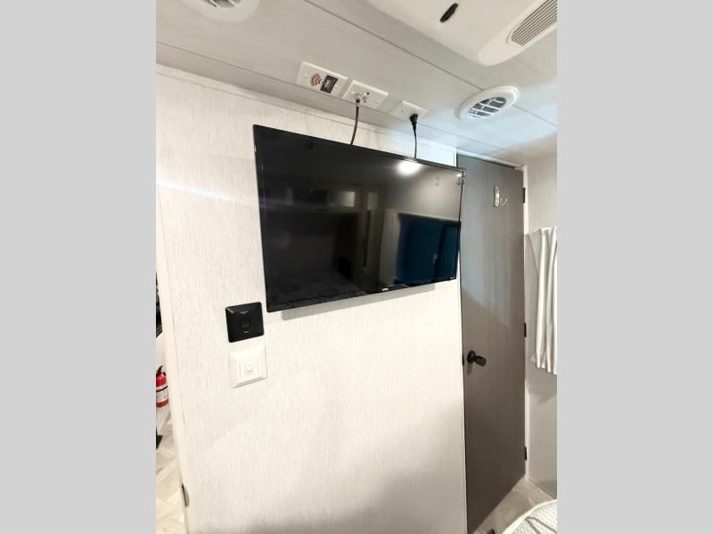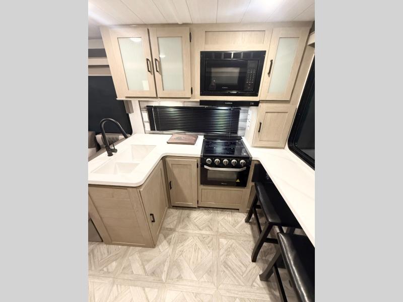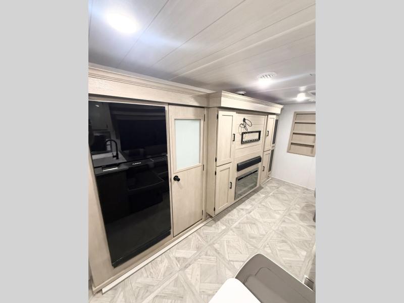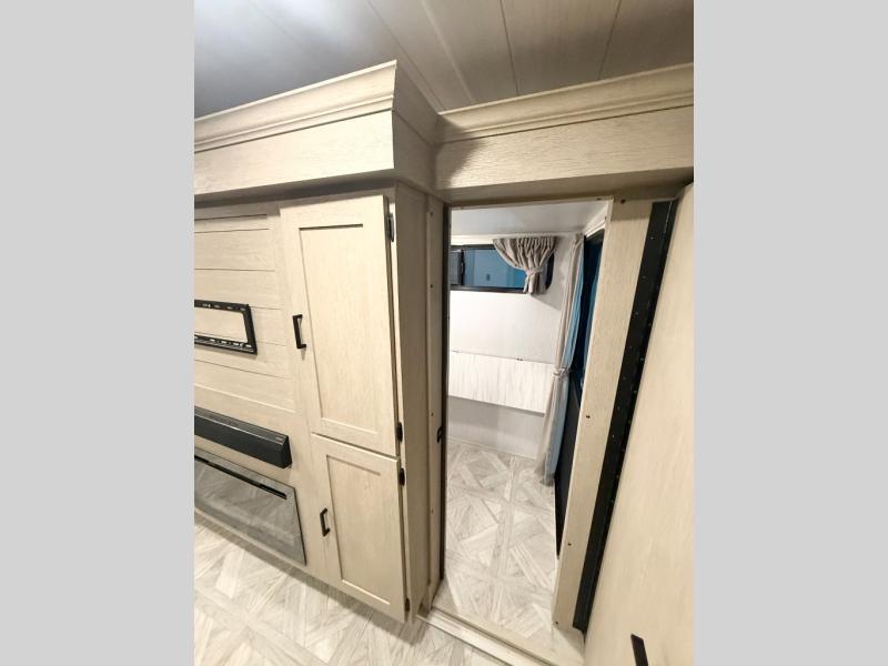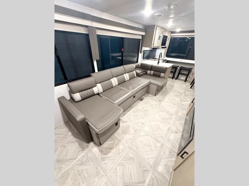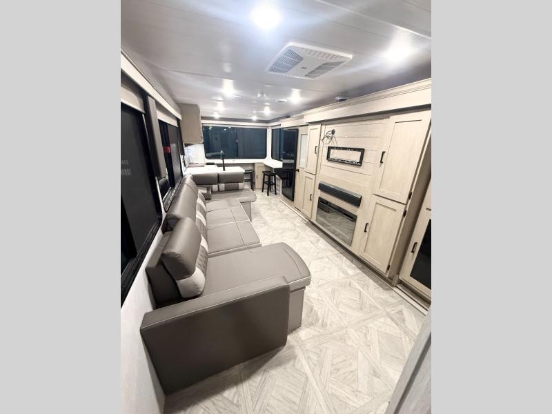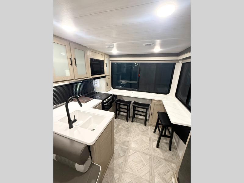 Your family of four will enjoy this Salem View bunk model featuring 105 square feet of window space for unbelievable views of your surroundings. A Versa Slide features a refrigerator, pantry, and entertainment center with a door leading to a bunk space including a set of 30" x 70" bunks with top flip-up bunk, storage cubbies for your things, and a desk with bar stool for any office work that you may need to do while you travel. All is neatly tucked away within the slide behind a shiplap featured entertainment wall with fireplace opposite the sectional sofa which is great for relaxing and entertaining family and friends indoors. The rear kitchen area offers 18 linear feet of countertop space with four bar stools, plus a three burner range and double sink. Your refrigerator and pantry will hold all of your perishables and dry goods, and those are nearby within the Versa slide. Up front, a private bedroom with Versa-Tilt custom king bed which provides 14-1/2" of additional walking around space, plus you will find a wardrobe that has been prepped for a washer and dryer if you choose to add, as well as dual nightstands beneath wardrobes on either side of the bed. A large pass-through storage compartment offers plenty of space for your outdoor gear, and if you enjoy outdoor cooking, you might want to add the outside kitchen option as well.