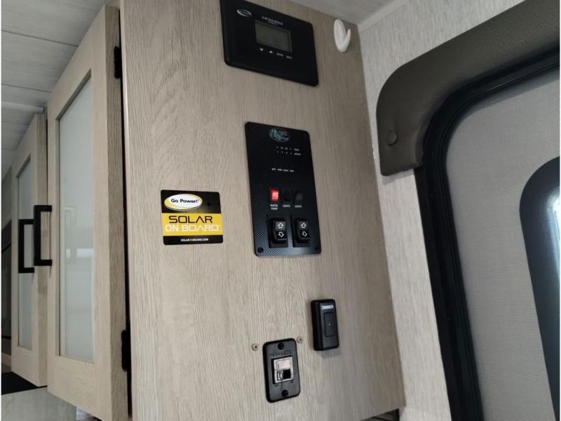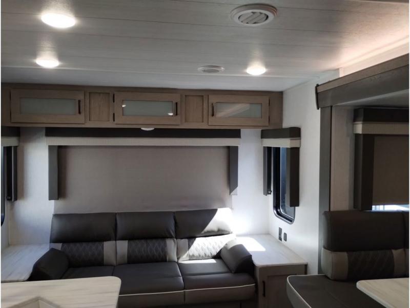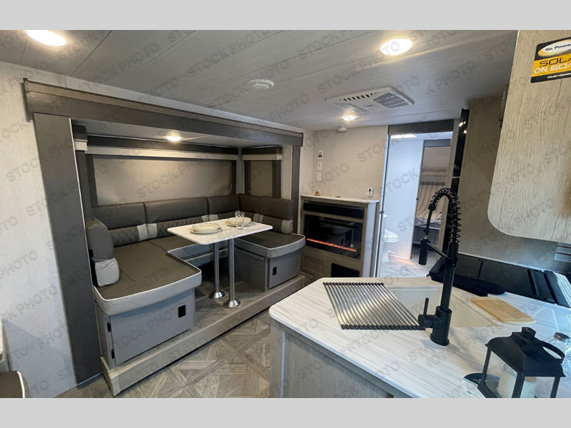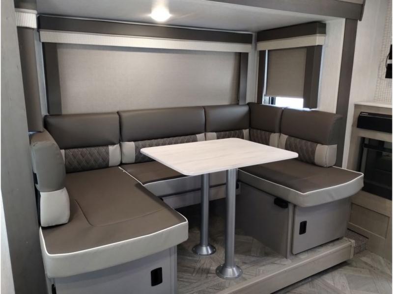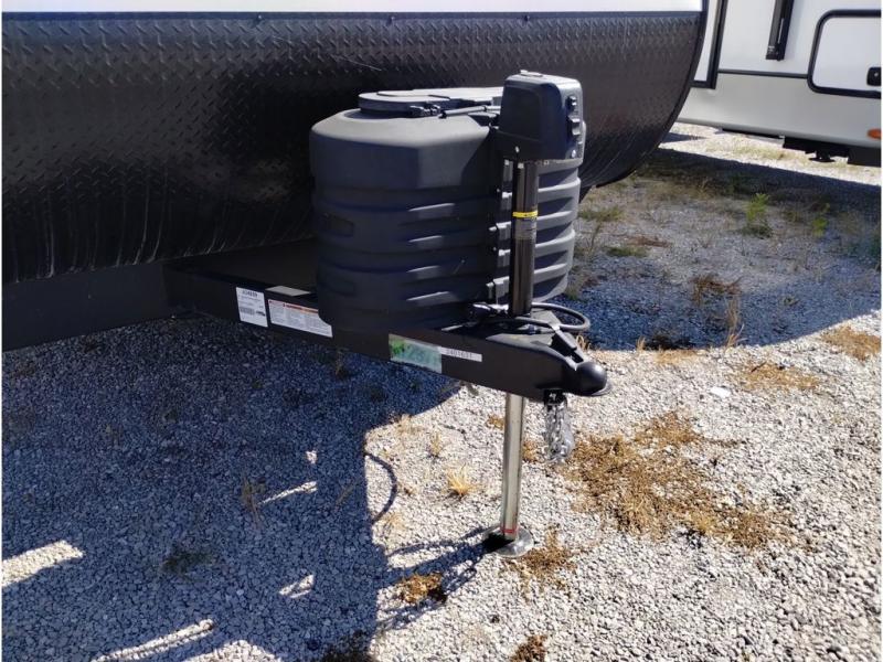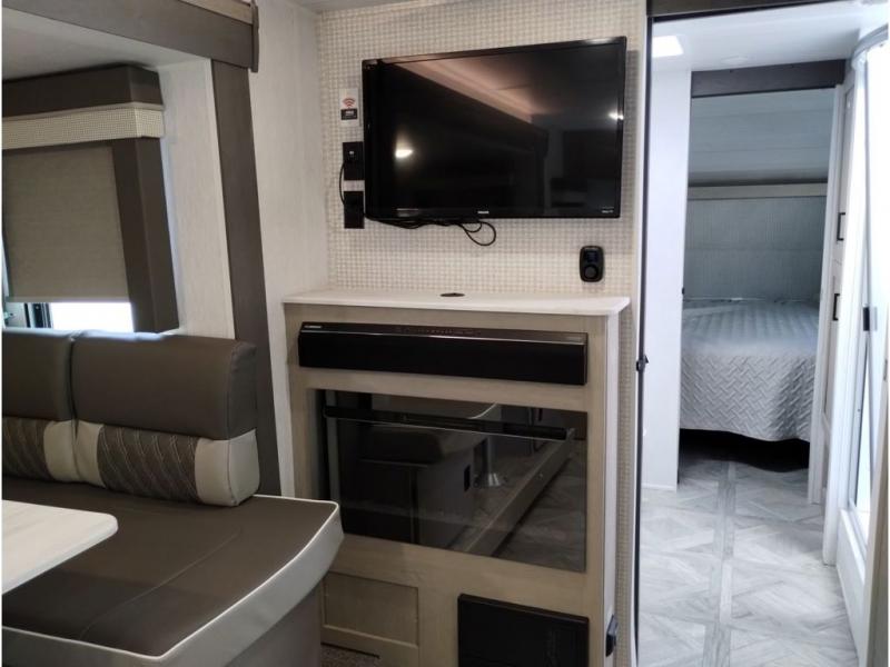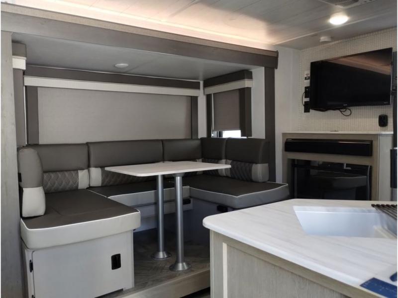 This travel trailer is packed full of features, but is still lightweight coming in at just over 5,000 lbs.! You will feel right at home in the front master bedroom with a custom king bed with Versa Tilt that has closets on either side, CPAP storage, and a walk-in closet to keep your clothes looking their best. The walk-through bathroom has a walk-in shower with fiberglass surround and a skylight above for added natural lighting as you get ready. The U-shaped dinette slide has a panoramic window for you to enjoy your beautiful scenery as you eat dinner, and there is a fireplace at the entertainment center for a relaxing evening indoors. There is a pass-through storage area to store your outdoor camping gear, and a 16' power awning and exterior speakers to crank up the tunes!