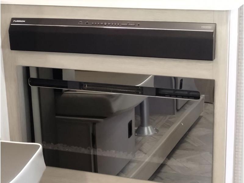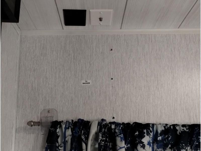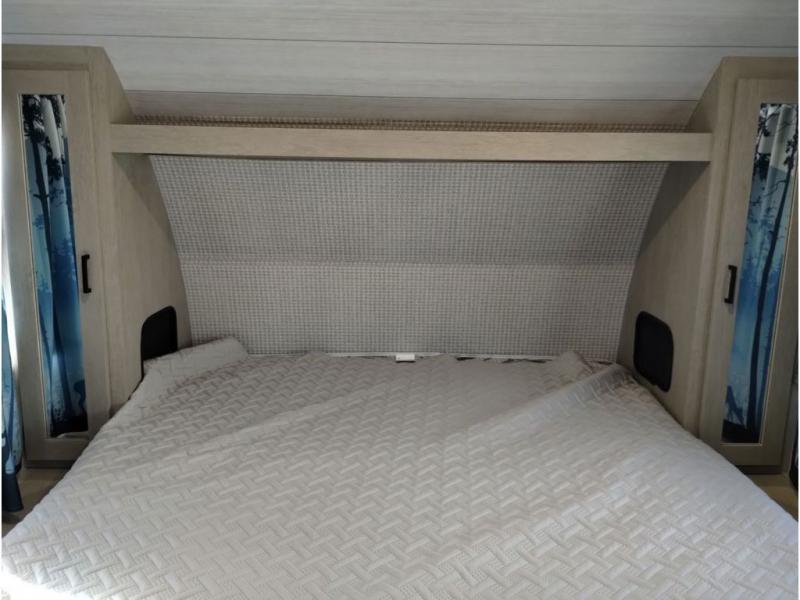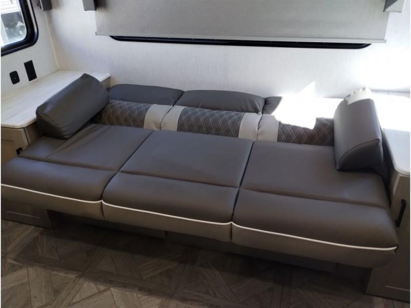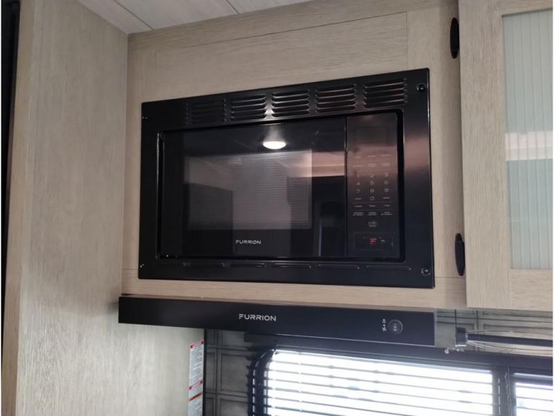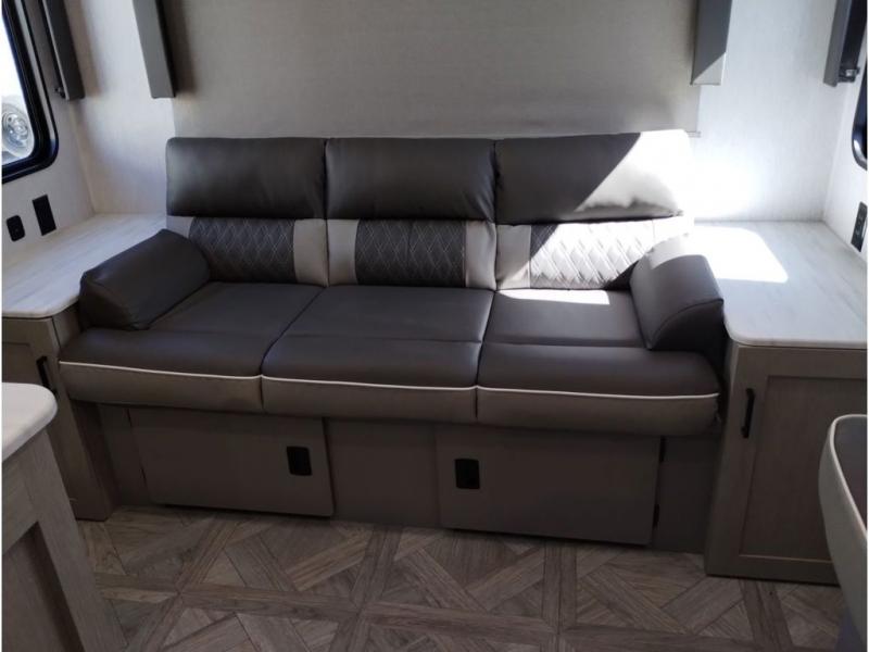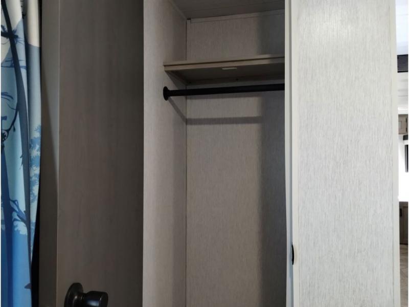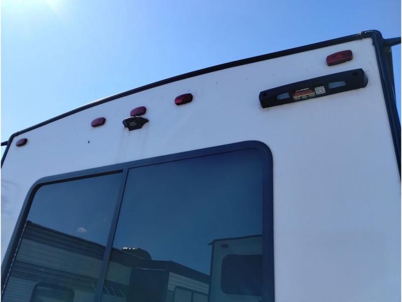This travel trailer is packed full of features, but is still lightweight coming in at just over 5,000 lbs.! You will feel right at home in the front master bedroom with a custom king bed with Versa Tilt that has closets on either side, CPAP storage, and a walk-in closet to keep your clothes looking their best. The walk-through bathroom has a walk-in shower with fiberglass surround and a skylight above for added natural lighting as you get ready. The U-shaped dinette slide has a panoramic window for you to enjoy your beautiful scenery as you eat dinner, and there is a fireplace at the entertainment center for a relaxing evening indoors. There is a pass-through storage area to store your outdoor camping gear, and a 16' power awning and exterior speakers to crank up the tunes!