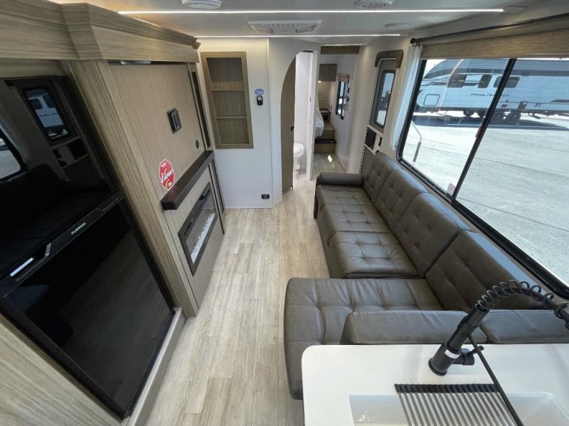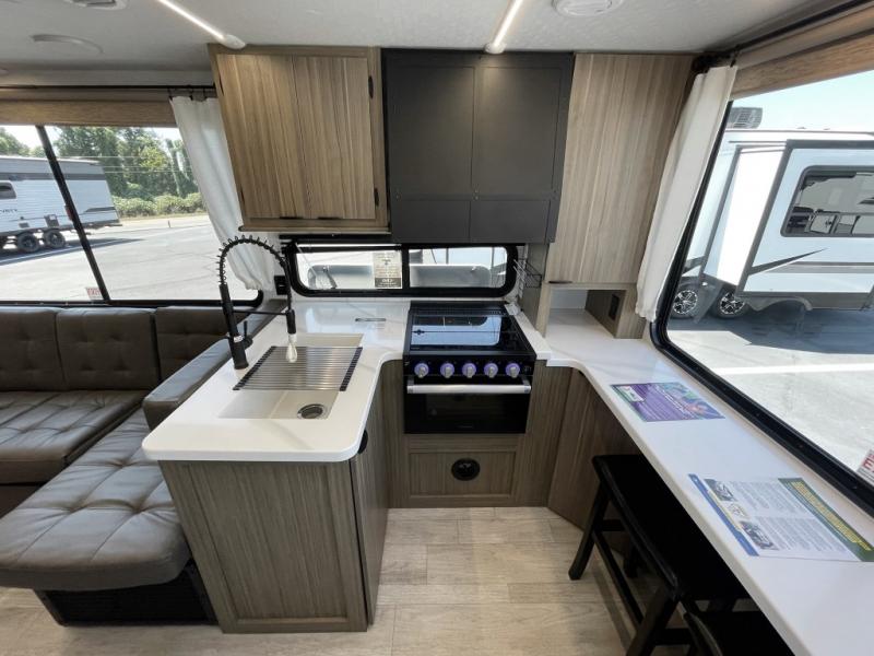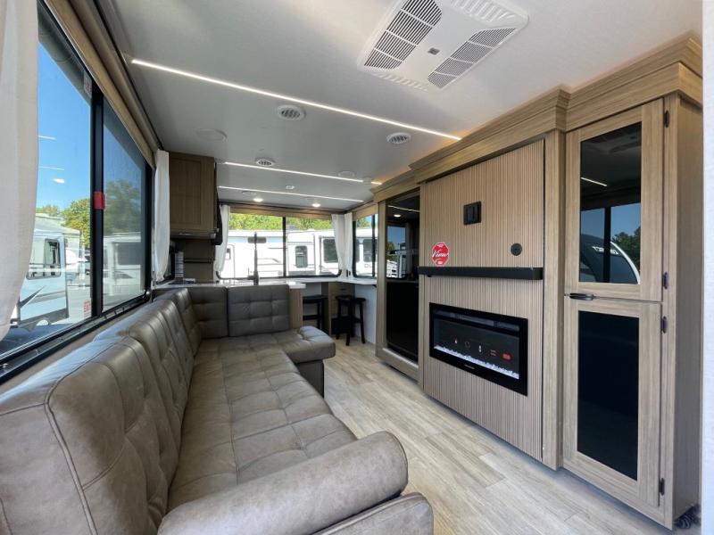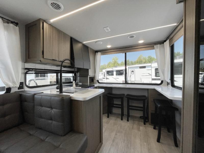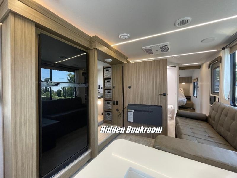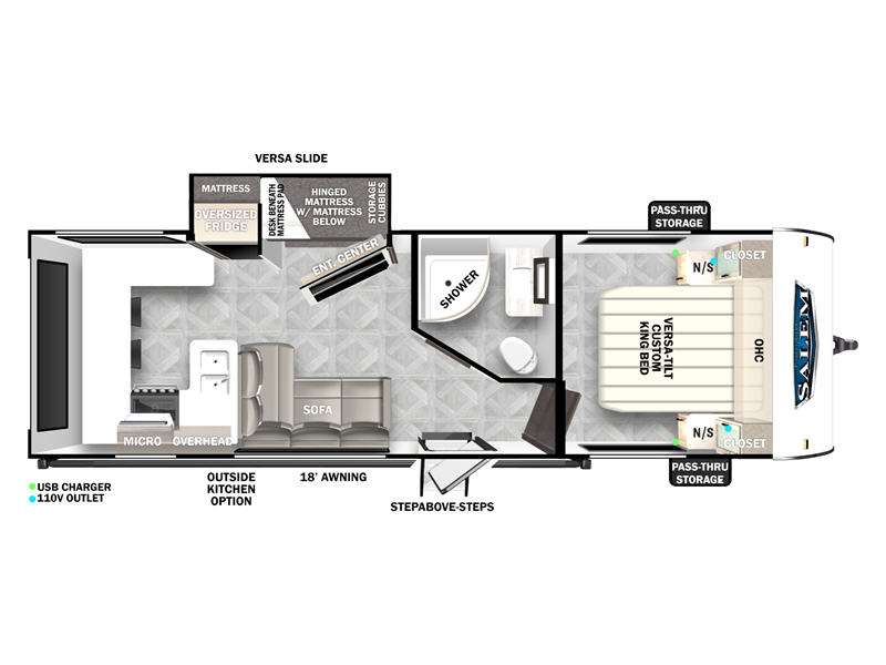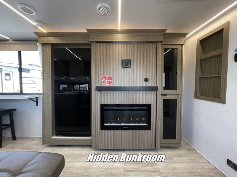 Enjoy your surroundings with 64 square feet of windows! So, no matter where you park, you can easily bring the outdoors right inside. The rear kitchen features 18 linear feet of wrap-around counter space including a double sink and three burner cook-top with an overhead microwave oven. There are bar stools for dining inside along the rear counter, and an L-shaped sofa for additional seating in the open living area. Here, behind the entertainment center, is a multi-purpose space hidden behind a shiplap wall features with fireplace including a hinged top mattress above a lower bunk, a desk beneath the mattress if you need office space during the day, and storage cubbies for your things, all within the Versa-Slide that also houses an oversized refrigerator for all of your perishables. The front private bedroom features a Versa-Tilt custom king bed with dual nightstands and closets, plus overhead storage. You will also find additional storage in a large pass-through beneath on the exterior. Choose an optional exterior outdoor kitchen if you like, and the 18' awning will be a great feature for added living space keeping you protected from rain or the suns rays on a bright and sunny day.