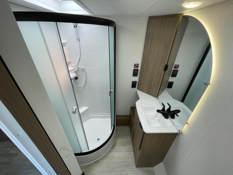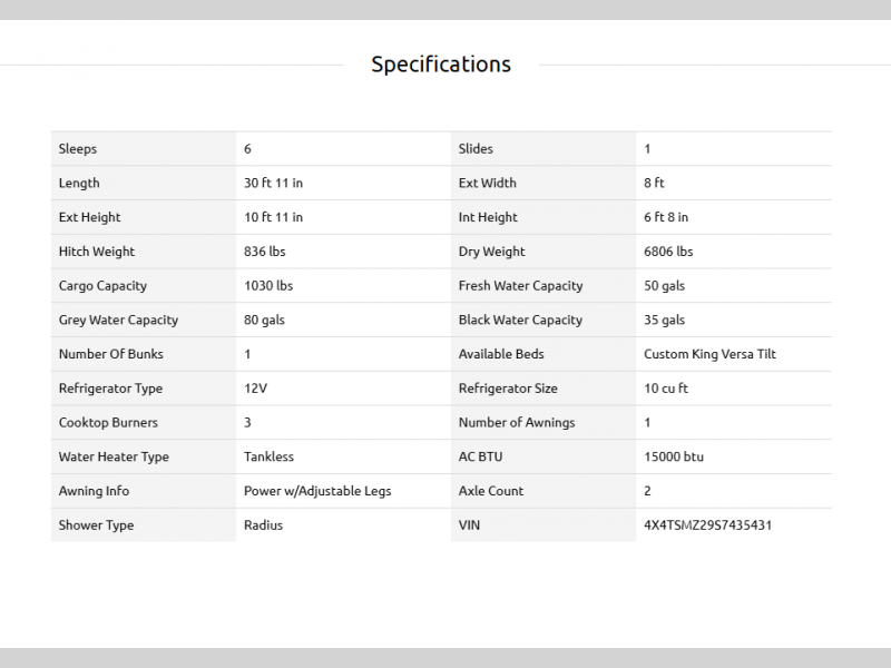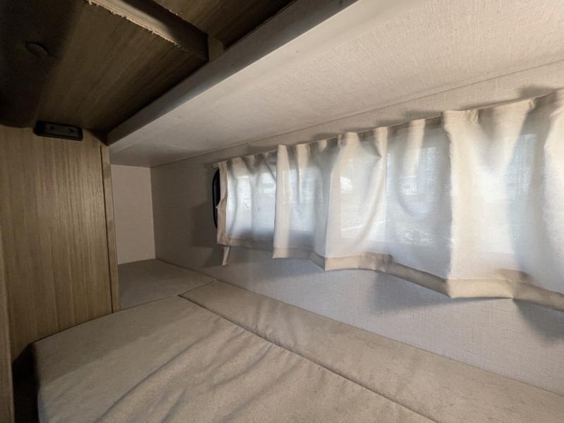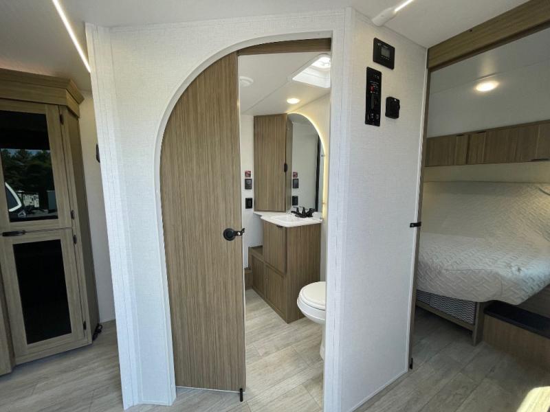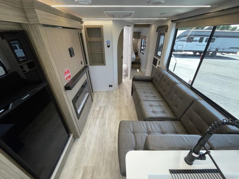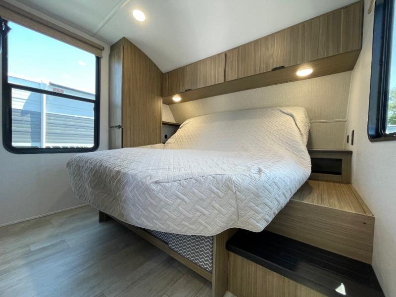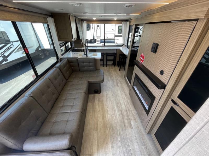 Enjoy your surroundings with 64 square feet of windows! So, no matter where you park, you can easily bring the outdoors right inside. The rear kitchen features 18 linear feet of wrap-around counter space including a double sink and three burner cook-top with an overhead microwave oven. There are bar stools for dining inside along the rear counter, and an L-shaped sofa for additional seating in the open living area. Here, behind the entertainment center, is a multi-purpose space hidden behind a shiplap wall features with fireplace including a hinged top mattress above a lower bunk, a desk beneath the mattress if you need office space during the day, and storage cubbies for your things, all within the Versa-Slide that also houses an oversized refrigerator for all of your perishables. The front private bedroom features a Versa-Tilt custom king bed with dual nightstands and closets, plus overhead storage. You will also find additional storage in a large pass-through beneath on the exterior. Choose an optional exterior outdoor kitchen if you like, and the 18' awning will be a great feature for added living space keeping you protected from rain or the suns rays on a bright and sunny day.