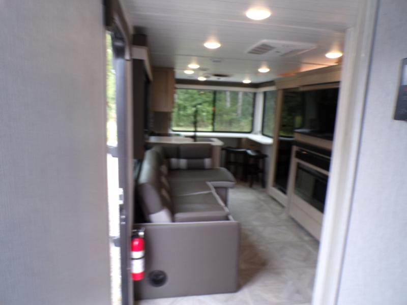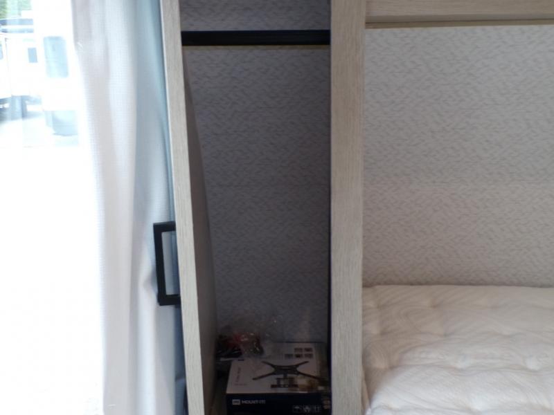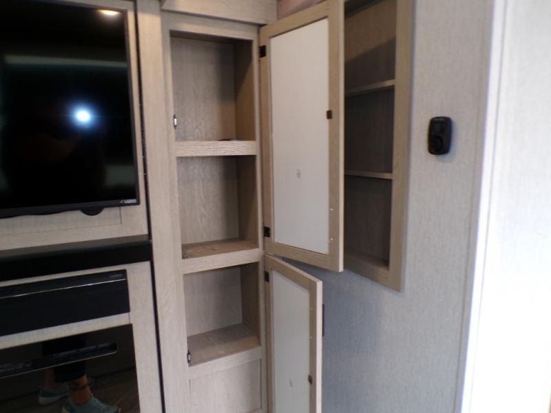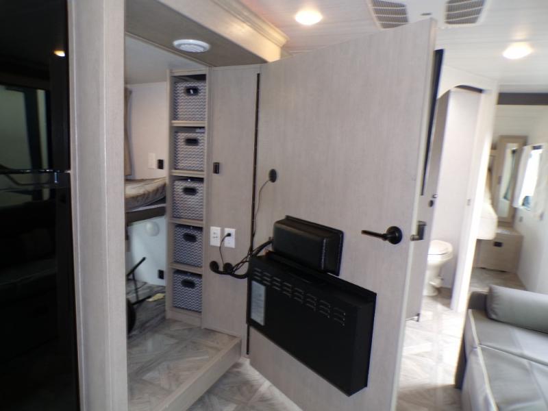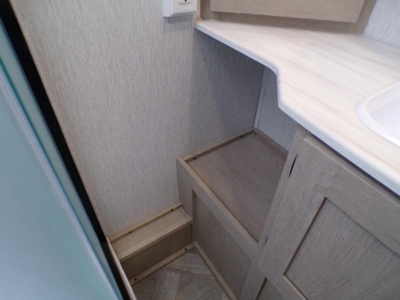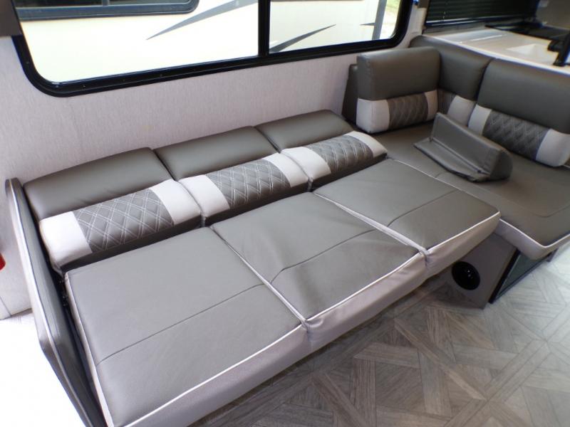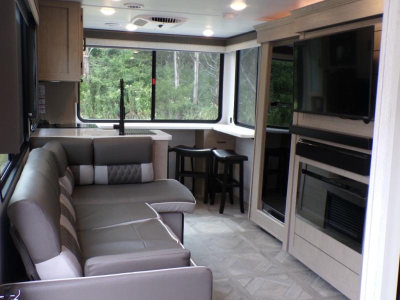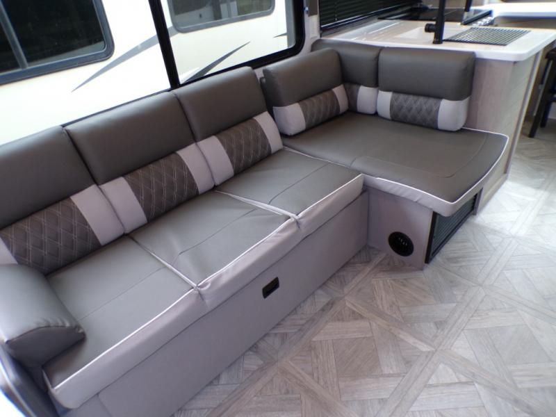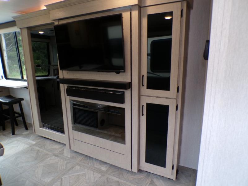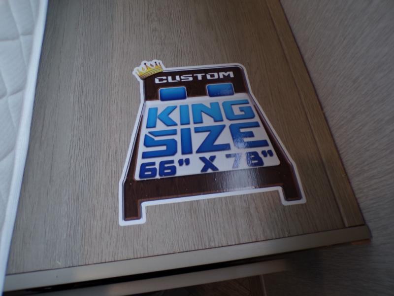 Enjoy your surroundings with 64 square feet of windows! So, no matter where you park, you can easily bring the outdoors right inside. The rear kitchen features 18 linear feet of wrap-around counter space including a double sink and three burner cook-top with an overhead microwave oven. There are bar stools for dining inside along the rear counter, and an L-shaped sofa for additional seating in the open living area. Here, behind the entertainment center, is a multi-purpose space hidden behind a shiplap wall features with fireplace including a hinged top mattress above a lower bunk, a desk beneath the mattress if you need office space during the day, and storage cubbies for your things, all within the Versa-Slide that also houses an oversized refrigerator for all of your perishables. The front private bedroom features a Versa-Tilt custom king bed with dual nightstands and closets, plus overhead storage. You will also find additional storage in a large pass-through beneath on the exterior. Choose an optional exterior outdoor kitchen if you like, and the 18' awning will be a great feature for added living space keeping you protected from rain or the suns rays on a bright and sunny day.