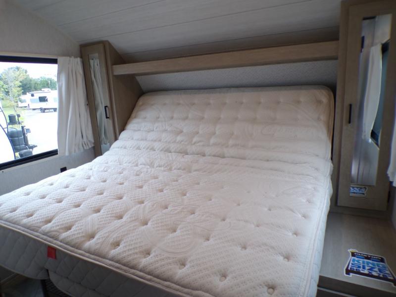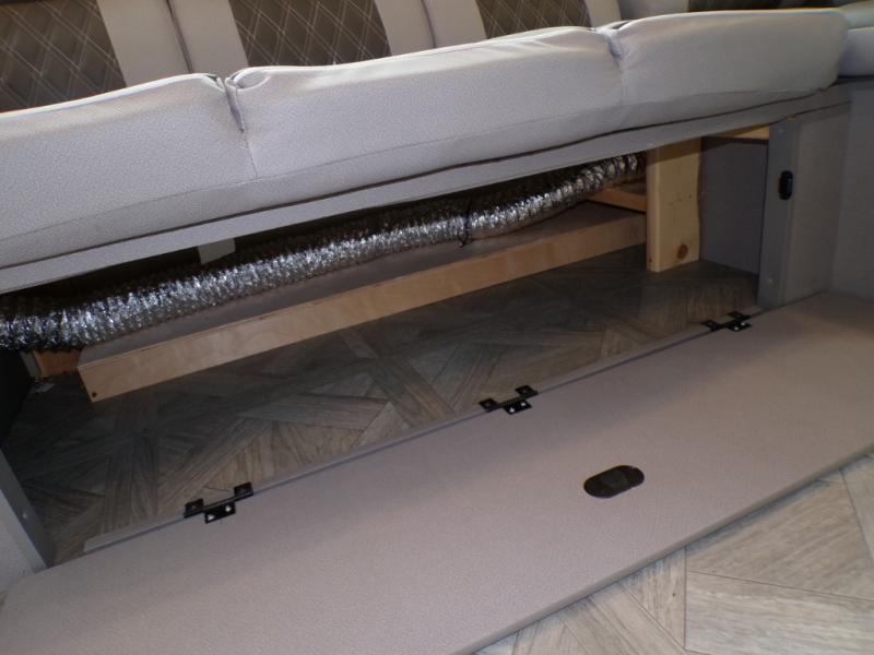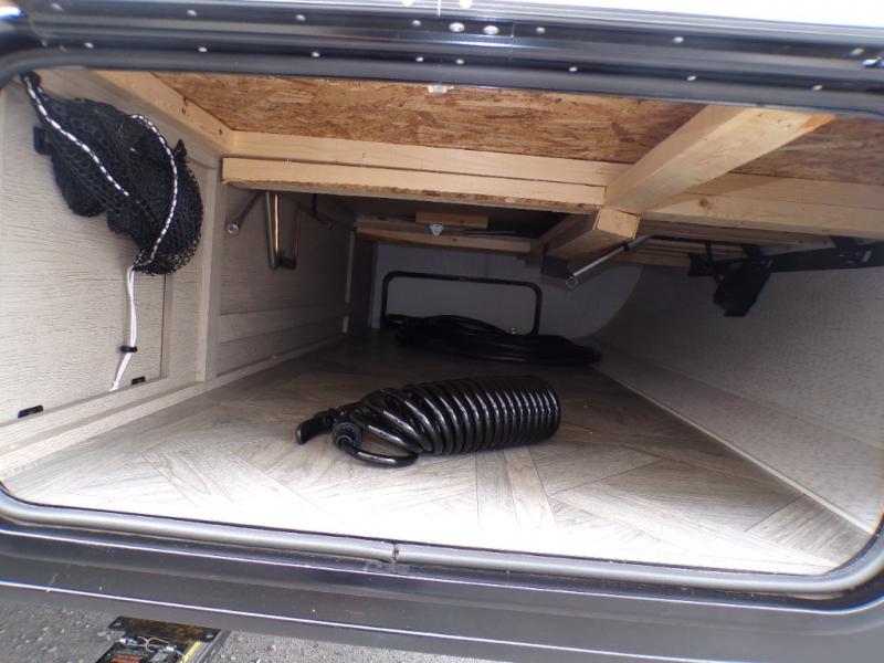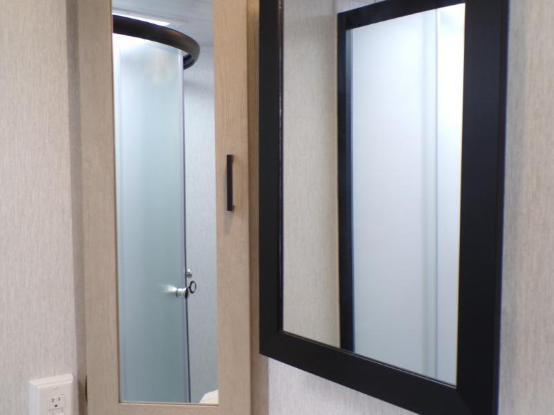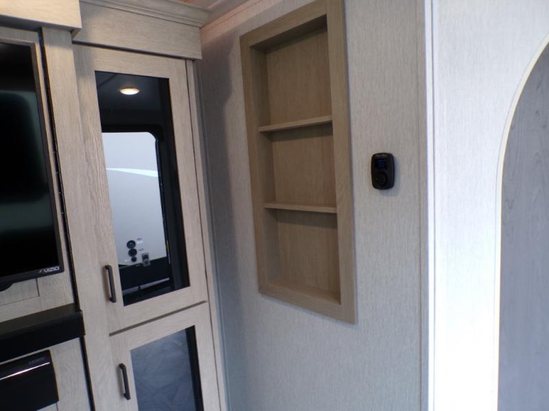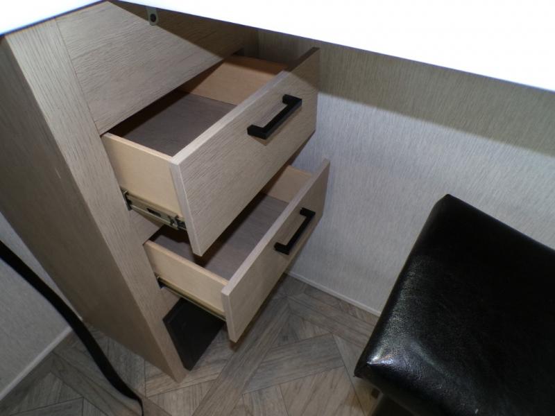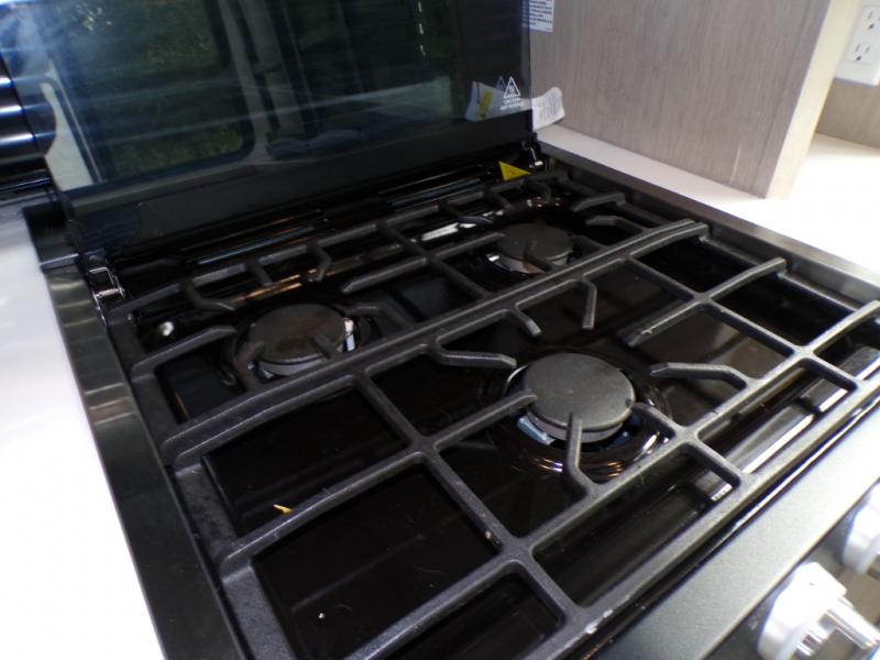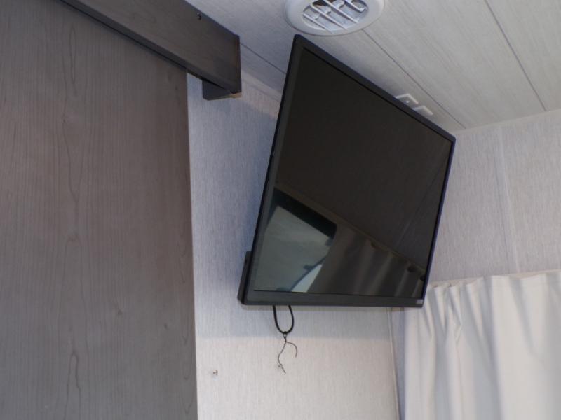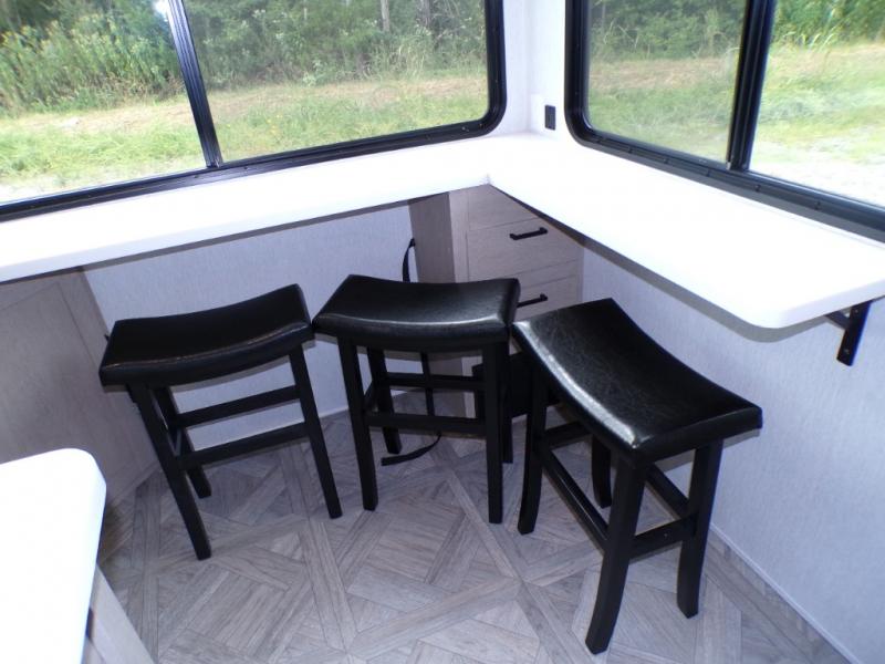 Enjoy your surroundings with 64 square feet of windows! So, no matter where you park, you can easily bring the outdoors right inside. The rear kitchen features 18 linear feet of wrap-around counter space including a double sink and three burner cook-top with an overhead microwave oven. There are bar stools for dining inside along the rear counter, and an L-shaped sofa for additional seating in the open living area. Here, behind the entertainment center, is a multi-purpose space hidden behind a shiplap wall features with fireplace including a hinged top mattress above a lower bunk, a desk beneath the mattress if you need office space during the day, and storage cubbies for your things, all within the Versa-Slide that also houses an oversized refrigerator for all of your perishables. The front private bedroom features a Versa-Tilt custom king bed with dual nightstands and closets, plus overhead storage. You will also find additional storage in a large pass-through beneath on the exterior. Choose an optional exterior outdoor kitchen if you like, and the 18' awning will be a great feature for added living space keeping you protected from rain or the suns rays on a bright and sunny day.