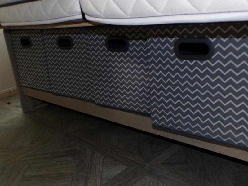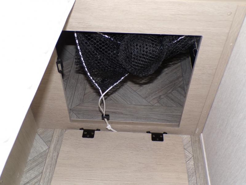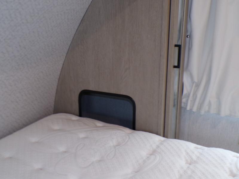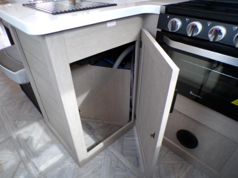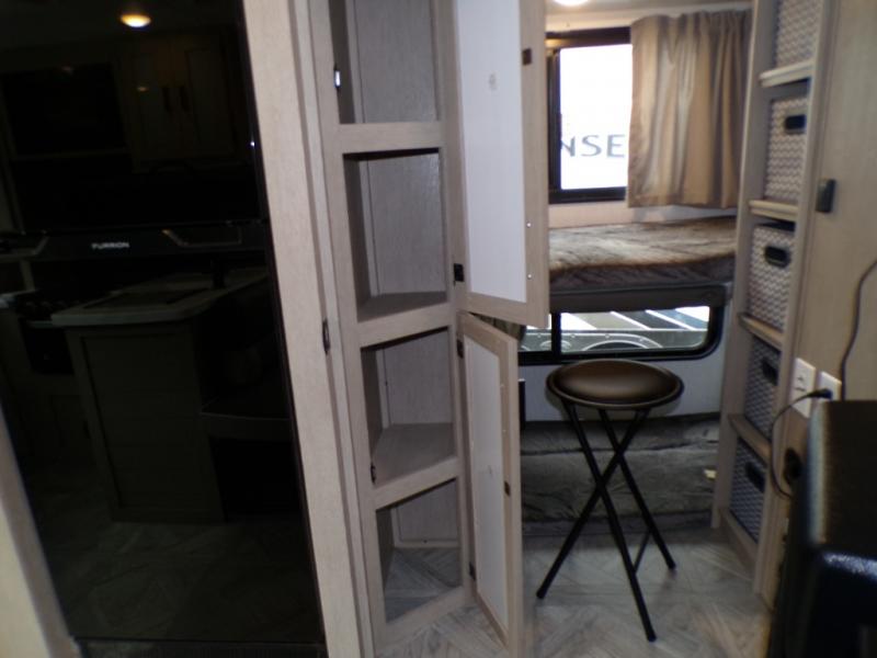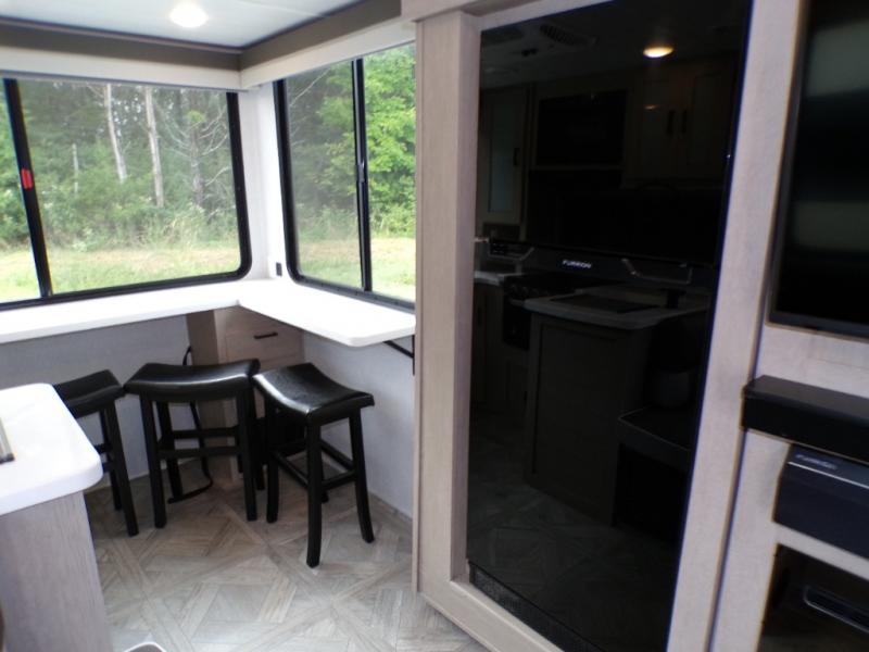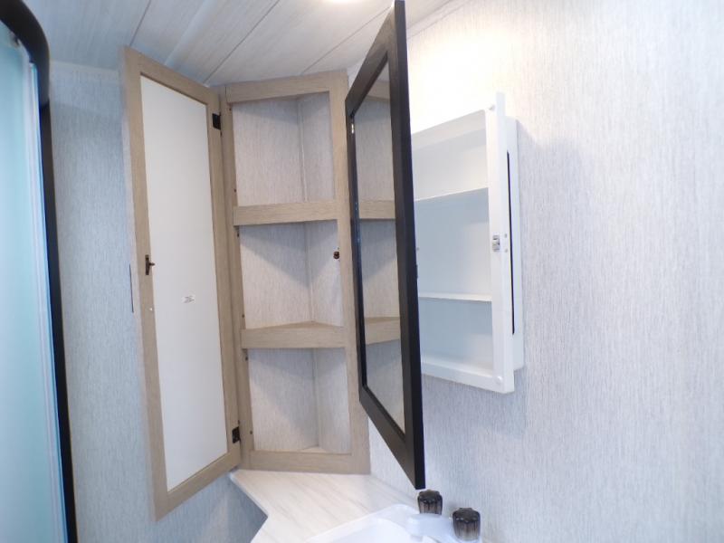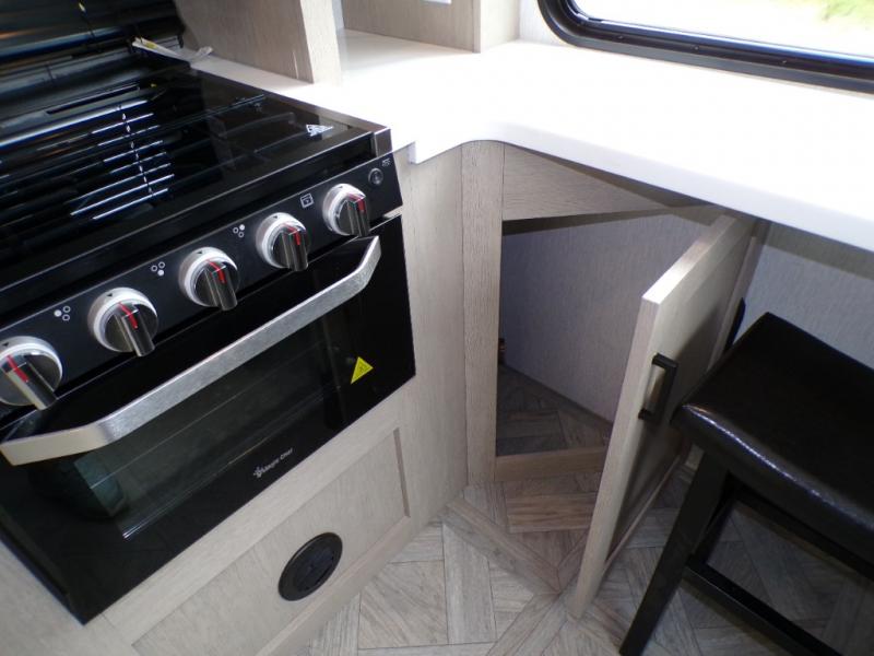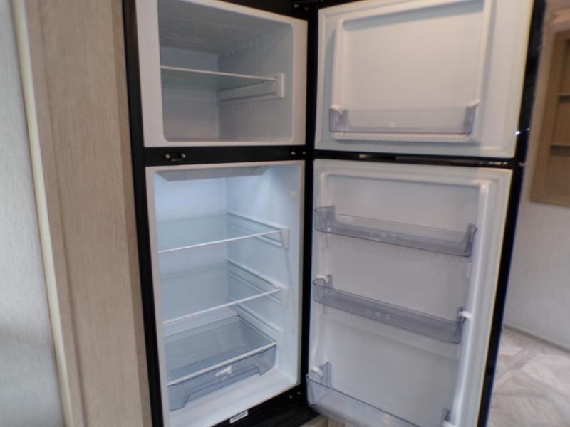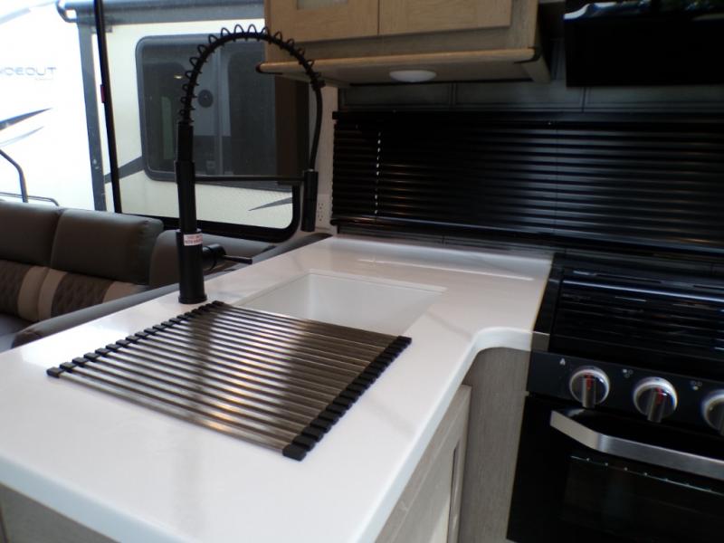 Enjoy your surroundings with 64 square feet of windows! So, no matter where you park, you can easily bring the outdoors right inside. The rear kitchen features 18 linear feet of wrap-around counter space including a double sink and three burner cook-top with an overhead microwave oven. There are bar stools for dining inside along the rear counter, and an L-shaped sofa for additional seating in the open living area. Here, behind the entertainment center, is a multi-purpose space hidden behind a shiplap wall features with fireplace including a hinged top mattress above a lower bunk, a desk beneath the mattress if you need office space during the day, and storage cubbies for your things, all within the Versa-Slide that also houses an oversized refrigerator for all of your perishables. The front private bedroom features a Versa-Tilt custom king bed with dual nightstands and closets, plus overhead storage. You will also find additional storage in a large pass-through beneath on the exterior. Choose an optional exterior outdoor kitchen if you like, and the 18' awning will be a great feature for added living space keeping you protected from rain or the suns rays on a bright and sunny day.