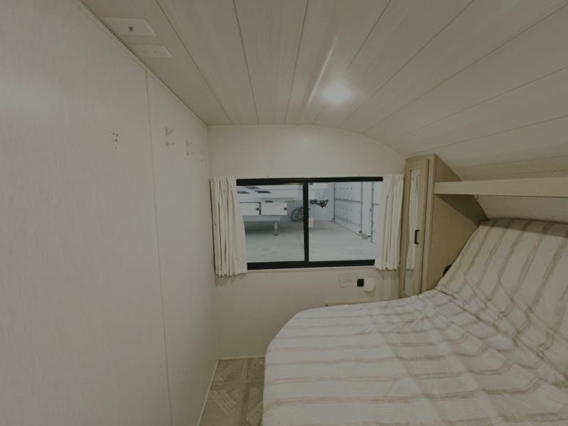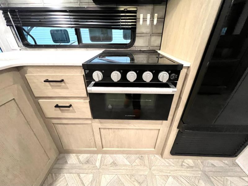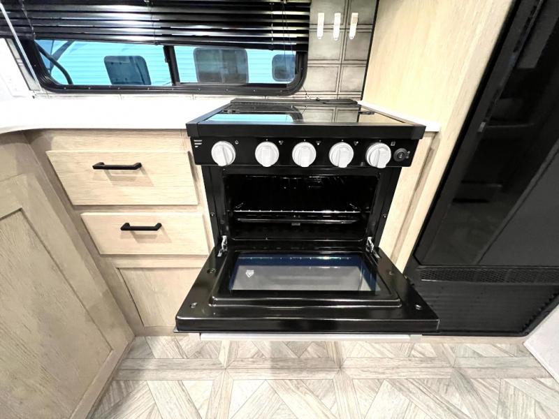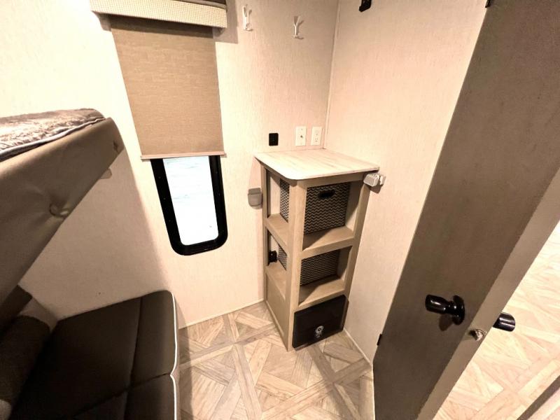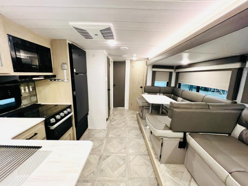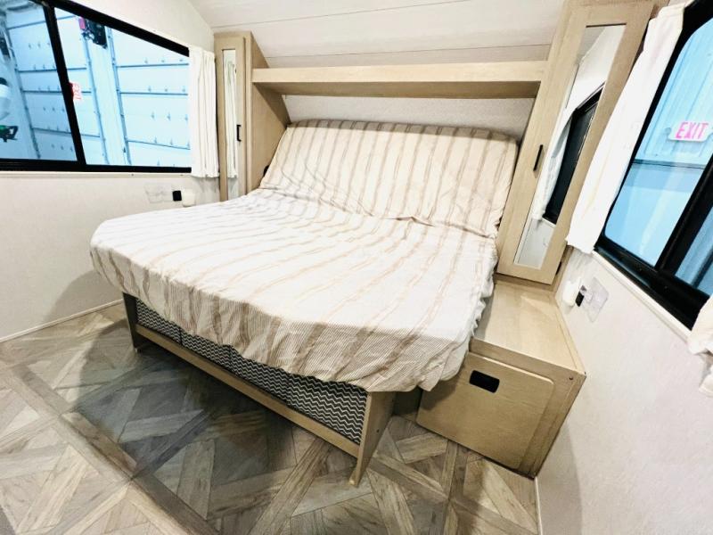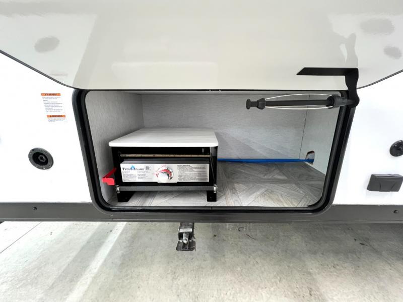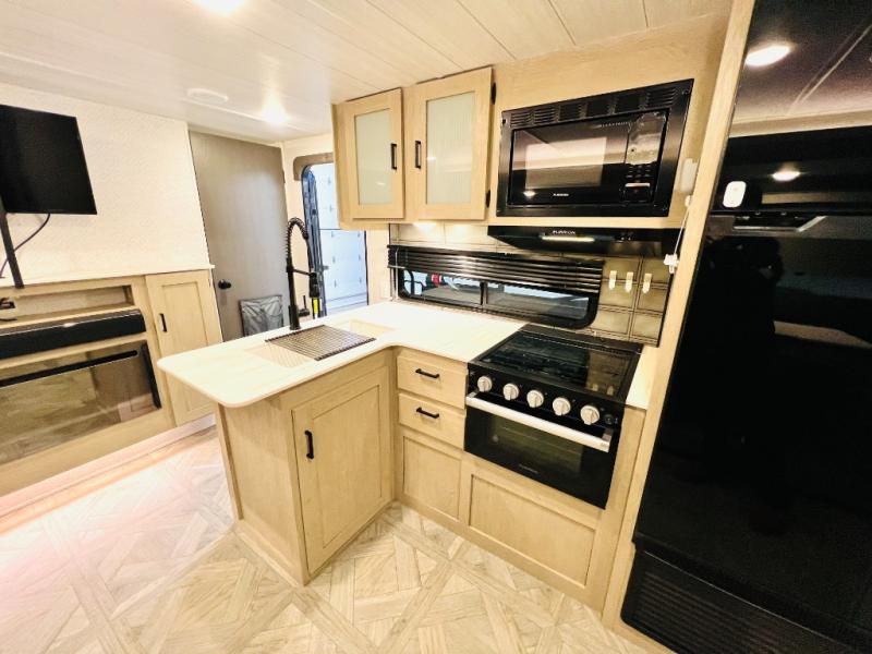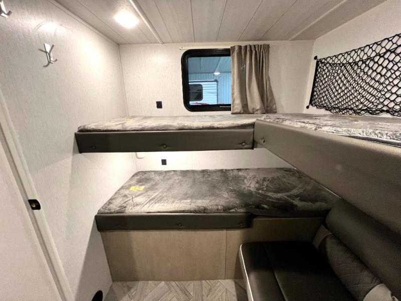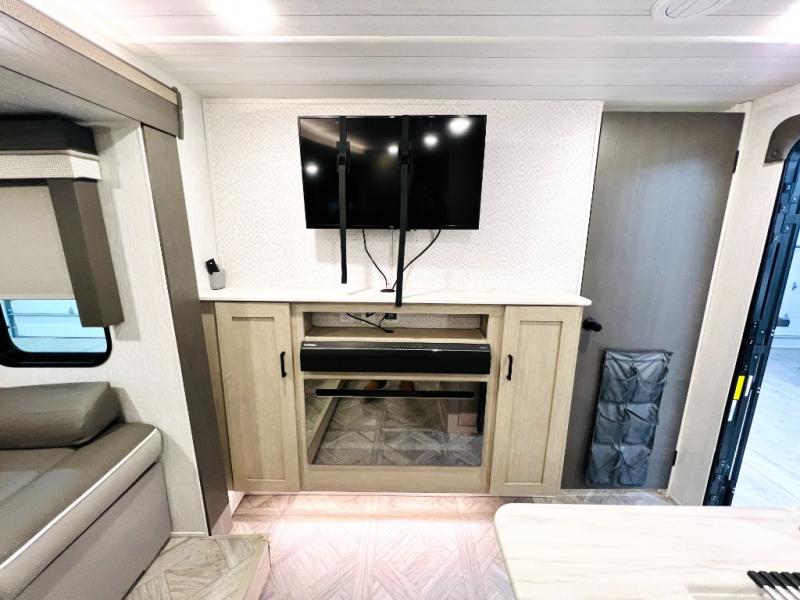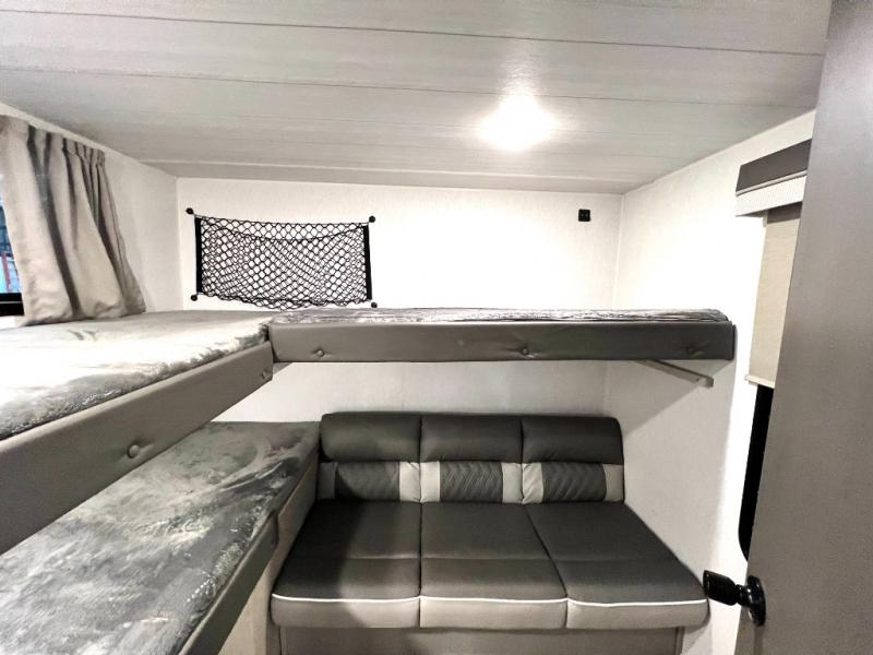This versatile bunkhouse travel trailer is big enough for the whole family, but still light in weight! The private bunkhouse has a set of 30" x 74" bunk beds and a 30" x 74" bunk bed above a Jiffy sofa. Just outside the bunkhouse is a pantry big enough to store everyone's favorite snacks, and a full bathroom with a walk-in shower. The three burner cooktop is just waiting for you to create a delicious meal, and the U-shaped dinette welcomes everyone to enjoy each meal in comfort, plus there is a large panoramic window for a perfect view of your surroundings. Any time of day kick back on the Versa-lounge and relax by the fireplace at the entertainment center. The exterior features a pass-through storage area for you to keep your outdoor camping gear stowed away when not in use, a 16' power awning to protect you, and an exterior camp kitchen!