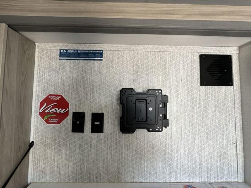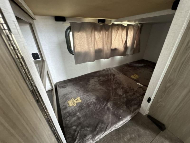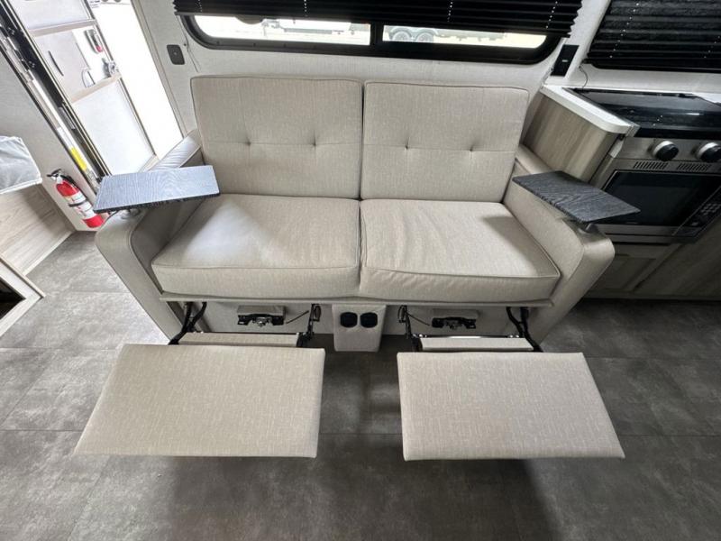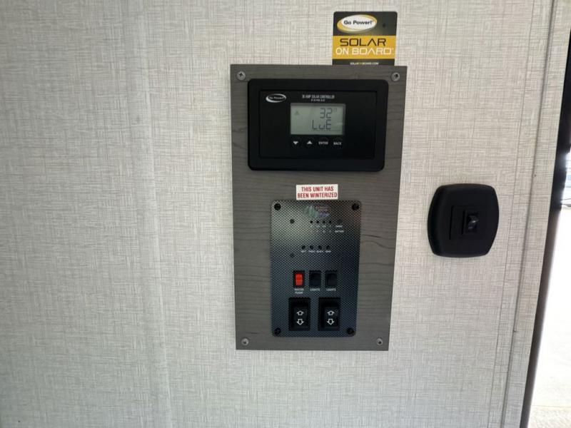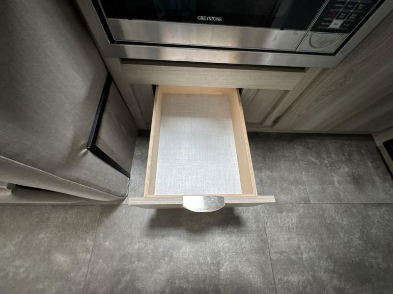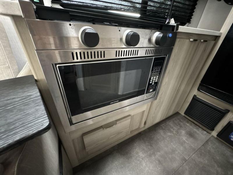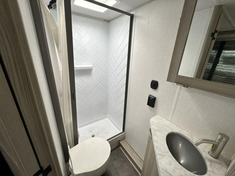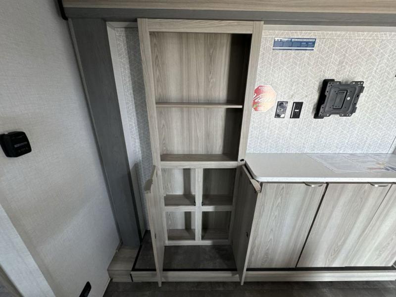 Perfect for your family, this single slide with split bunk and queen bed provides your family comfortable sleeping for four, and the slide adds a bit more interior space in camp. The split bunk is located behind the spice rack door and TV for your entertainment and cooking needs. Speaking of cooking, you can prepare your best home cooked meals with the cooktop, and store any leftovers in the dual swinging 12V refrigerator. Relax each night in the theater seating and freshen up in the rear corner bathroom each morning which features a skylight over the shower for more natural lighting.