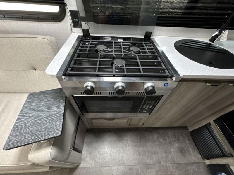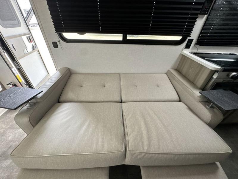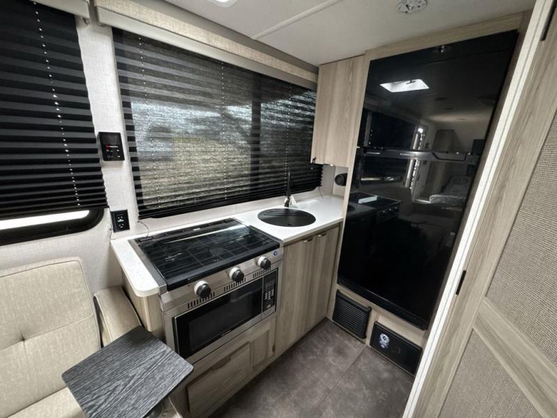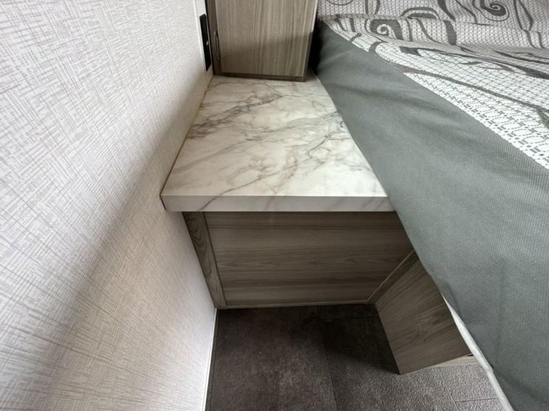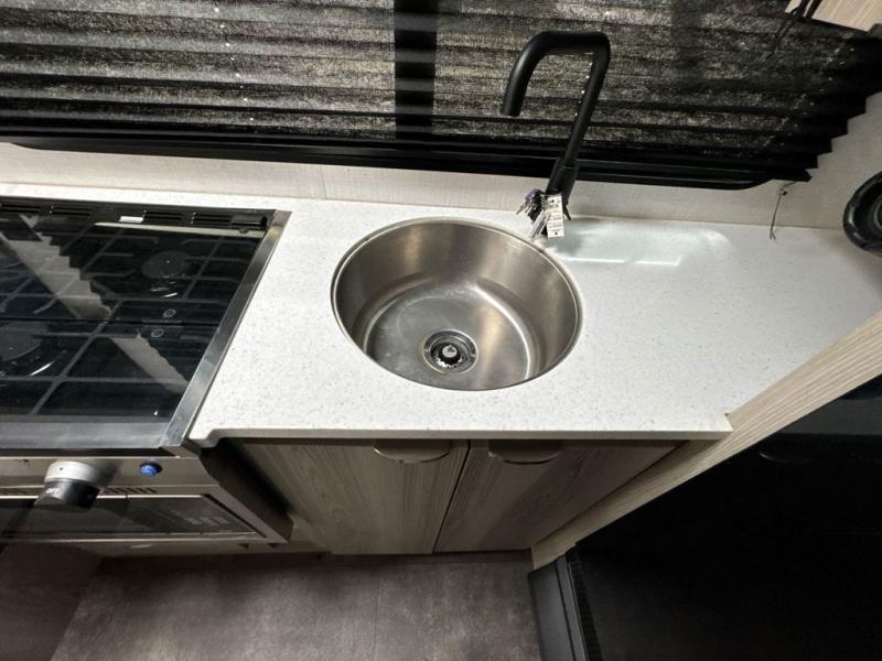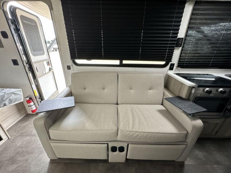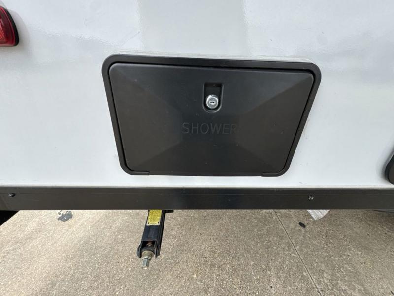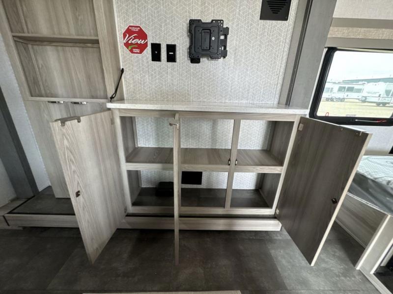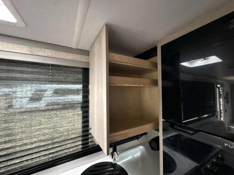 Perfect for your family, this single slide with split bunk and queen bed provides your family comfortable sleeping for four, and the slide adds a bit more interior space in camp. The split bunk is located behind the spice rack door and TV for your entertainment and cooking needs. Speaking of cooking, you can prepare your best home cooked meals with the cooktop, and store any leftovers in the dual swinging 12V refrigerator. Relax each night in the theater seating and freshen up in the rear corner bathroom each morning which features a skylight over the shower for more natural lighting.