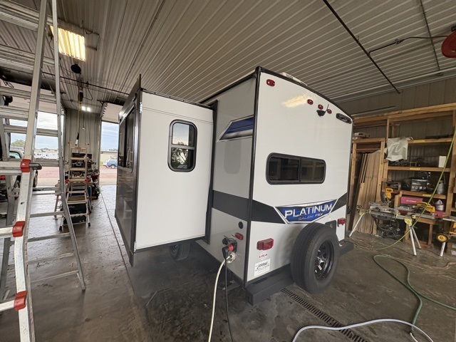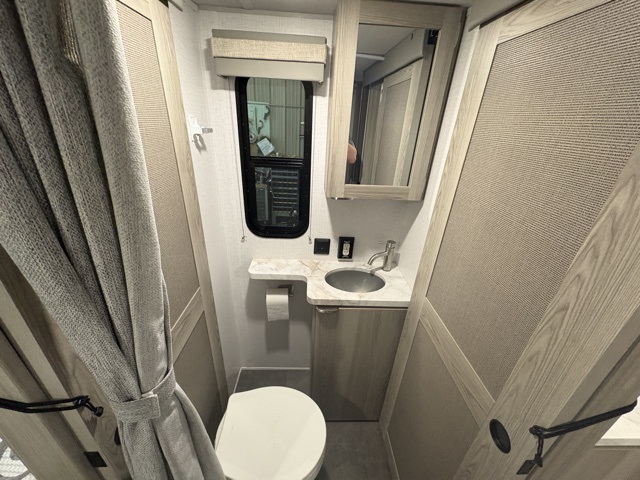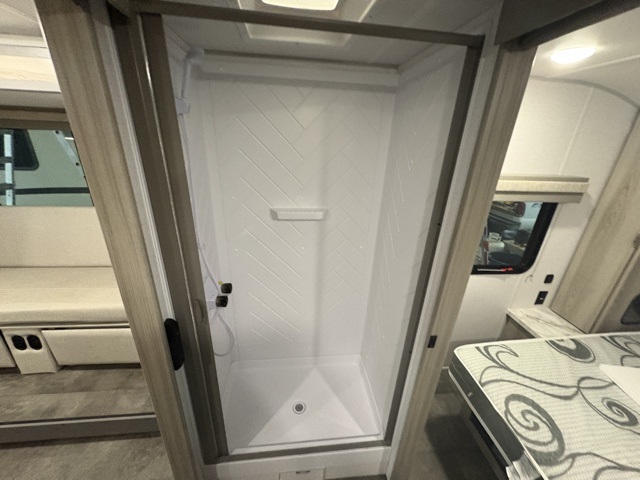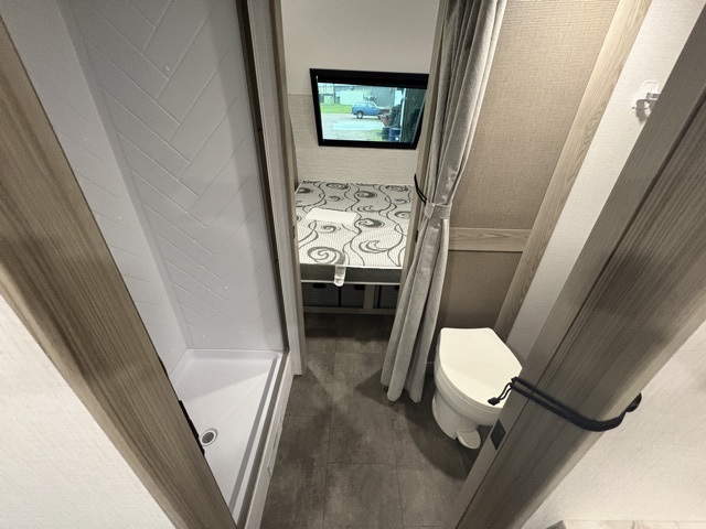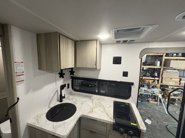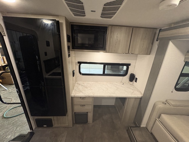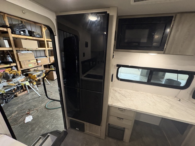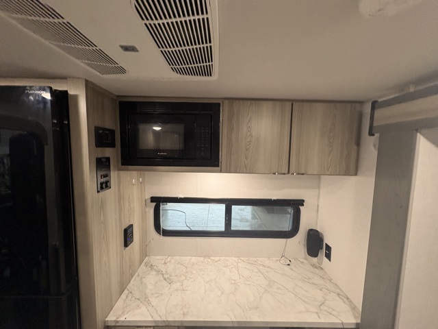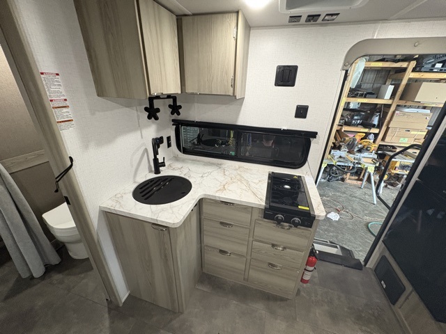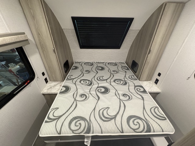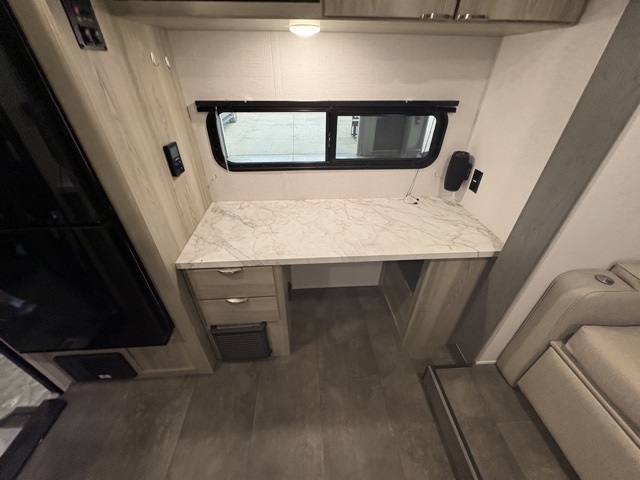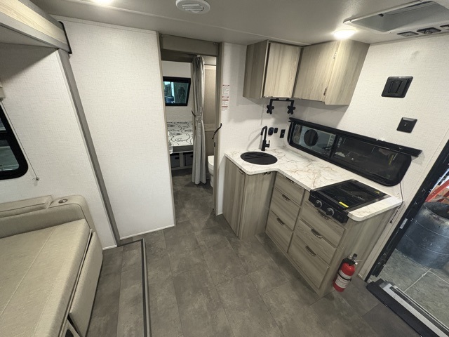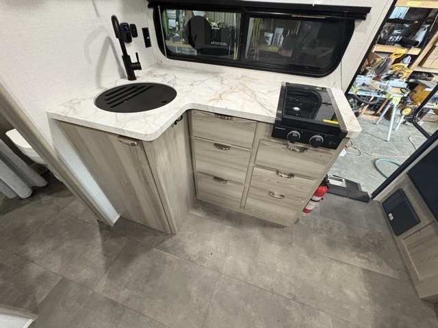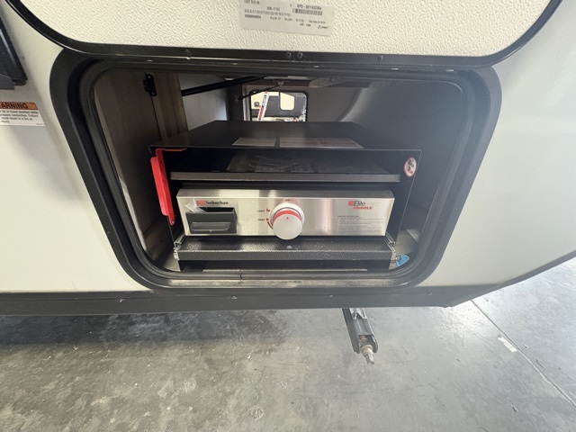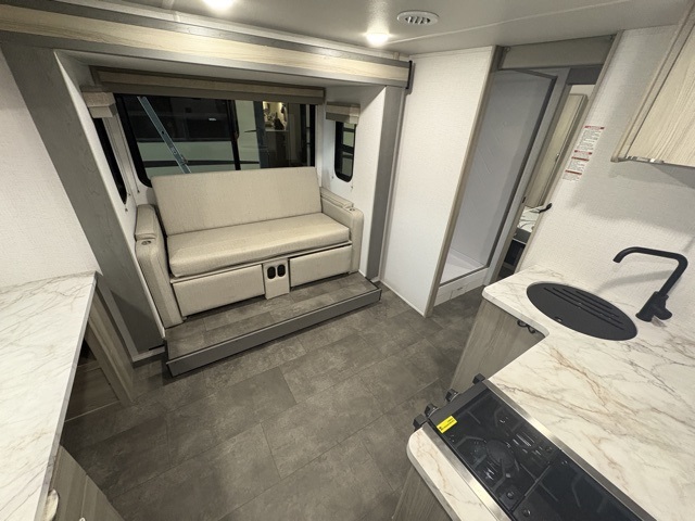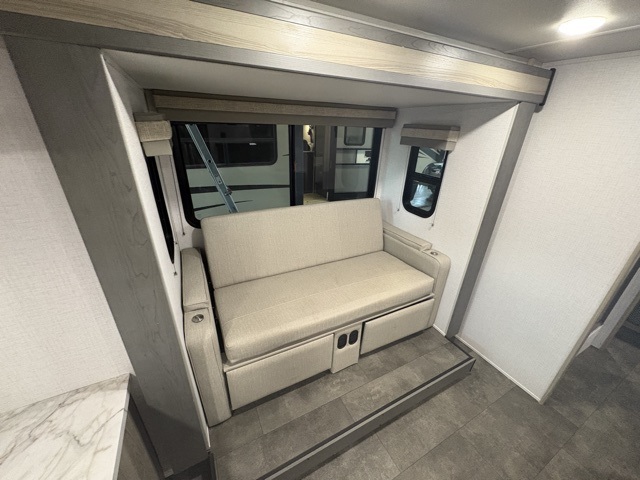 You're going to love every minute spent in this couple's trailer. The queen bed in the front private bedroom will provide a great night's rest, and there are dual wardrobes to easily get dressed in the morning. Head to the kitchen through the bath, then prepare eggs and bacon on the two burner cooktop. There is theater seating here to enjoy your coffee at each morning, or you may want to get some work done at the mobile workstation!