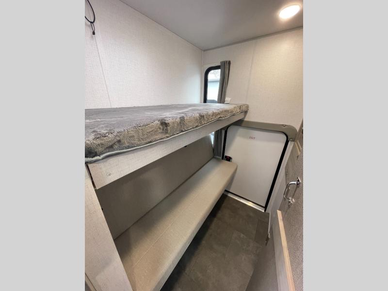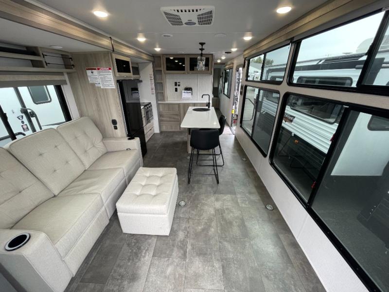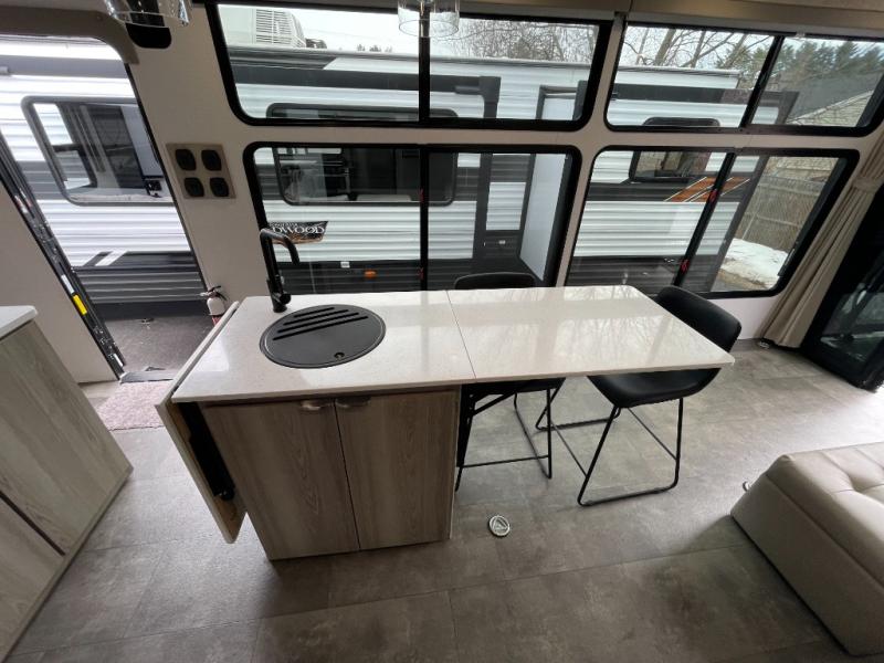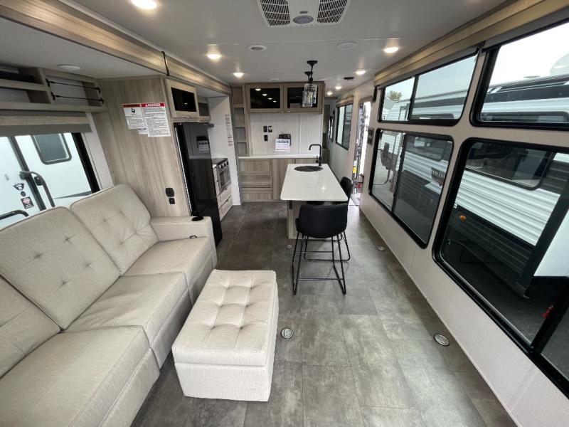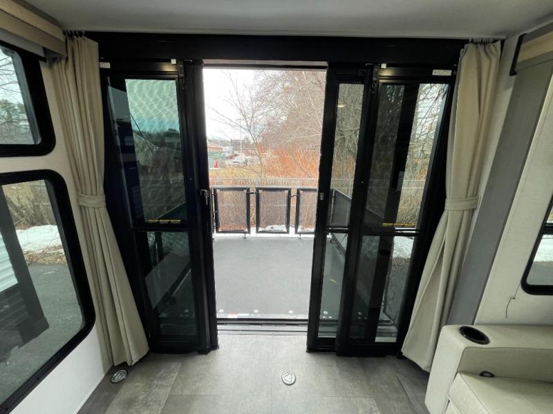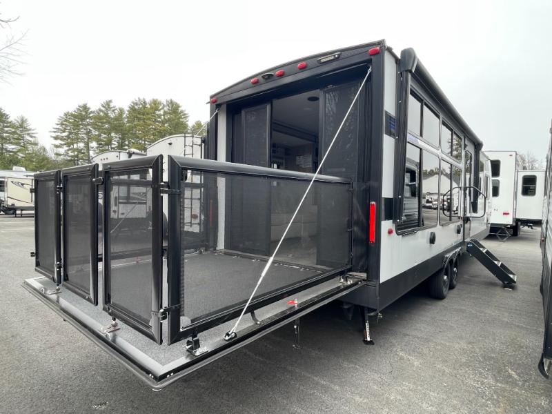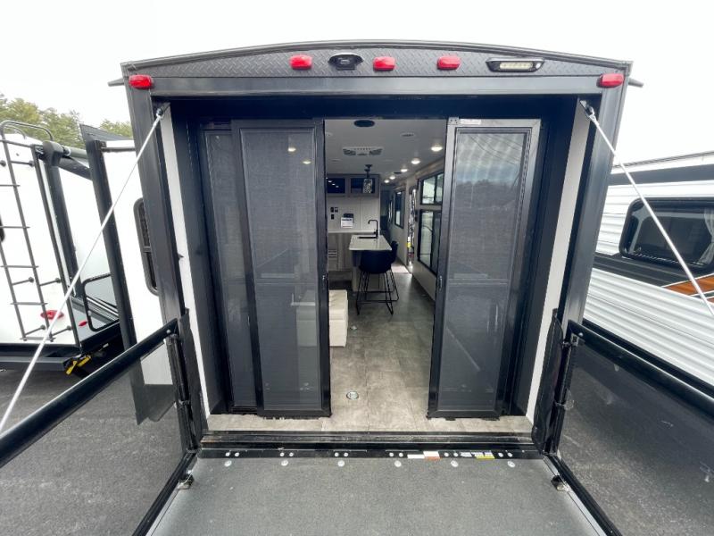 There is a lot to love about this toy hauler! Starting with the 1,500 lb. patio with a three seasons door that leads into the garage area. Once you remove your off-road toy from the 1,500 lb. tie downs, you can open up the slide that houses theater seating with a chaise lounge, a dual swinging 12V refrigerator, and cooktop. The kitchen also has a hutch and island with sink and flip-up countertop. You even have a movie theater projector with premium sound to watch your favorite movies in style. The set of bunk beds have their own privacy with a secret door to access them and a bike door for outside access. Everyone can freshen up with the large shower in the full bathroom. The front private bedroom has a king bed with Versa tilt, wardrobes on either side of the bed, and another wardrobe to keep your clothes looking their best!