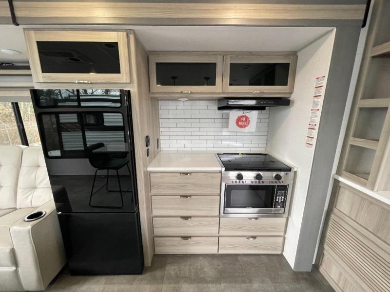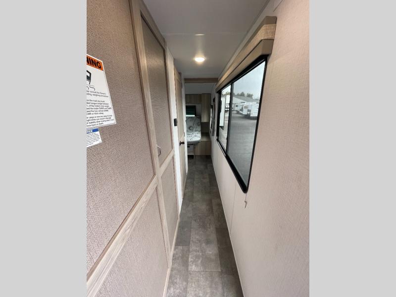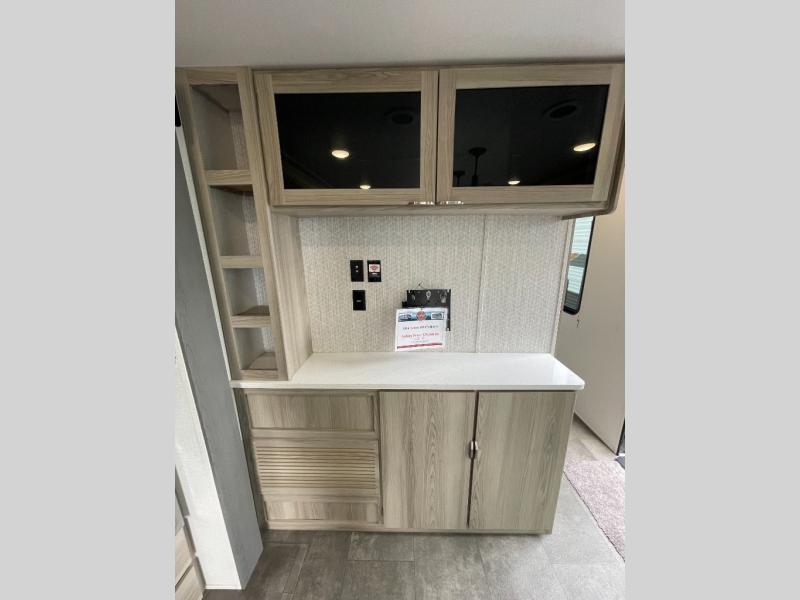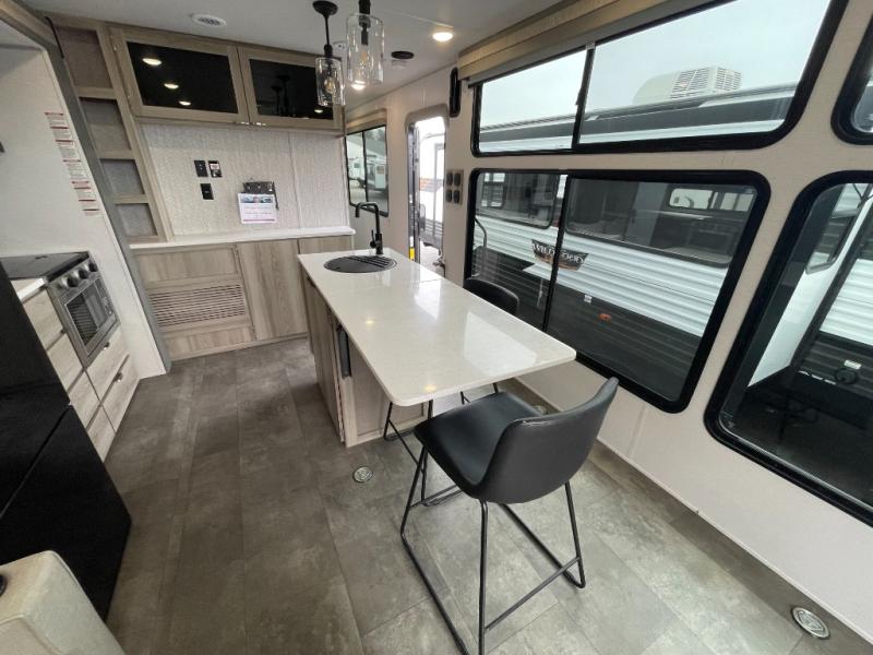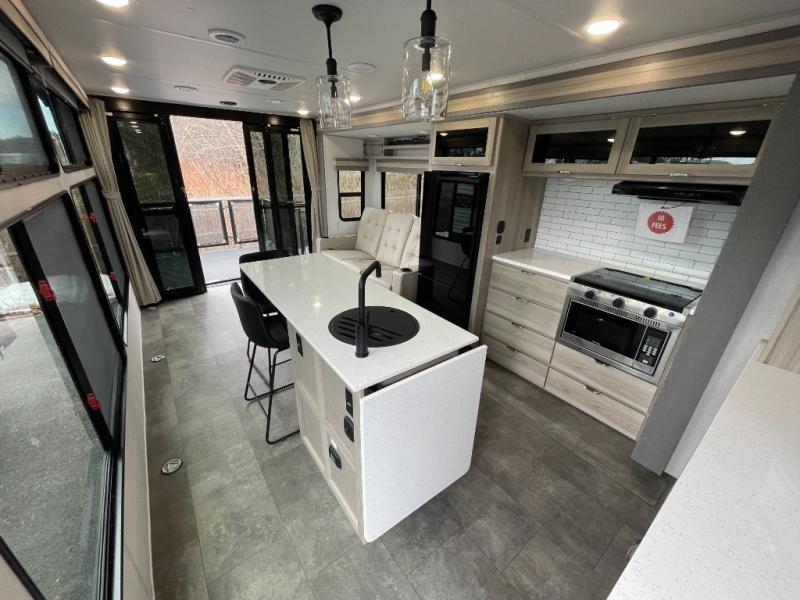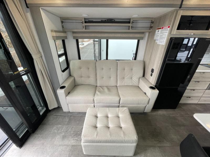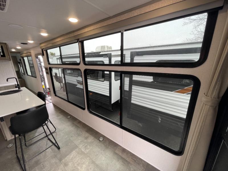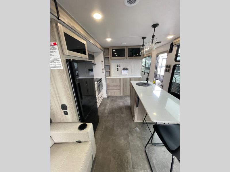 There is a lot to love about this toy hauler! Starting with the 1,500 lb. patio with a three seasons door that leads into the garage area. Once you remove your off-road toy from the 1,500 lb. tie downs, you can open up the slide that houses theater seating with a chaise lounge, a dual swinging 12V refrigerator, and cooktop. The kitchen also has a hutch and island with sink and flip-up countertop. You even have a movie theater projector with premium sound to watch your favorite movies in style. The set of bunk beds have their own privacy with a secret door to access them and a bike door for outside access. Everyone can freshen up with the large shower in the full bathroom. The front private bedroom has a king bed with Versa tilt, wardrobes on either side of the bed, and another wardrobe to keep your clothes looking their best!