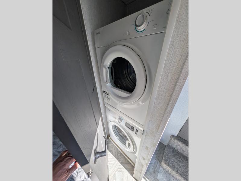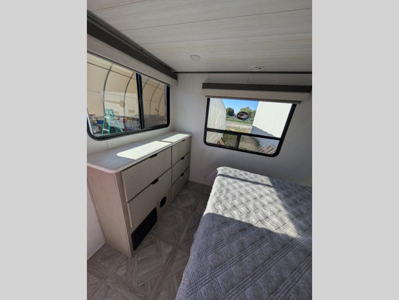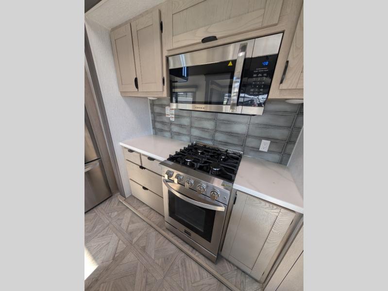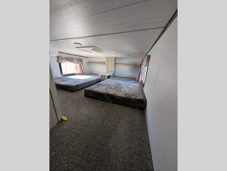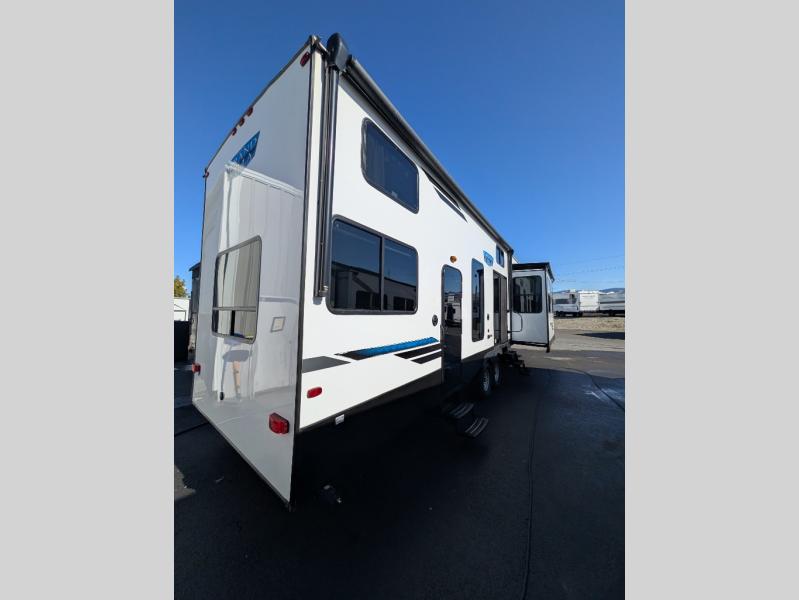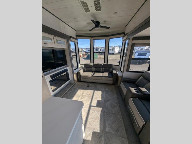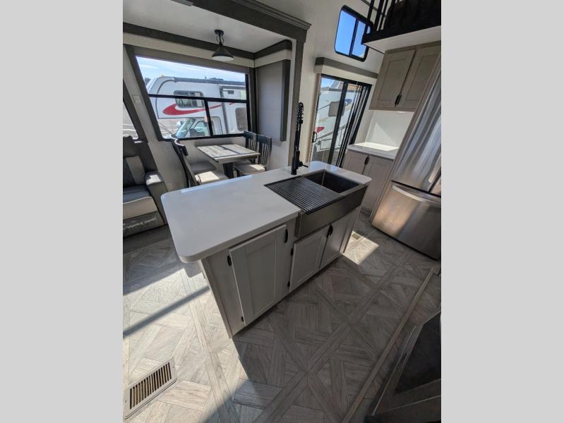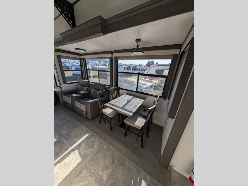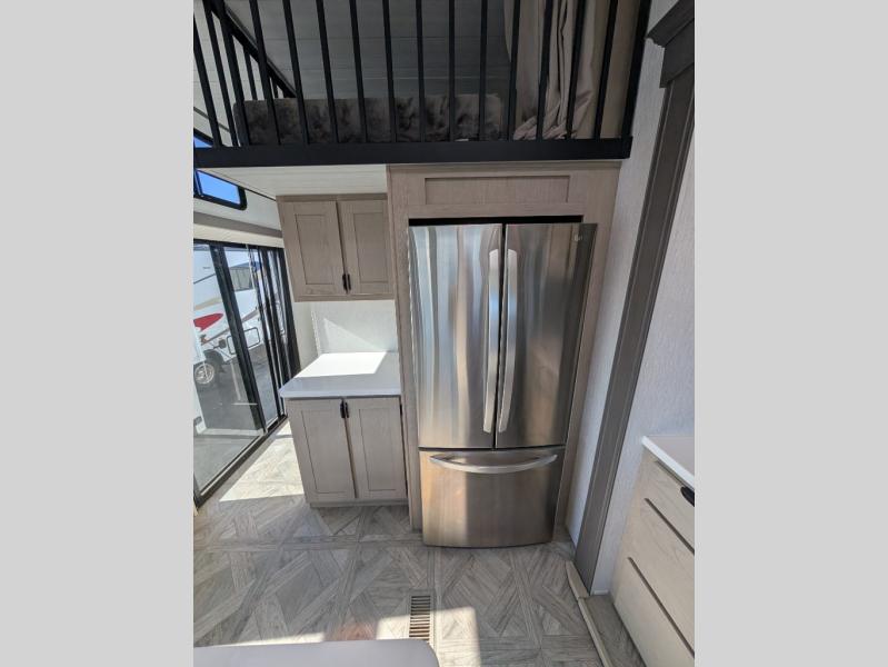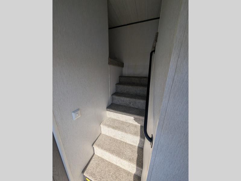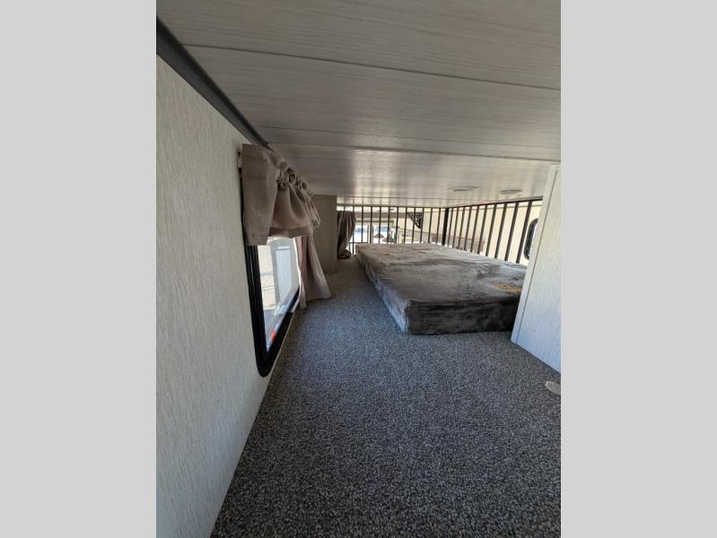 The grandkids will be begging to come along with you on your next getaway in this destination trailer! It features a double loft with three 42" x 74" bunk mats in total above the rear private bedroom. Inside the bedroom, you will find a king bed with versa-tilt slide and overhead cabinets, a closet where you can add optional washer/dryer prep in order to add the units if you like. The 50" walk-in shower with a seat will make it easy for everyone to stay fresh and clean as well. The living and kitchen area feature a kitchen island, a free standing dinette to enjoy meals and play games at, a front sofa, and theater seating across from the entertainment center with a built-in electric fireplace heater for those crisp evenings!