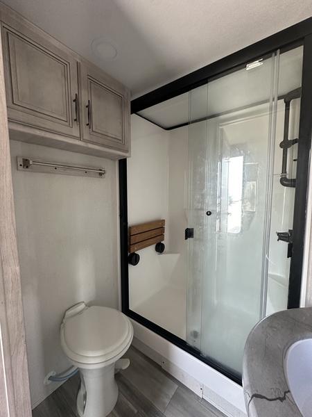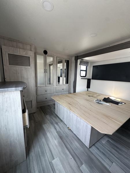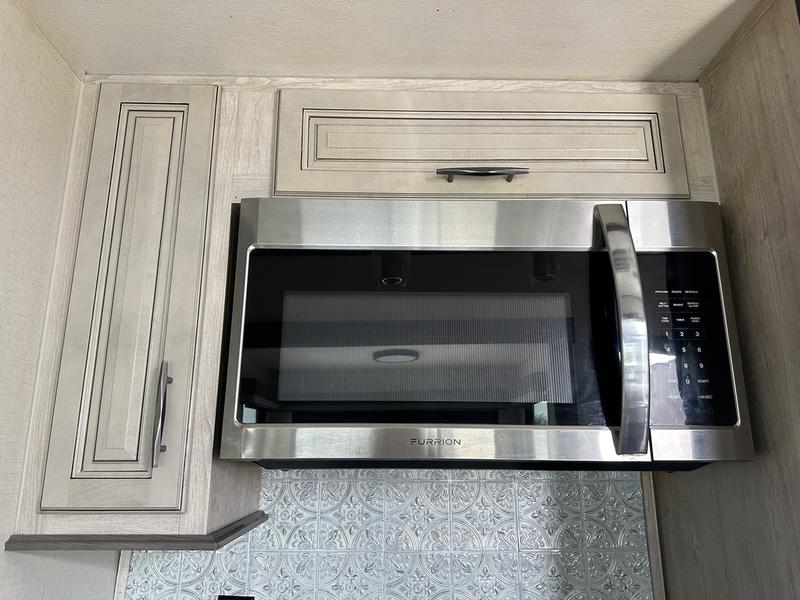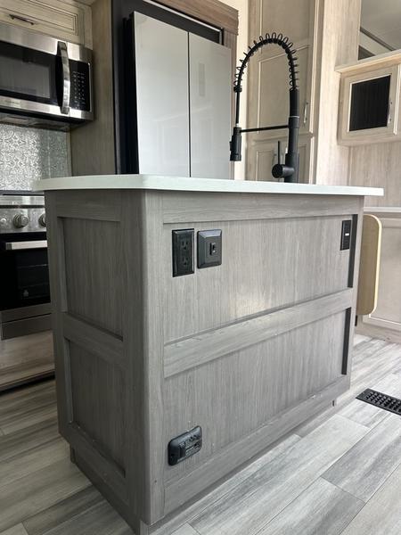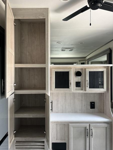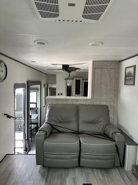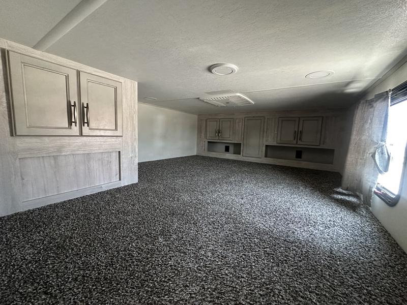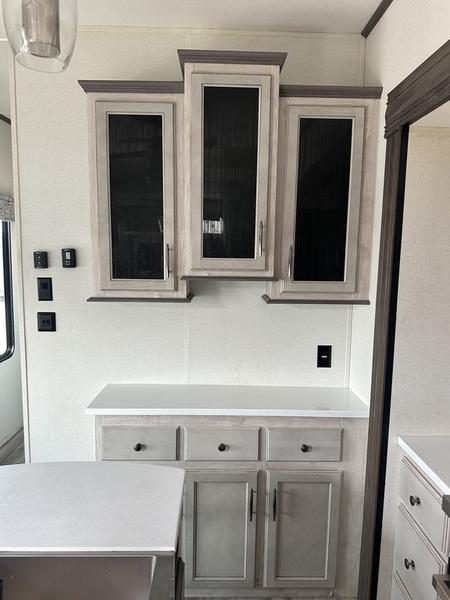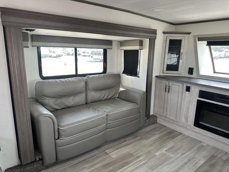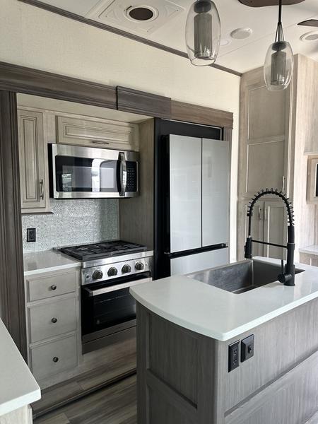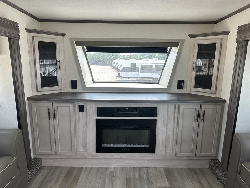 Wow! Check out this fifth wheel with a full loft for the little ones, plus a half loft that can become a play room/storage room. The main floor includes five slides for maximum space, a front living area with dual hide-a-bed sofas, plus an entertainment center with a 50" flat screen TV for movie nights! Once your guests have converted the living room to their bedroom at night, you can take the rear private bedroom. There is a king bed slide out here, plus a wardrobe, plus a closet with washer and dryer prep for full-time living. The full bath is easily accessible for everyone, and the middle kitchen will be a favorite with the chef of your group. Here, you'll find a 17 cu. ft. 12V refrigerator, an island, tons of counter space, plus a hutch to display nice dishes, and a pantry for dry goods. Don't let this fifth wheel slip away!