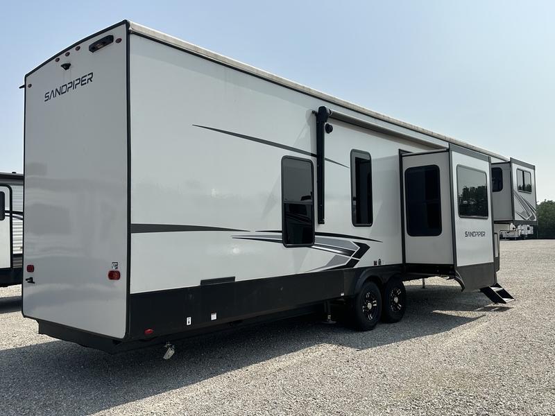 You will find the perfect balance of size, space, features, and luxury with any one of these Forest River Sandpiper fifth wheels! They are constructed with a welded aluminum framed vacuum bonded laminated superstructure, a cambered powder coated frame with rust prohibitor, and a fully enclosed underbelly to protect the units vitals during any season. The large tinted windows come with a 80/20 UV prohibitor or you can choose the optional dual pane windows. Some hassle-free amenities include a 60k BTU on-demand water heater, full coach water filter system, tire pressure monitor system, and an electric leveling system! Inside, you'll enjoy stainless steel appliances, solid surface countertops, upgraded raised panel cabinet doors, and rustic wood plank linoleum to name a few comforts!