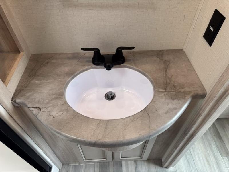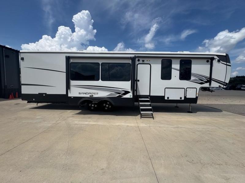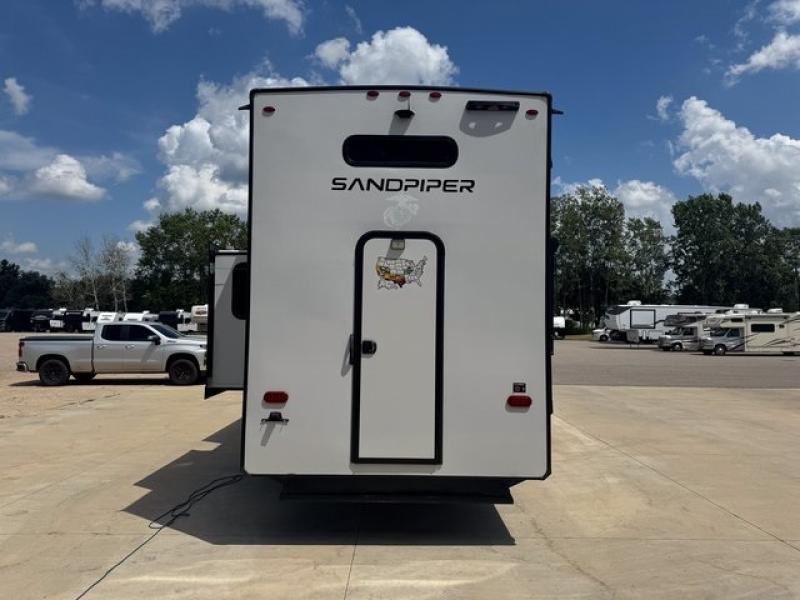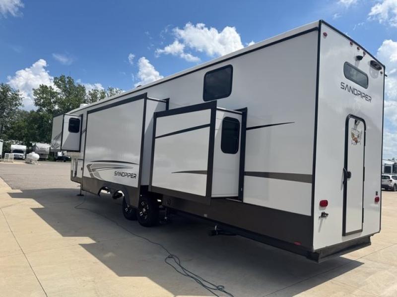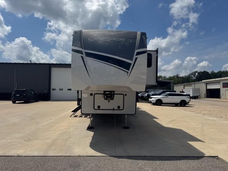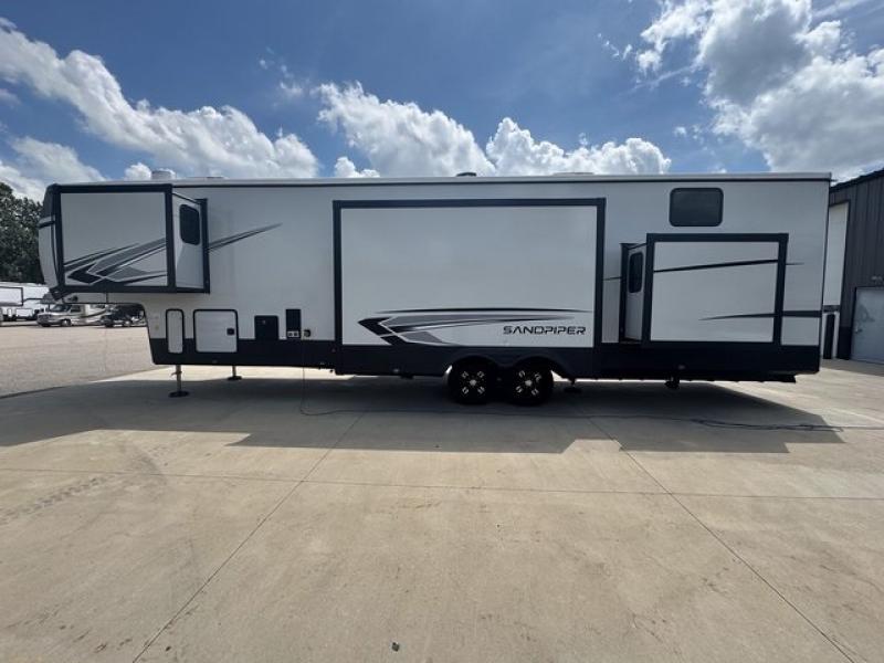 You will find the perfect balance of size, space, features, and luxury with any one of these Forest River Sandpiper fifth wheels! They are constructed with a welded aluminum framed vacuum bonded laminated superstructure, a cambered powder coated frame with rust prohibitor, and a fully enclosed underbelly to protect the units vitals during any season. The large tinted windows come with a 80/20 UV prohibitor or you can choose the optional dual pane windows. Some hassle-free amenities include a 60k BTU on-demand water heater, full coach water filter system, tire pressure monitor system, and an electric leveling system! Inside, you'll enjoy stainless steel appliances, solid surface countertops, upgraded raised panel cabinet doors, and rustic wood plank linoleum to name a few comforts!