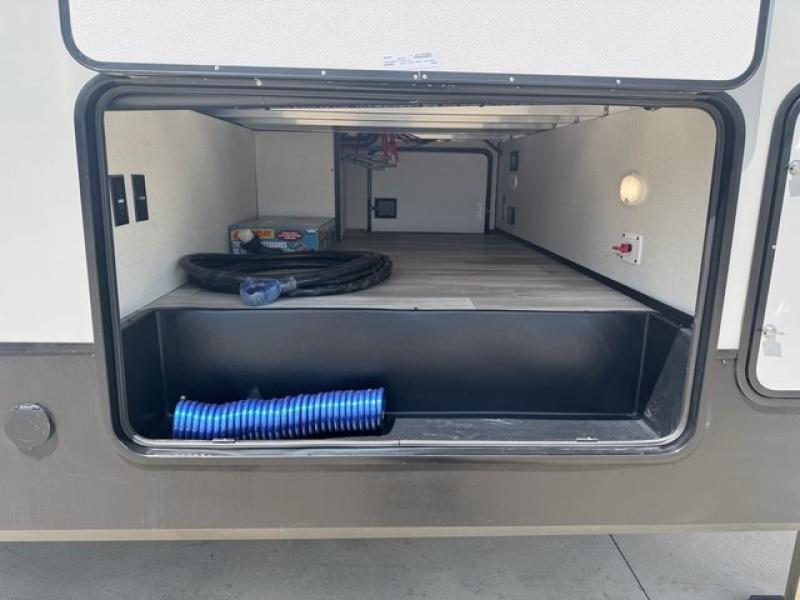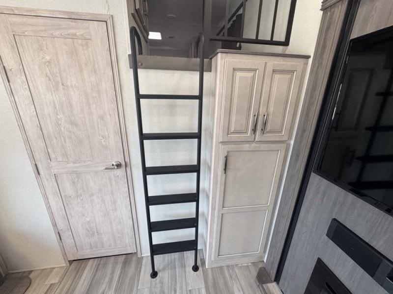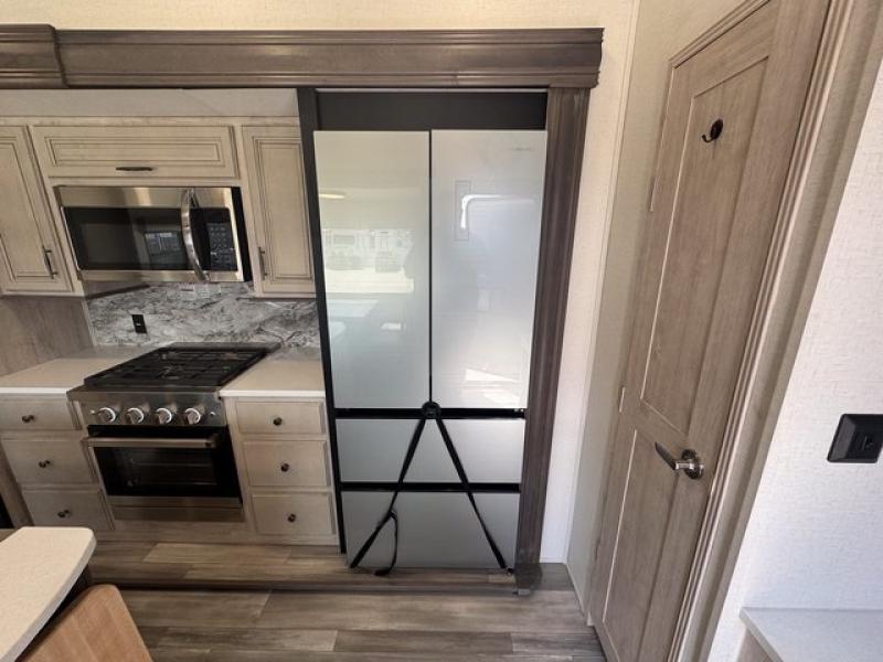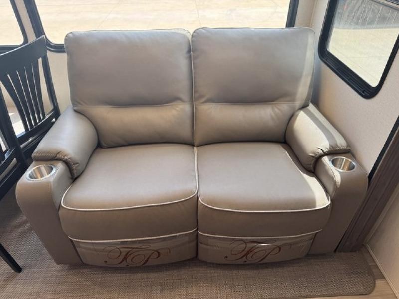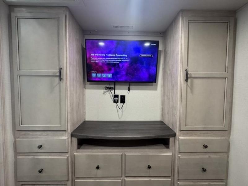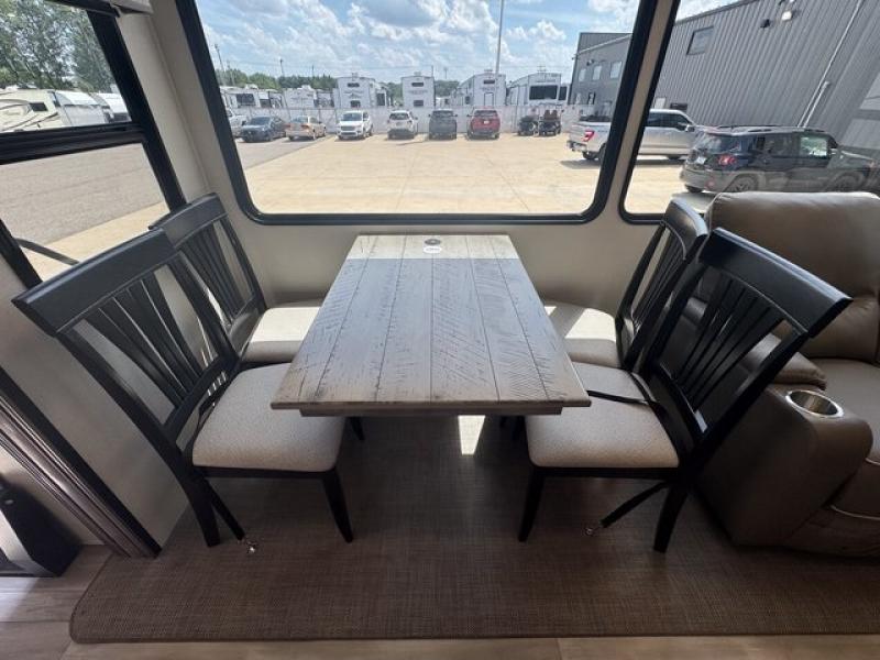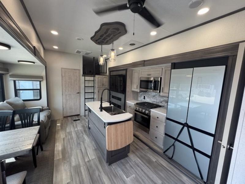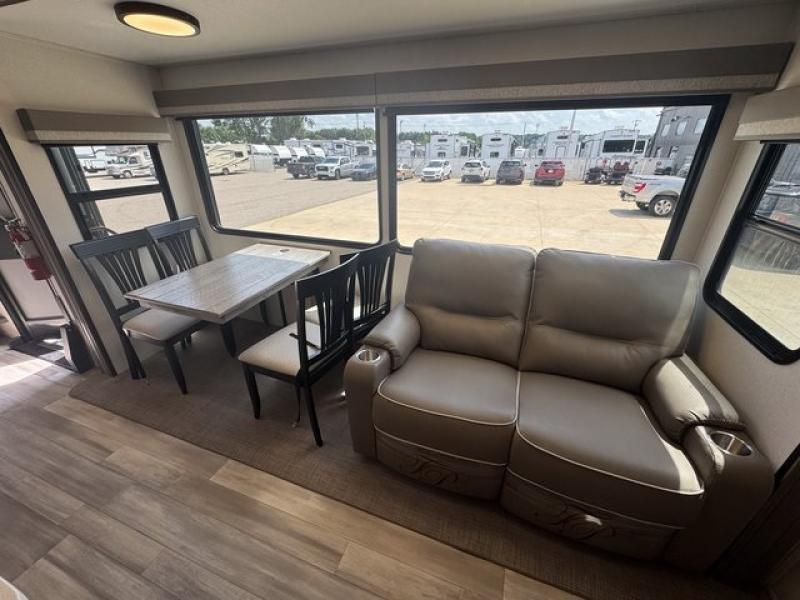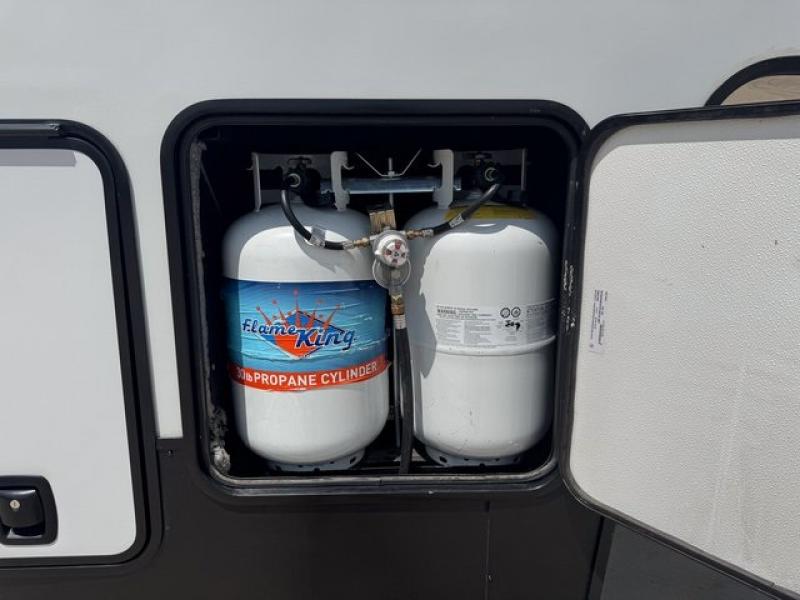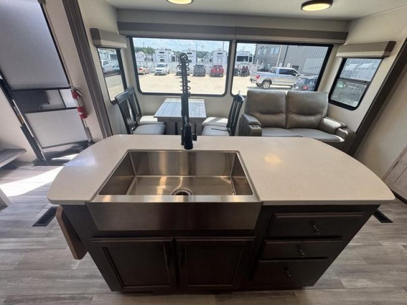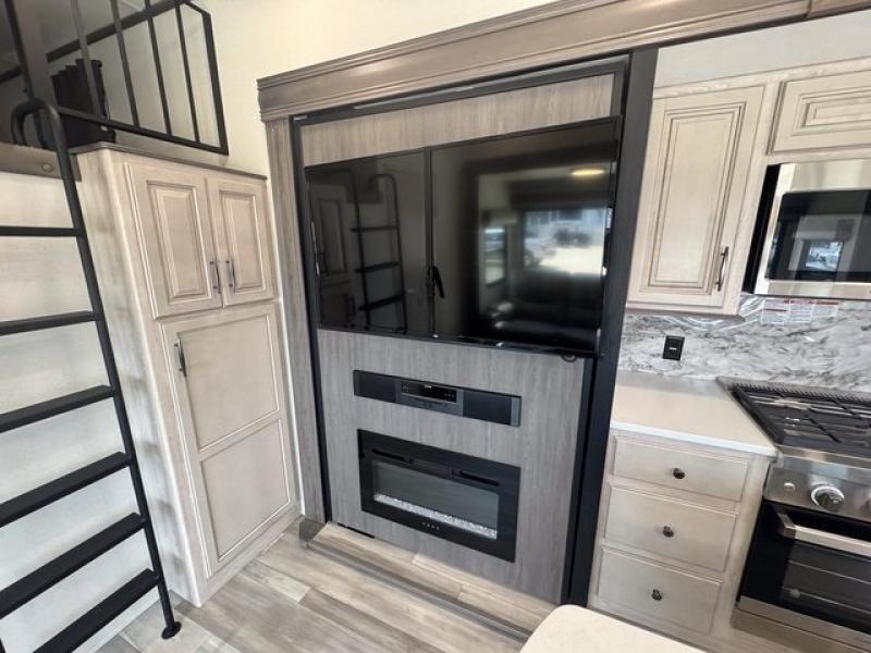 Weekend camping trips and full-time RV living is made complete in this quad slide out fifth wheel. Your crew can relax under the 15' electric awning, or head inside to enjoy the fireplace. There is also a 50" flat screen TV across from the theater seating, plus a free-standing dinette to dine at. There are two full baths with the front bath including a walk-in shower with a seat for your comfort, and the front private bedroom will feel just like home with its queen bed and large front wardrobe. There is even washer and dryer prep to make laundry day easier than ever. The master bedroom in back includes a second queen bed slide out, and the rear full bath has another convenience with it's exterior entry door, and
