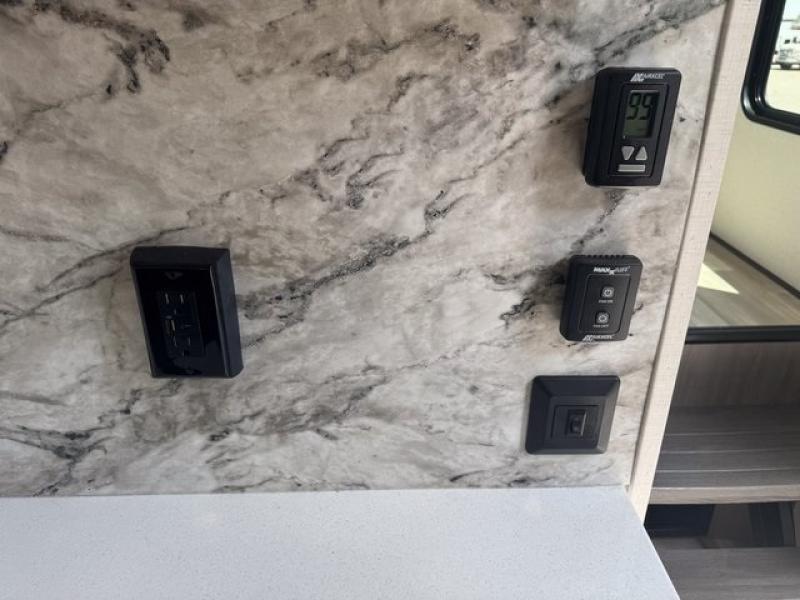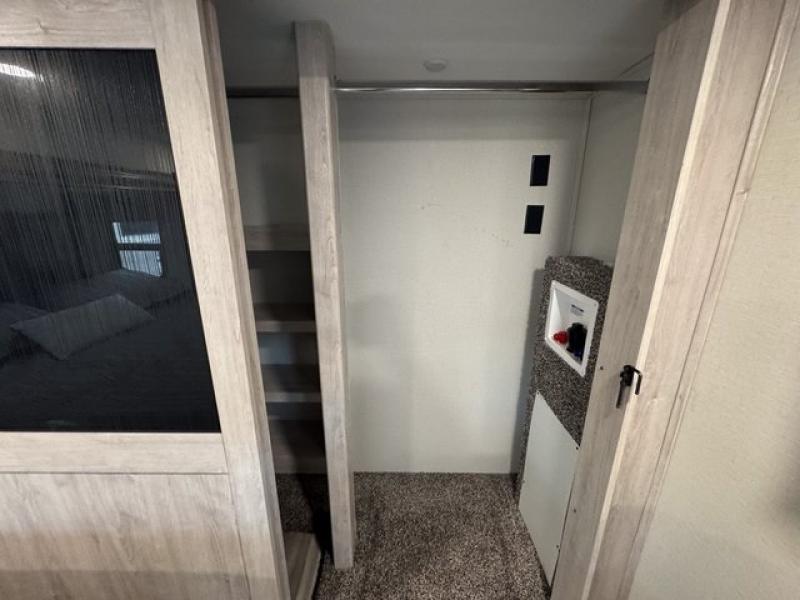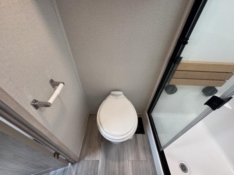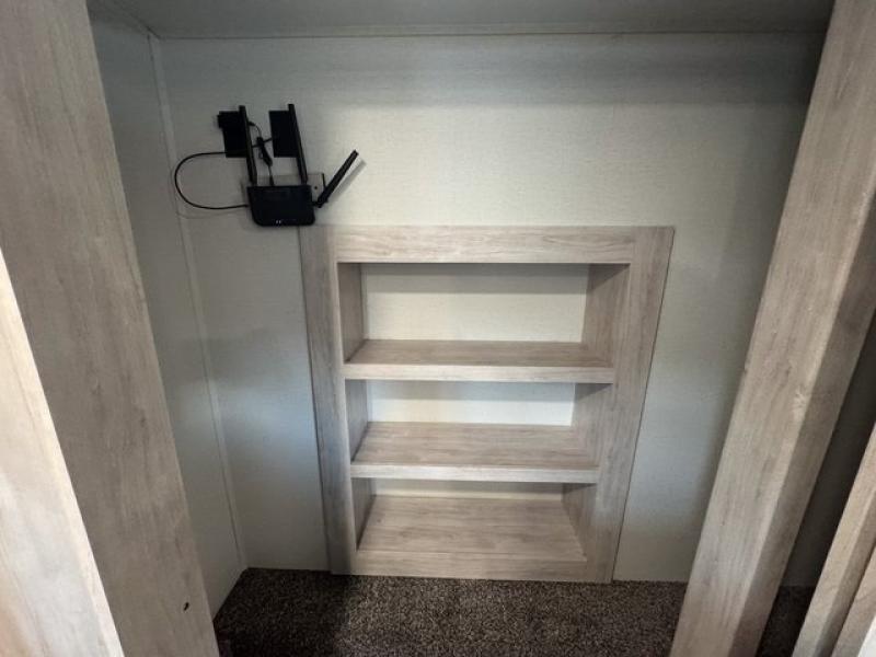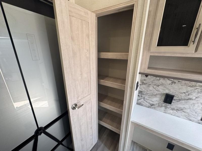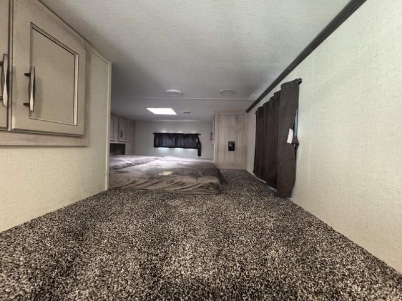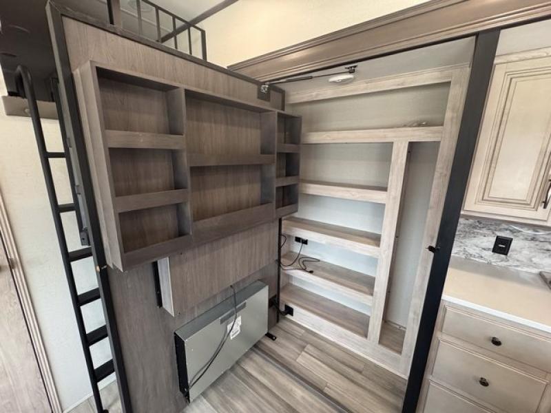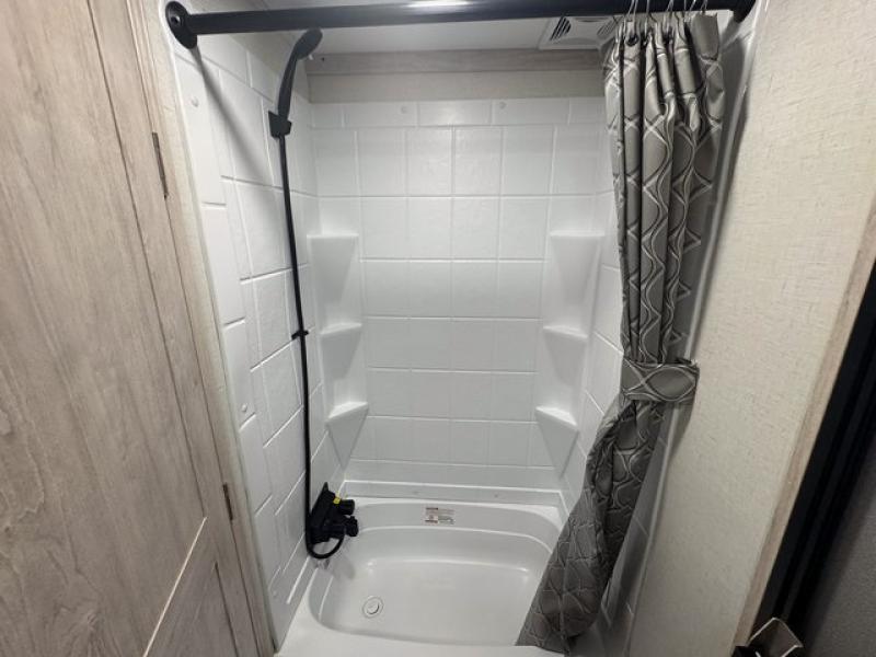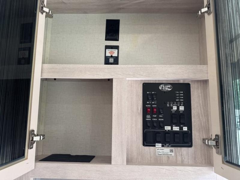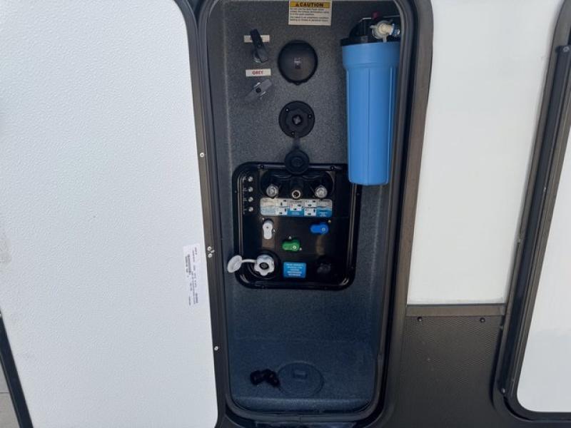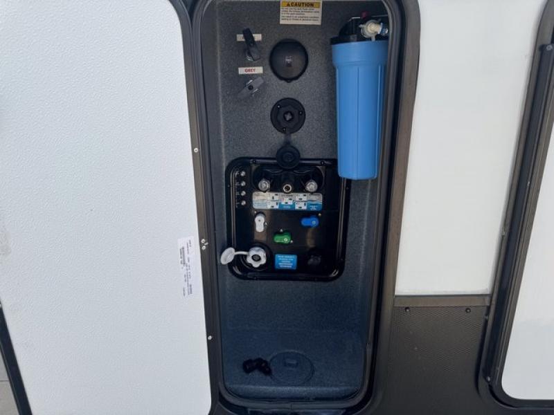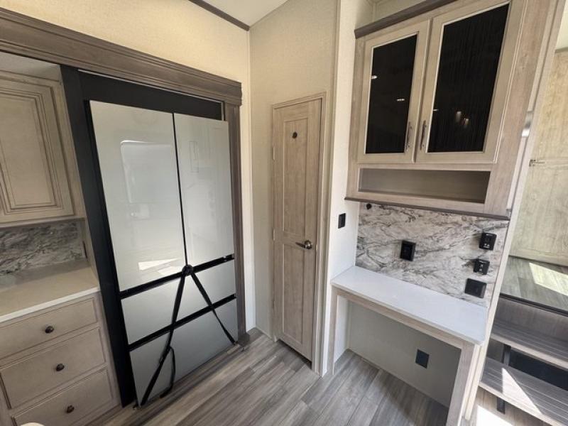 Weekend camping trips and full-time RV living is made complete in this quad slide out fifth wheel. Your crew can relax under the 15' electric awning, or head inside to enjoy the fireplace. There is also a 50" flat screen TV across from the theater seating, plus a free-standing dinette to dine at. There are two full baths with the front bath including a walk-in shower with a seat for your comfort, and the front private bedroom will feel just like home with its queen bed and large front wardrobe. There is even washer and dryer prep to make laundry day easier than ever. The master bedroom in back includes a second queen bed slide out, and the rear full bath has another convenience with it's exterior entry door, and