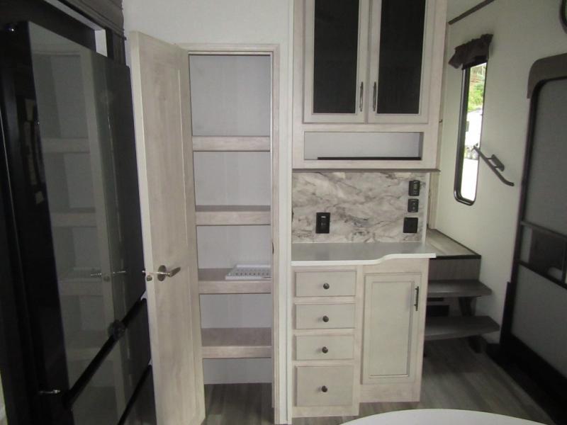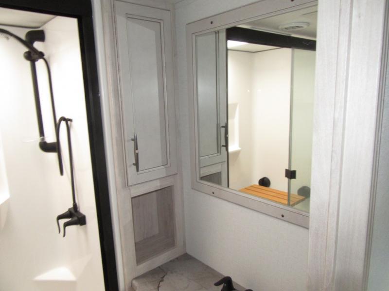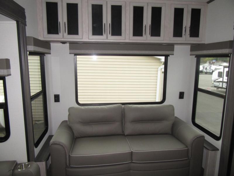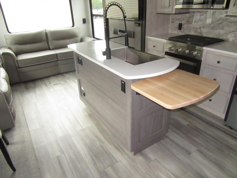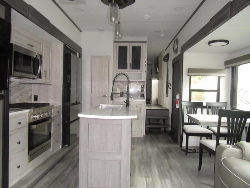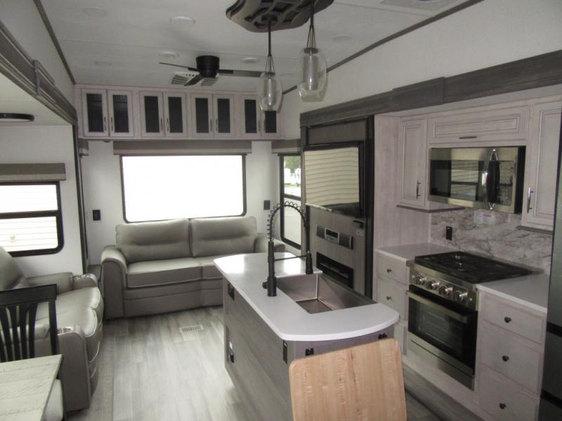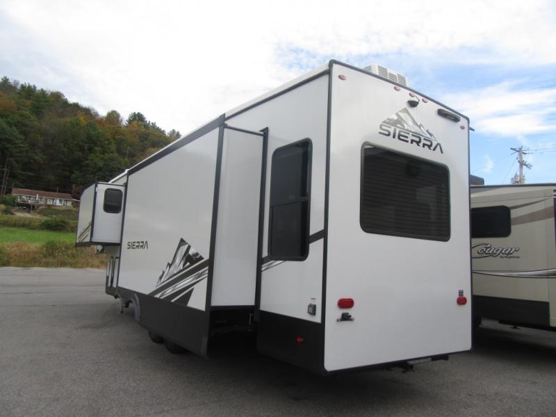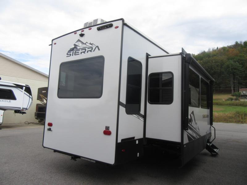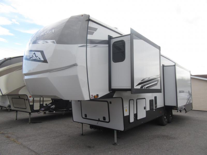 You will enjoy every adventure in this Sierra fifth wheel that is perfect for a couple that enjoys weekend or long term camping. This Sierra features triple slides for added space, a large kitchen island, plus a free standing dinette in the kitchen area which makes it feel a lot like home. When outside, you can enjoy being seated under the two power awnings with an LED light strip which is great for evening entertaining or relaxing. When it's time to get cleaned up and ready for bed, you will appreciate the spacious bath with a shower with a seat, a linen cabinet, and vanity/sink with a medicine cabinet as well. A front private bedroom with king bed slide will provide you with a great night's rest, and the large wardrobe has shelves for all your things. This model even has washer/dryer prep that will allow you to add a washer and dryer to make full-time easier than ever!
