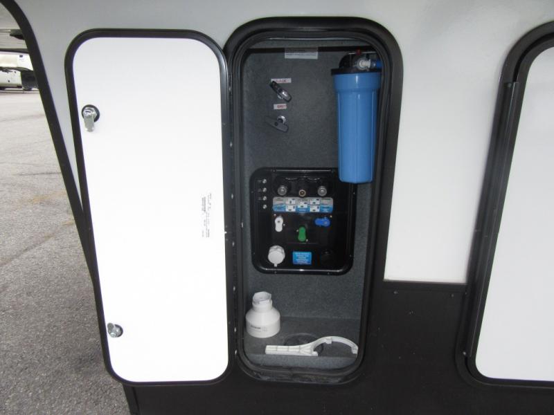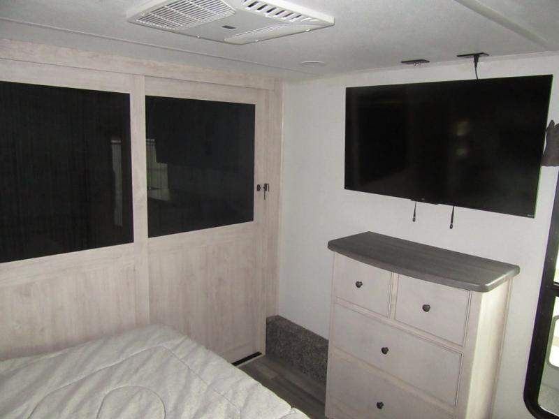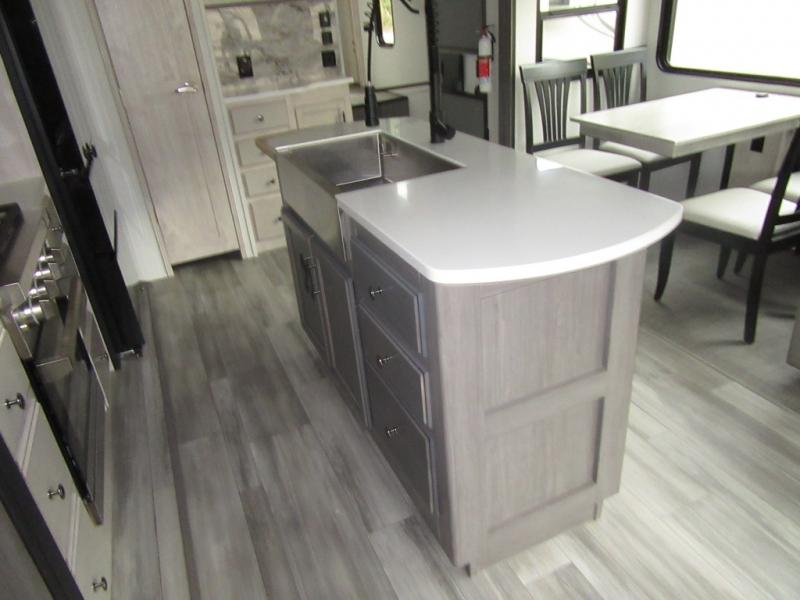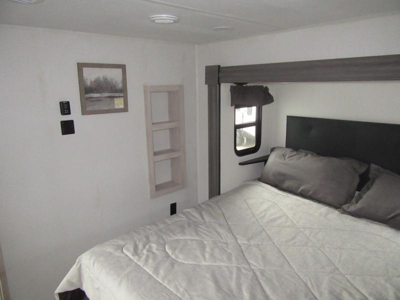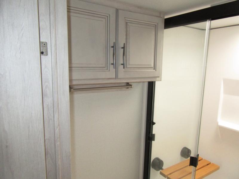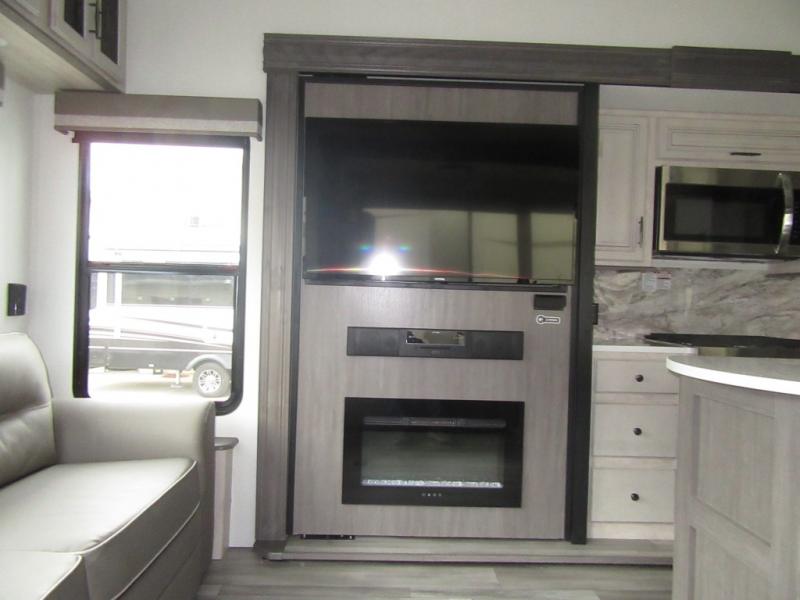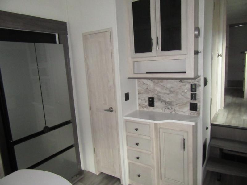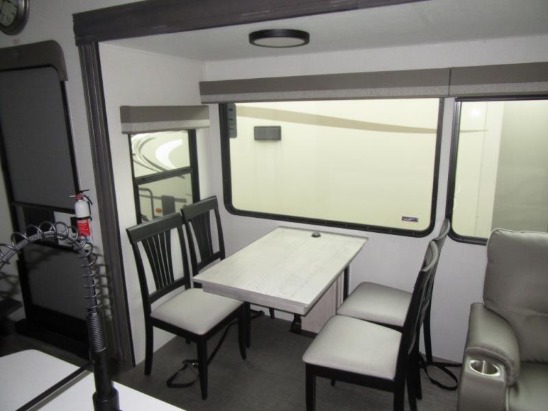 You will enjoy every adventure in this Sierra fifth wheel that is perfect for a couple that enjoys weekend or long term camping. This Sierra features triple slides for added space, a large kitchen island, plus a free standing dinette in the kitchen area which makes it feel a lot like home. When outside, you can enjoy being seated under the two power awnings with an LED light strip which is great for evening entertaining or relaxing. When it's time to get cleaned up and ready for bed, you will appreciate the spacious bath with a shower with a seat, a linen cabinet, and vanity/sink with a medicine cabinet as well. A front private bedroom with king bed slide will provide you with a great night's rest, and the large wardrobe has shelves for all your things. This model even has washer/dryer prep that will allow you to add a washer and dryer to make full-time easier than ever!