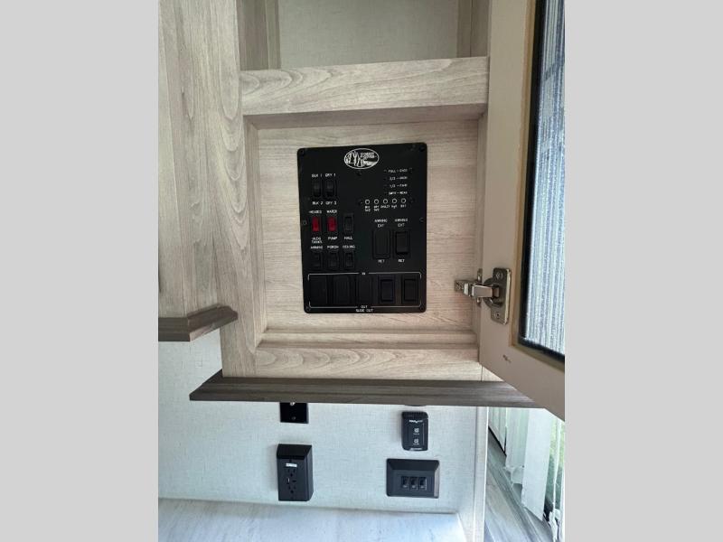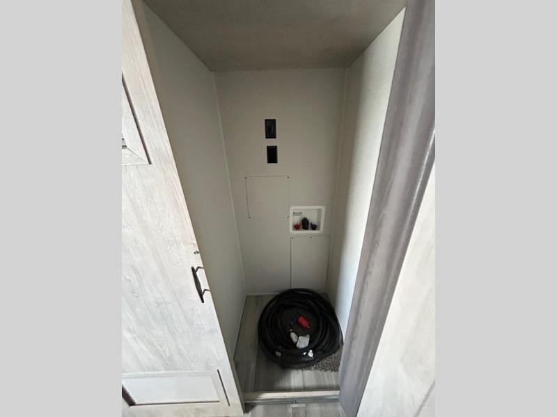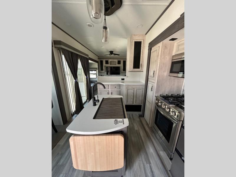 A separate rear living area with two hide-a-bed sofas allow you to invite the grandkids along on your next trip to your favorite destination. They will enjoy the 50" flat screen TV to watch a movie at night, and the theater seating will be perfect for you and your spouse to relax on during the day. The kitchen is packed with comfortable features, such as a kitchen island, a buffet counter for serving meals, plus additional counter space with overhead cabinets to store all your dishes. Since this model features five slides, you can relax with added space just like you do at home, and the patio door with sliding doors will let more sunshine in. The front private bedroom includes a king bed, a slide out wardrobe for all your clothes, plus a closet with washer and dryer prep if you want the option to go full-time!